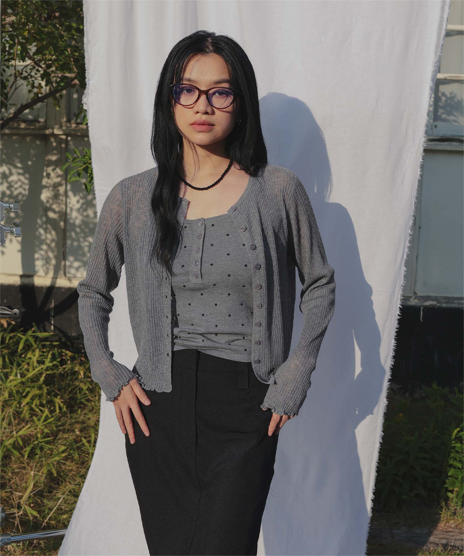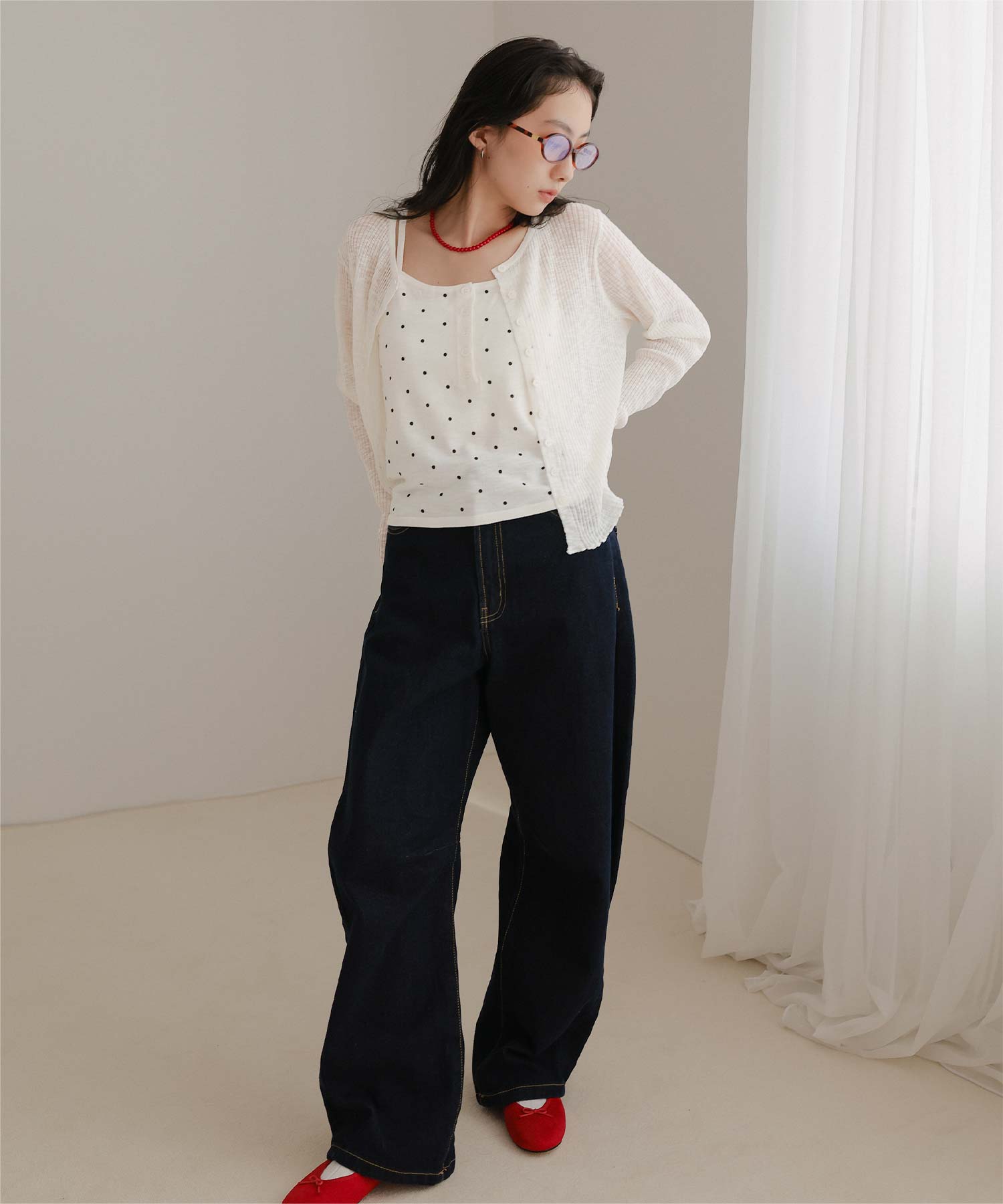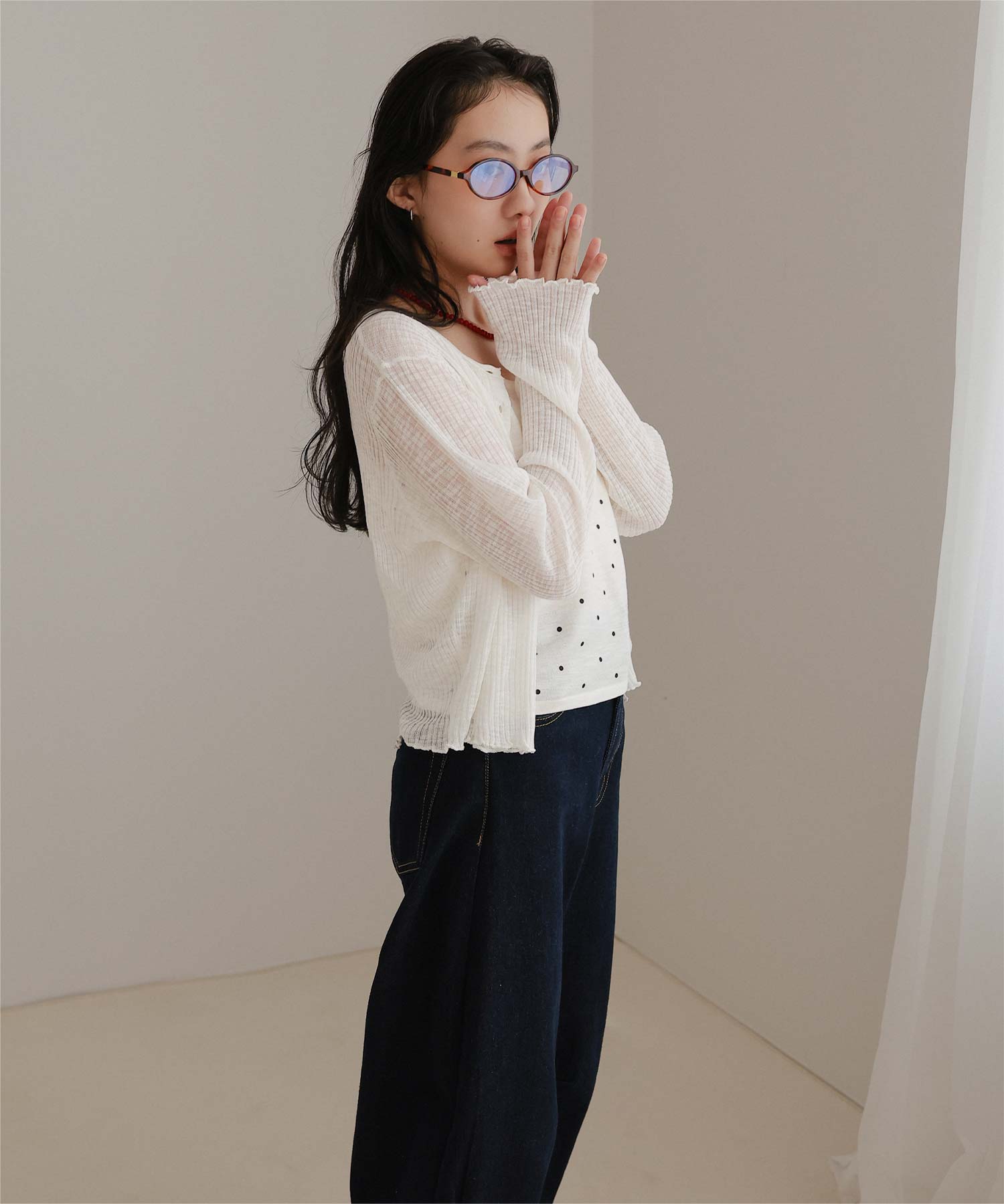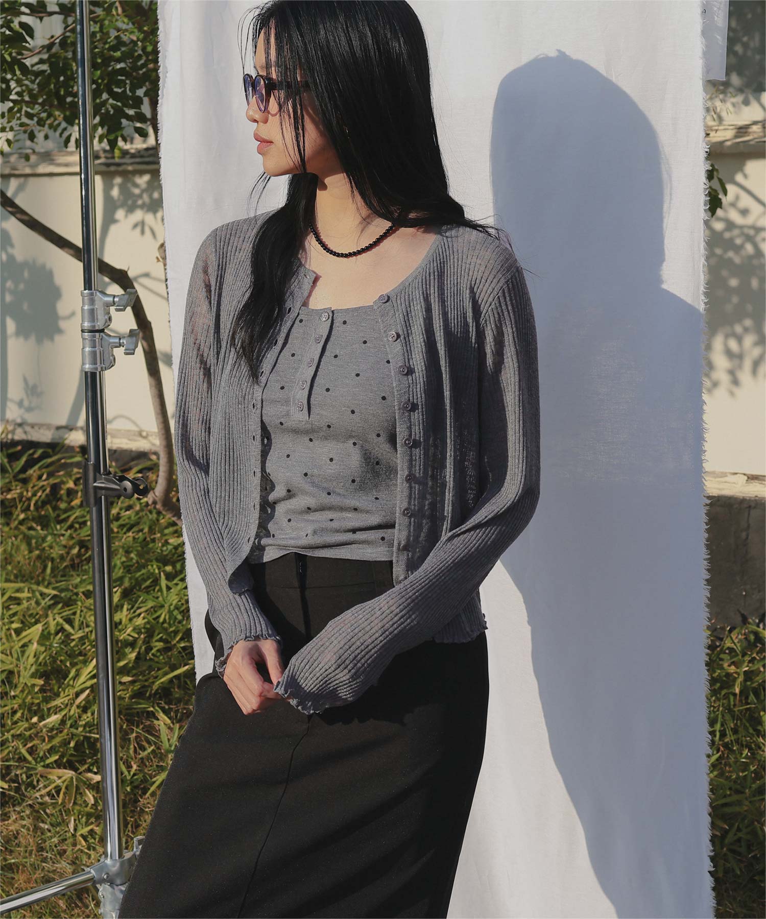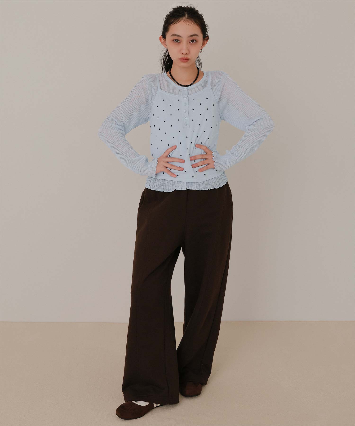 ・シアーな透け感が軽やかなカーディガンと、ドットプリントが可愛いキャミソールのセットアイテム