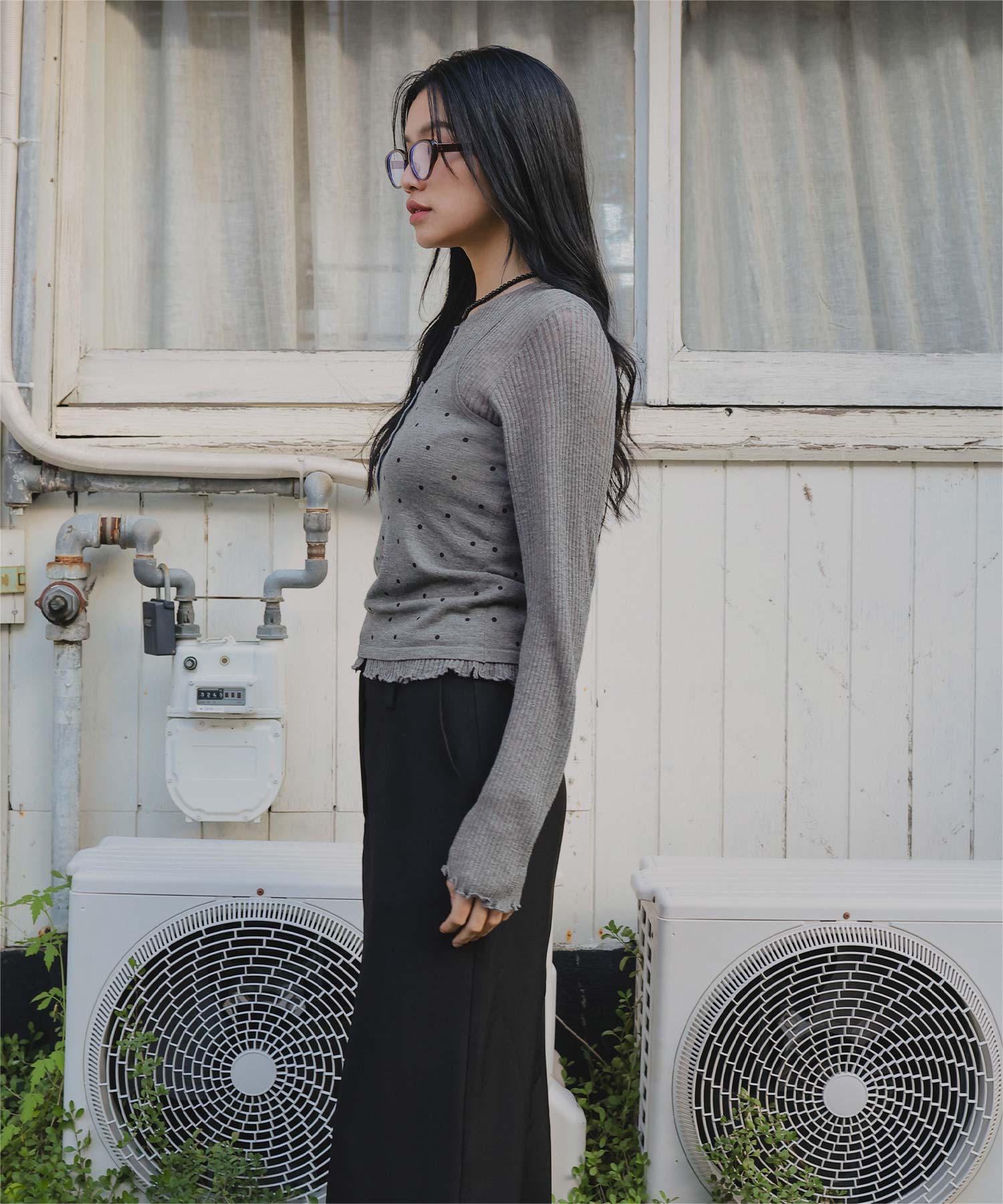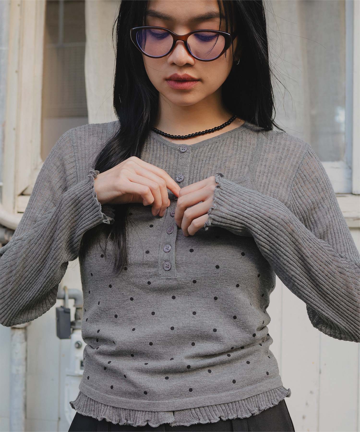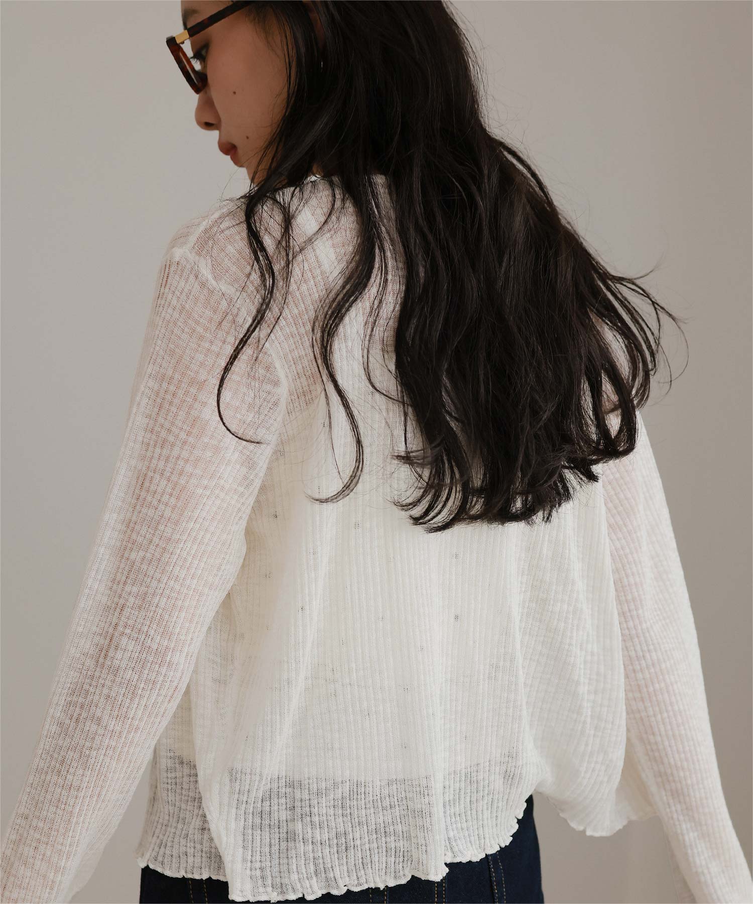 ・カーディガンは袖口と裾のメロー仕上げがポイントで、女性らしい印象に