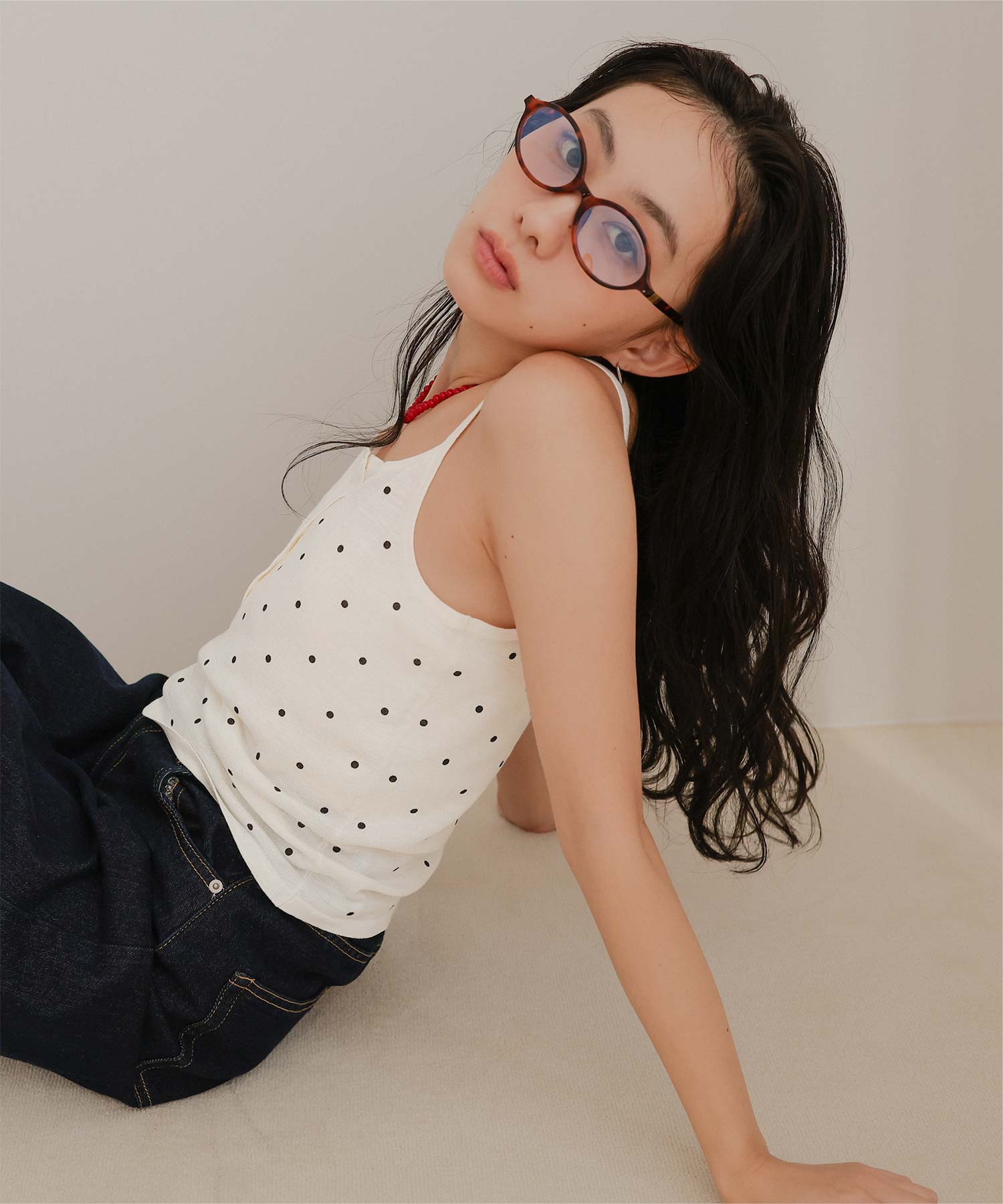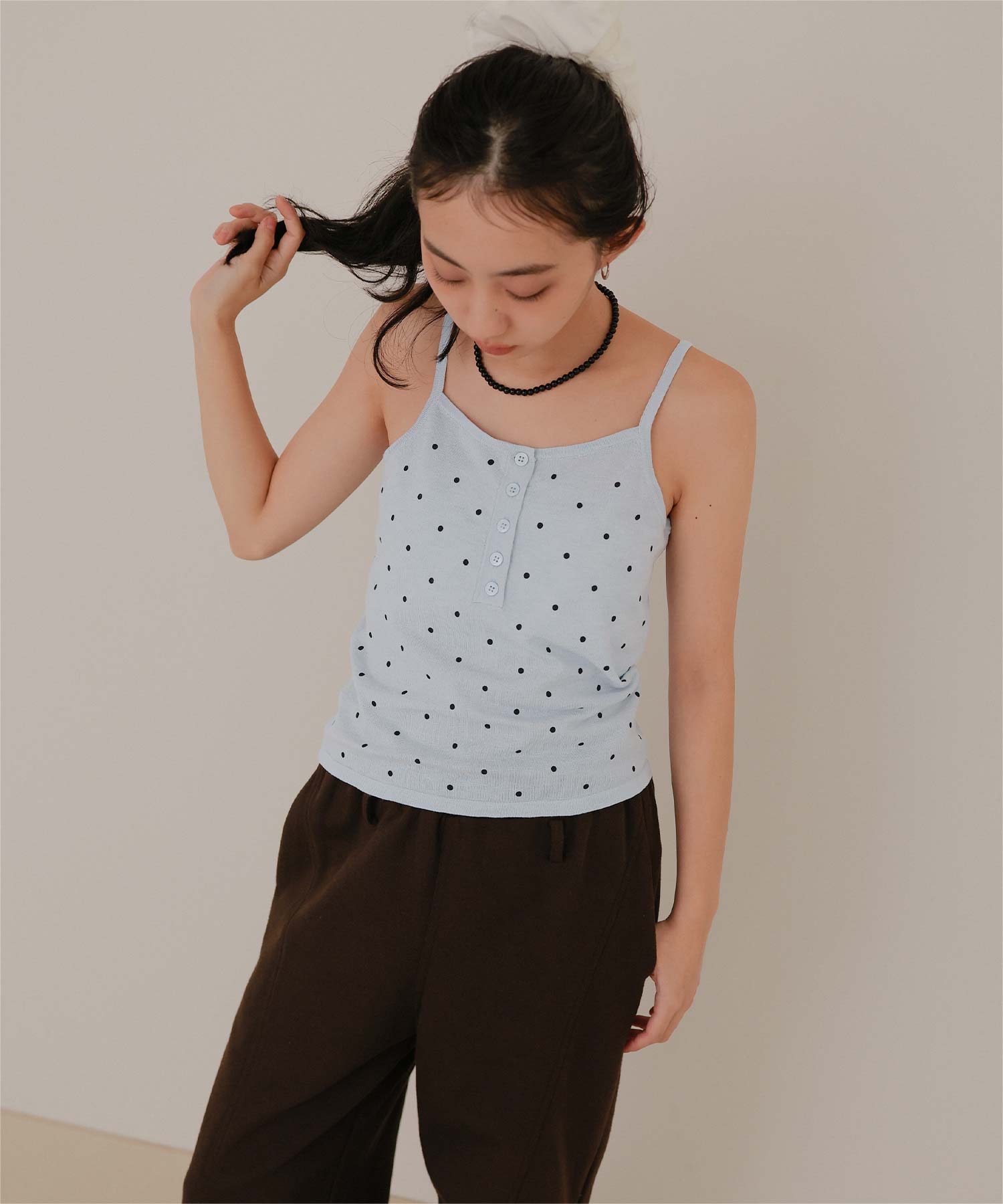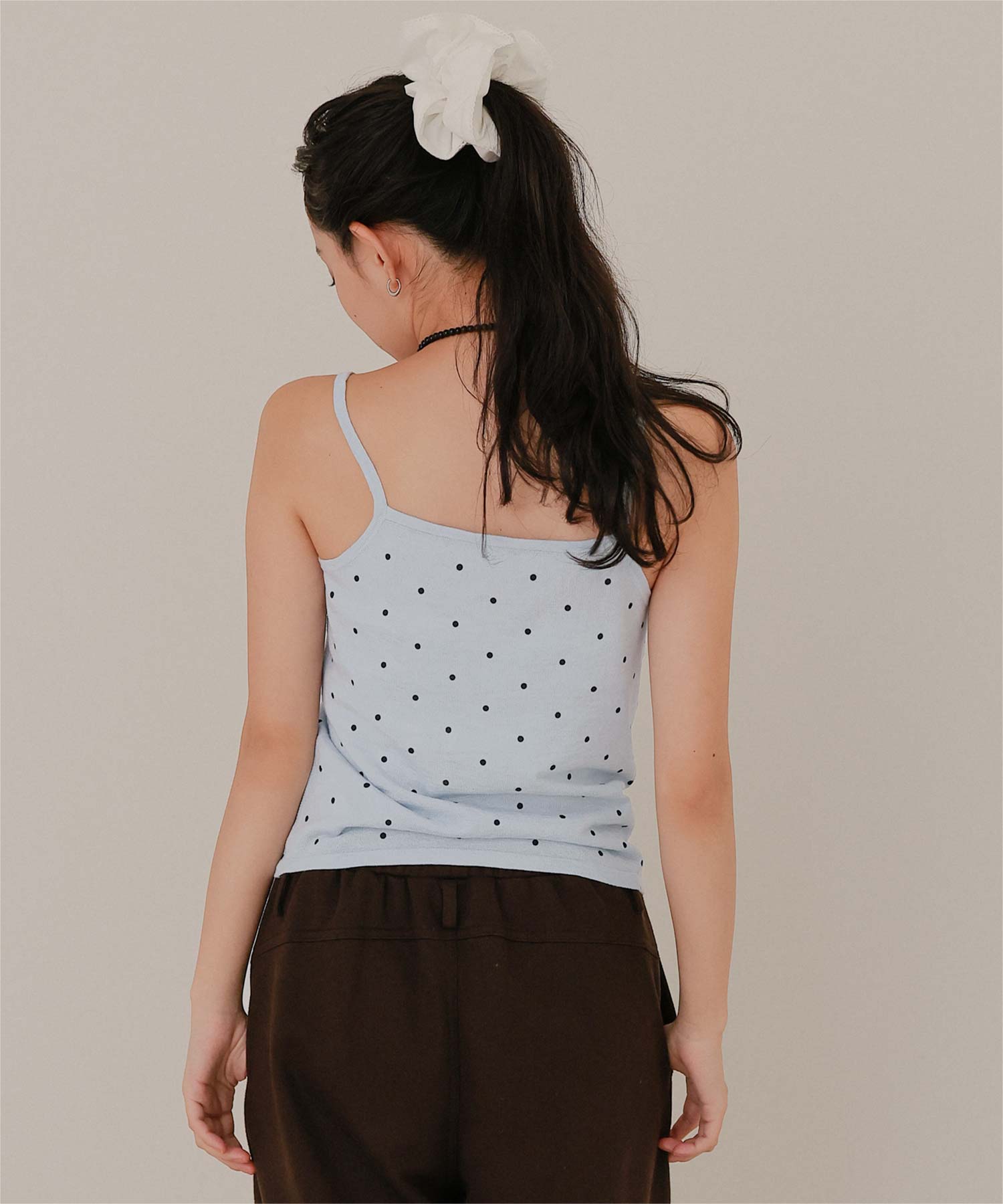 ・トレンド感のあるドット柄プリントに前立てデザインがポイントのキャミソール