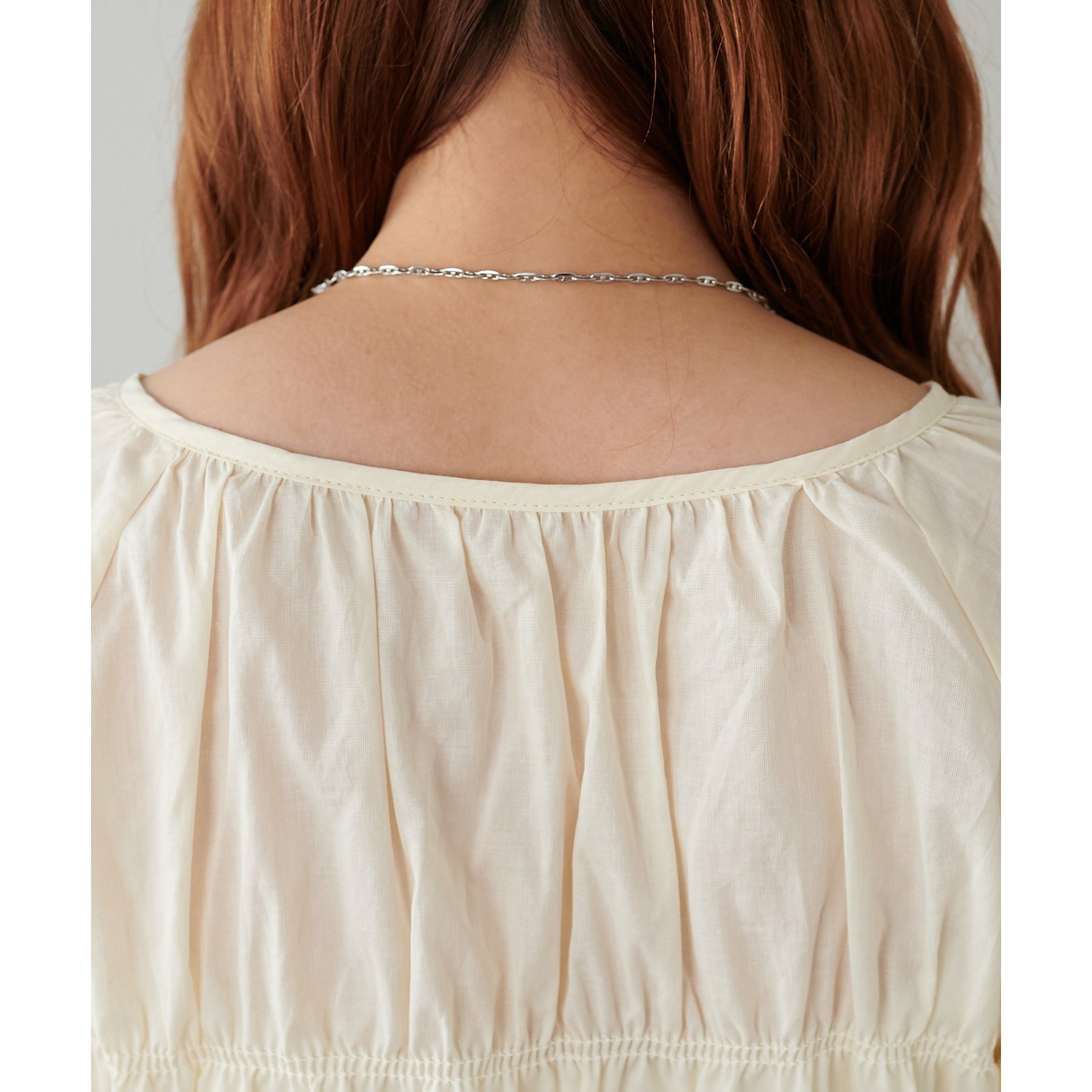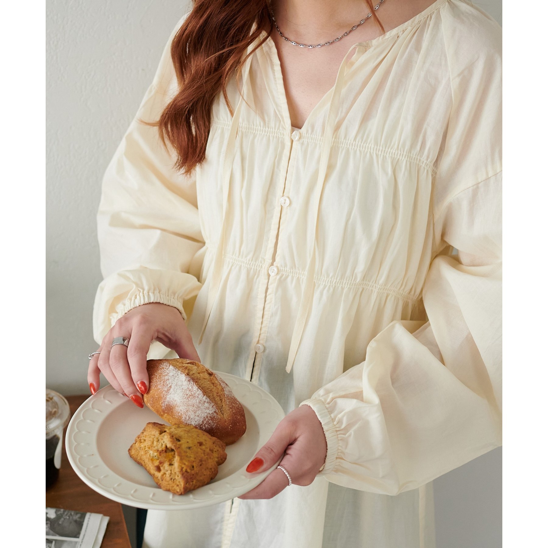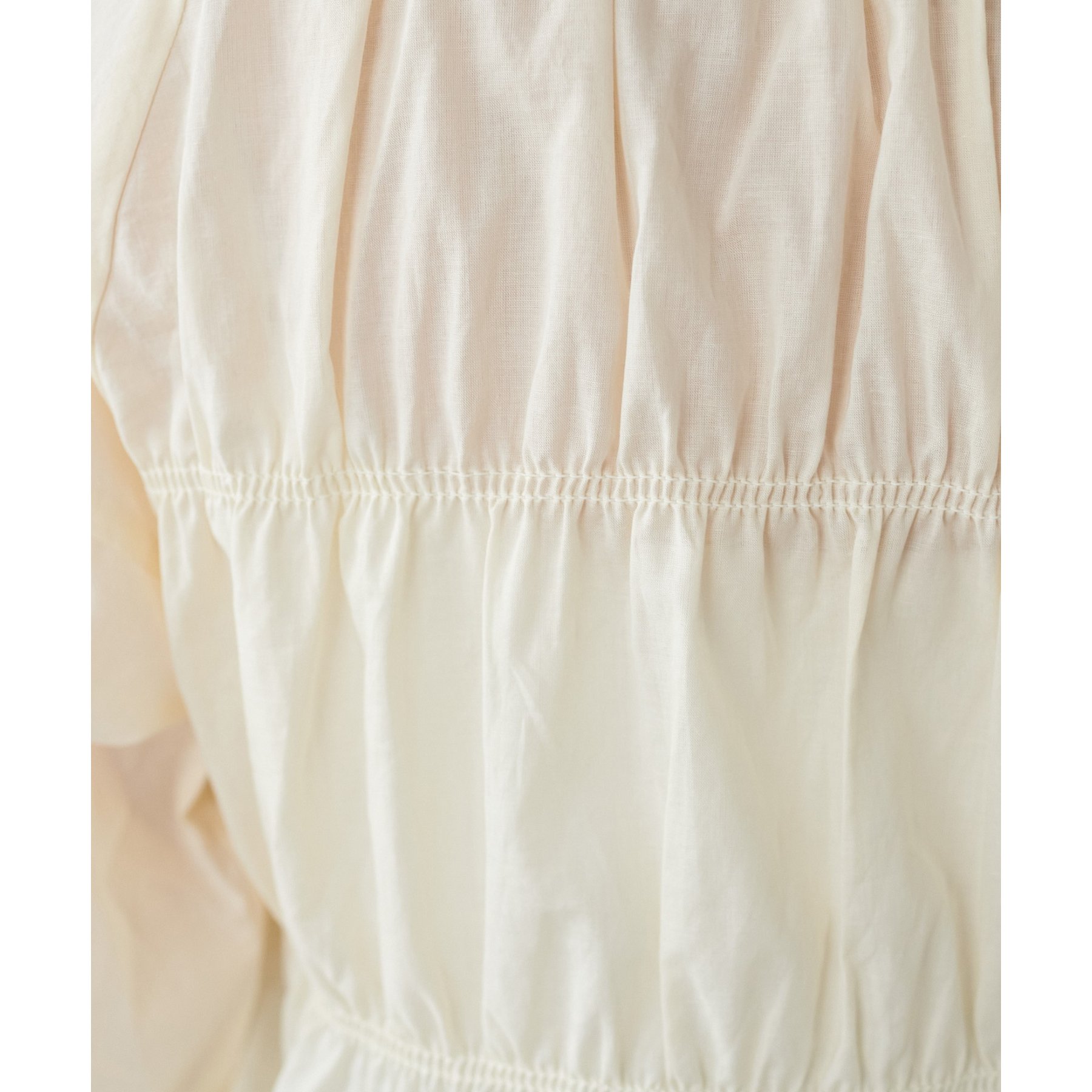 胸元からウエストにかけて細やかなギャザーを寄せることで、立体感のあるシルエットに。