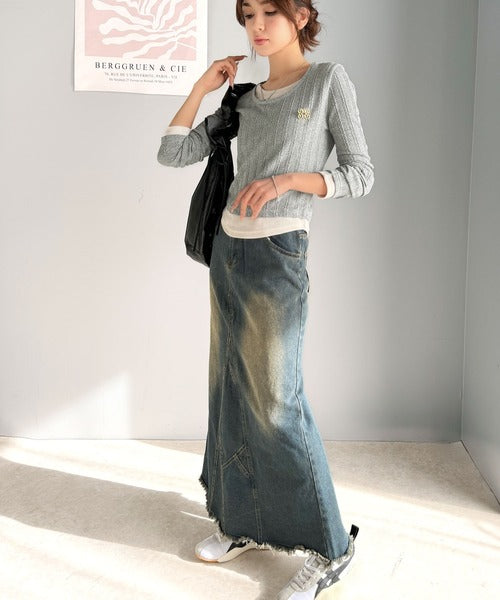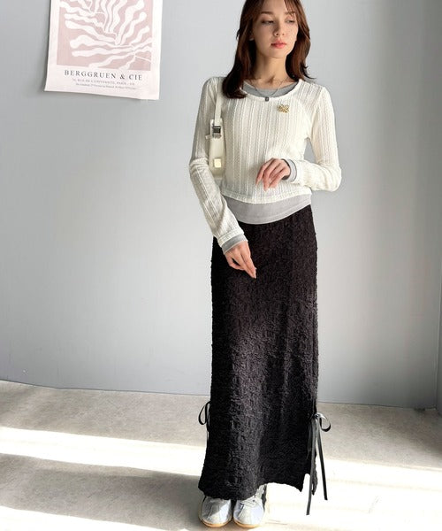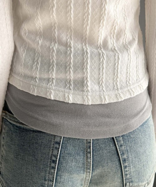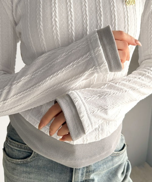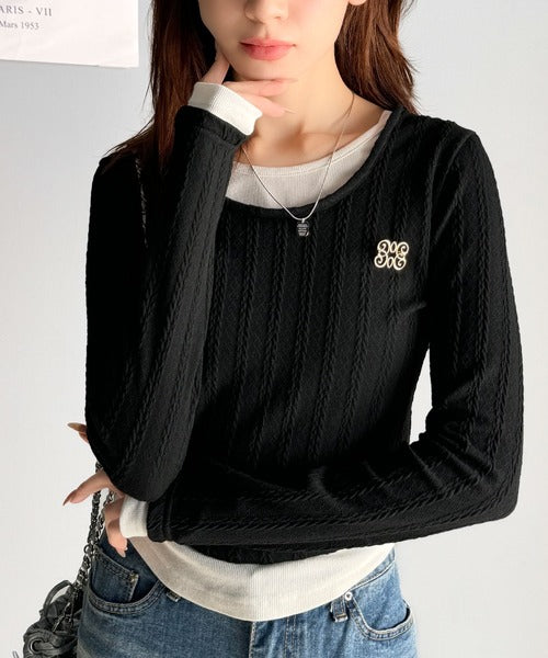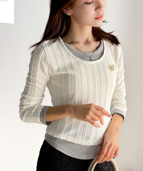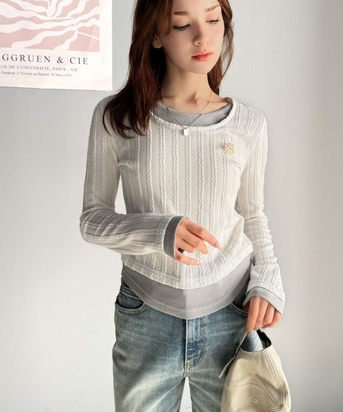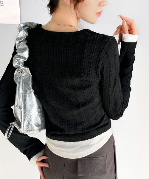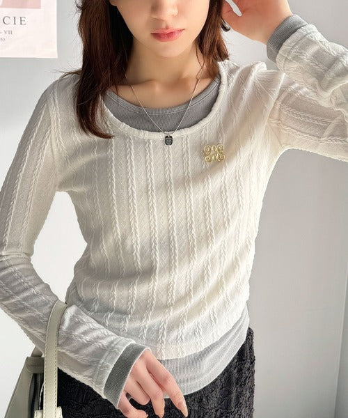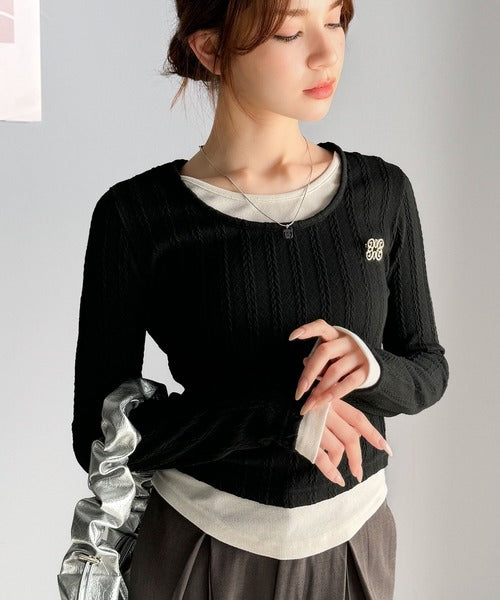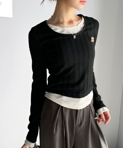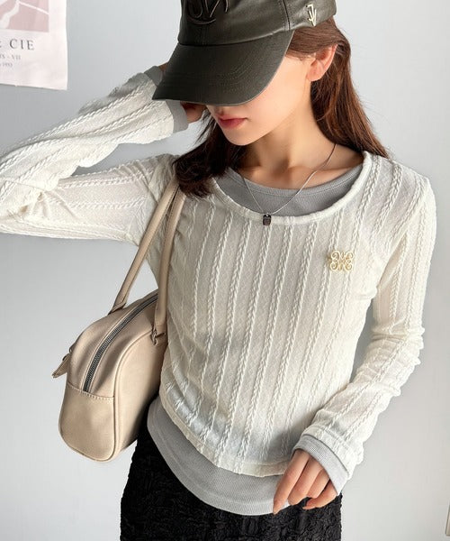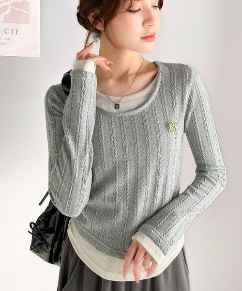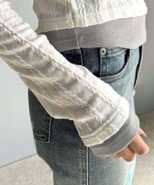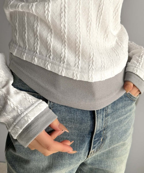 ・ケーブル編み風ふくれジャカード素材とテレコリブ素材の重ね着風