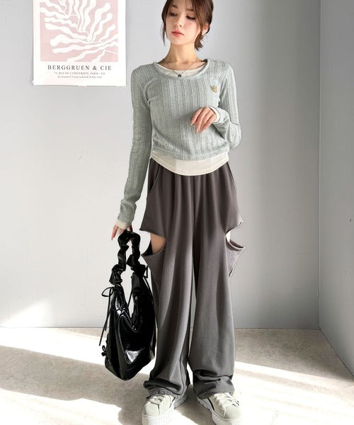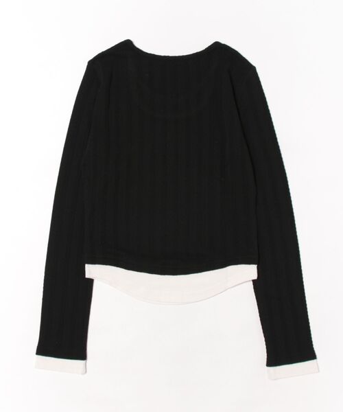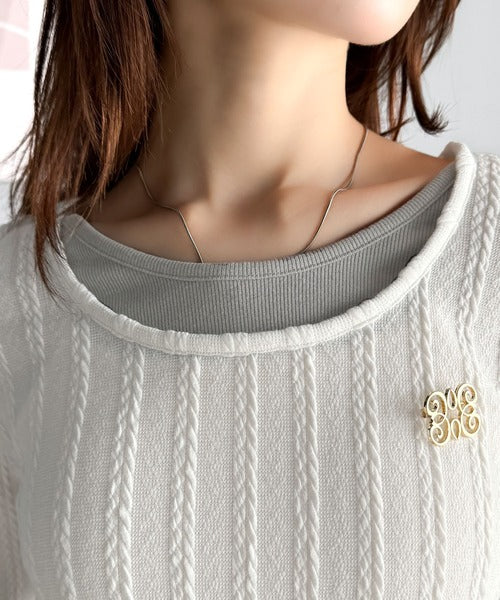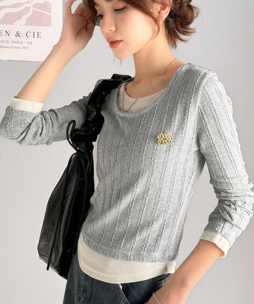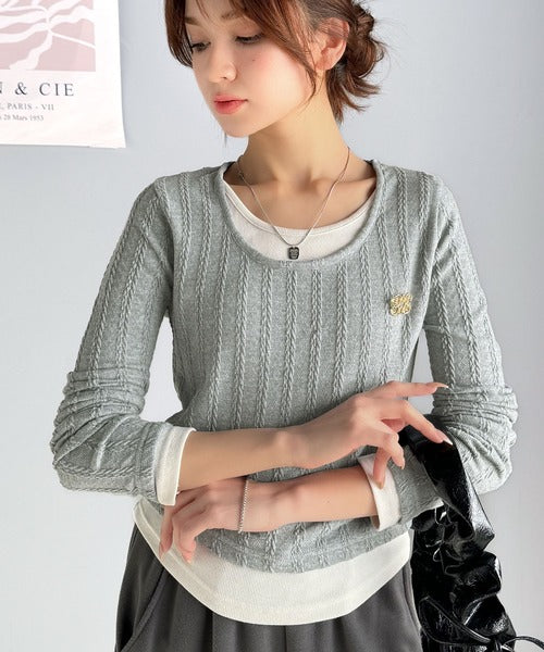 【mily bilet】トレンド感満載のドッキングデザイン。ブローチ付き異素材レイヤード風ケーブル編みカットソー(長袖) mi1359010