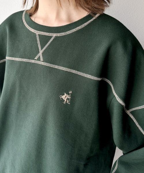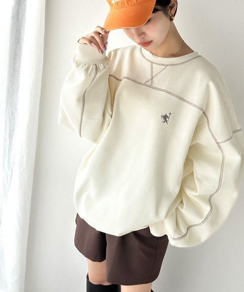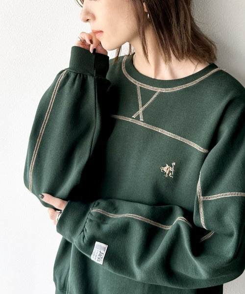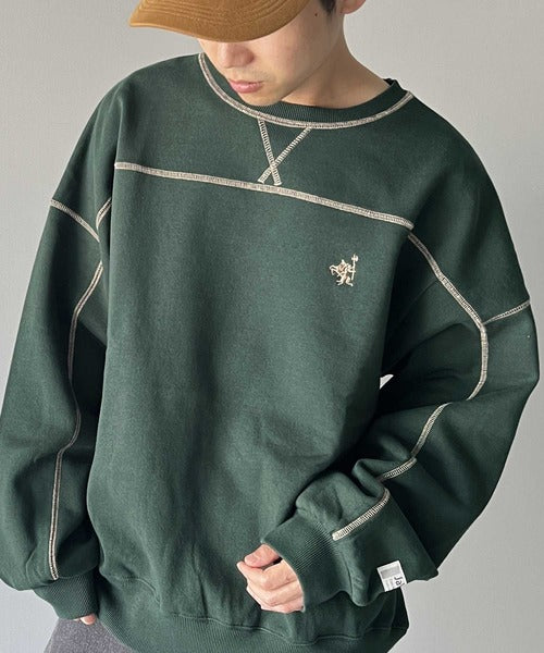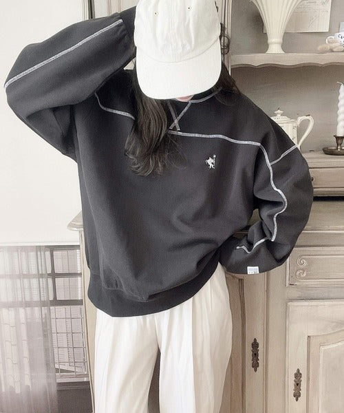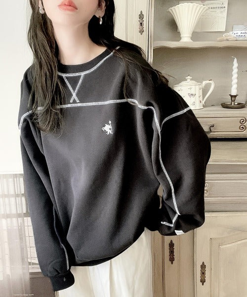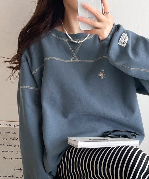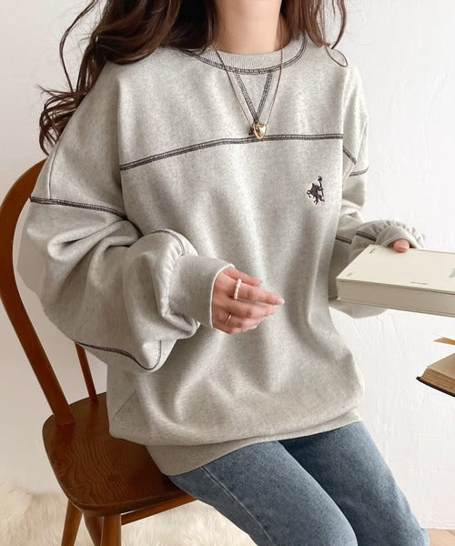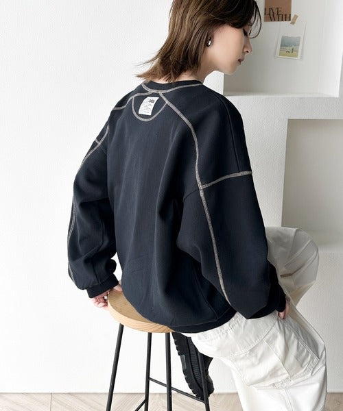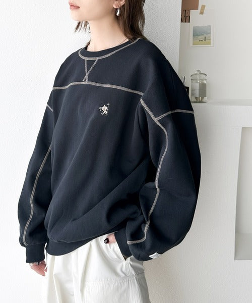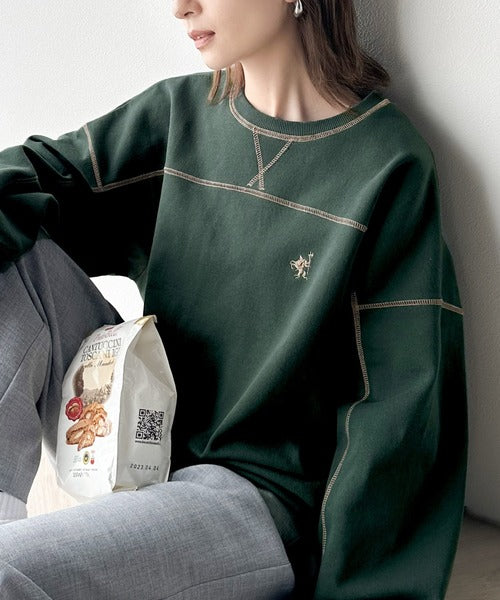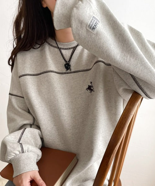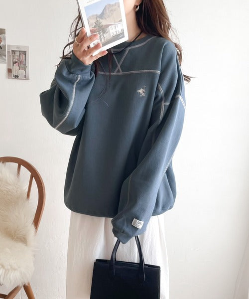 配色ステッチがお洒落な裏起毛スウェットプルオーバー。