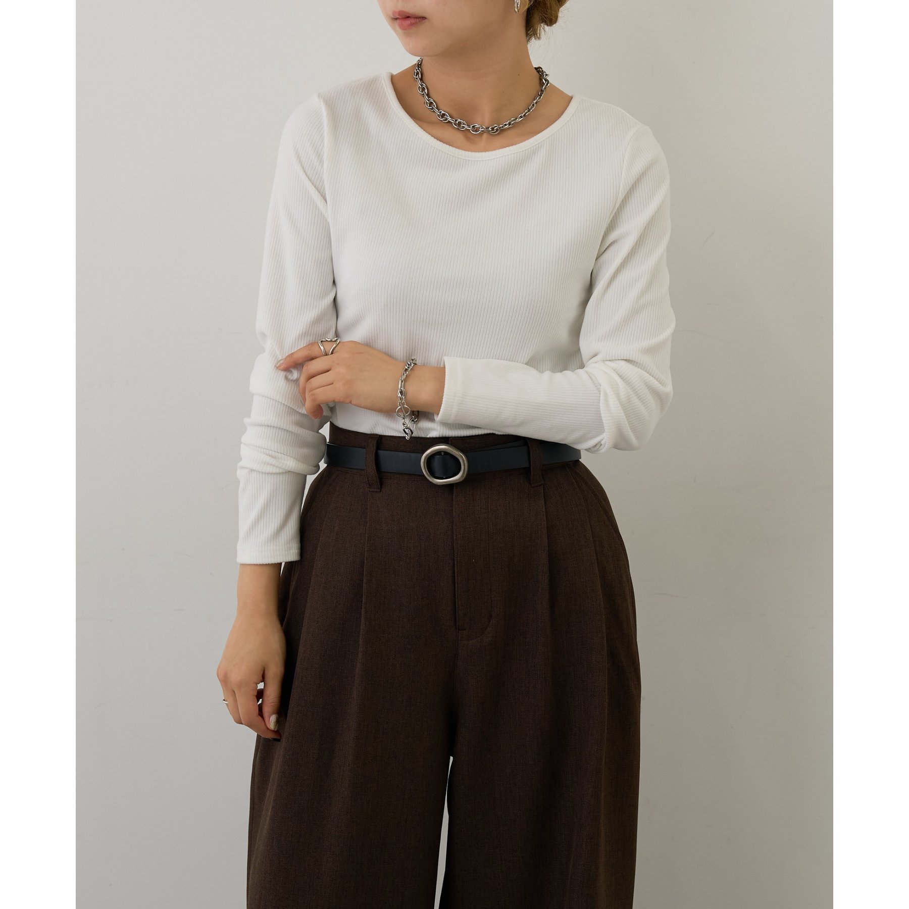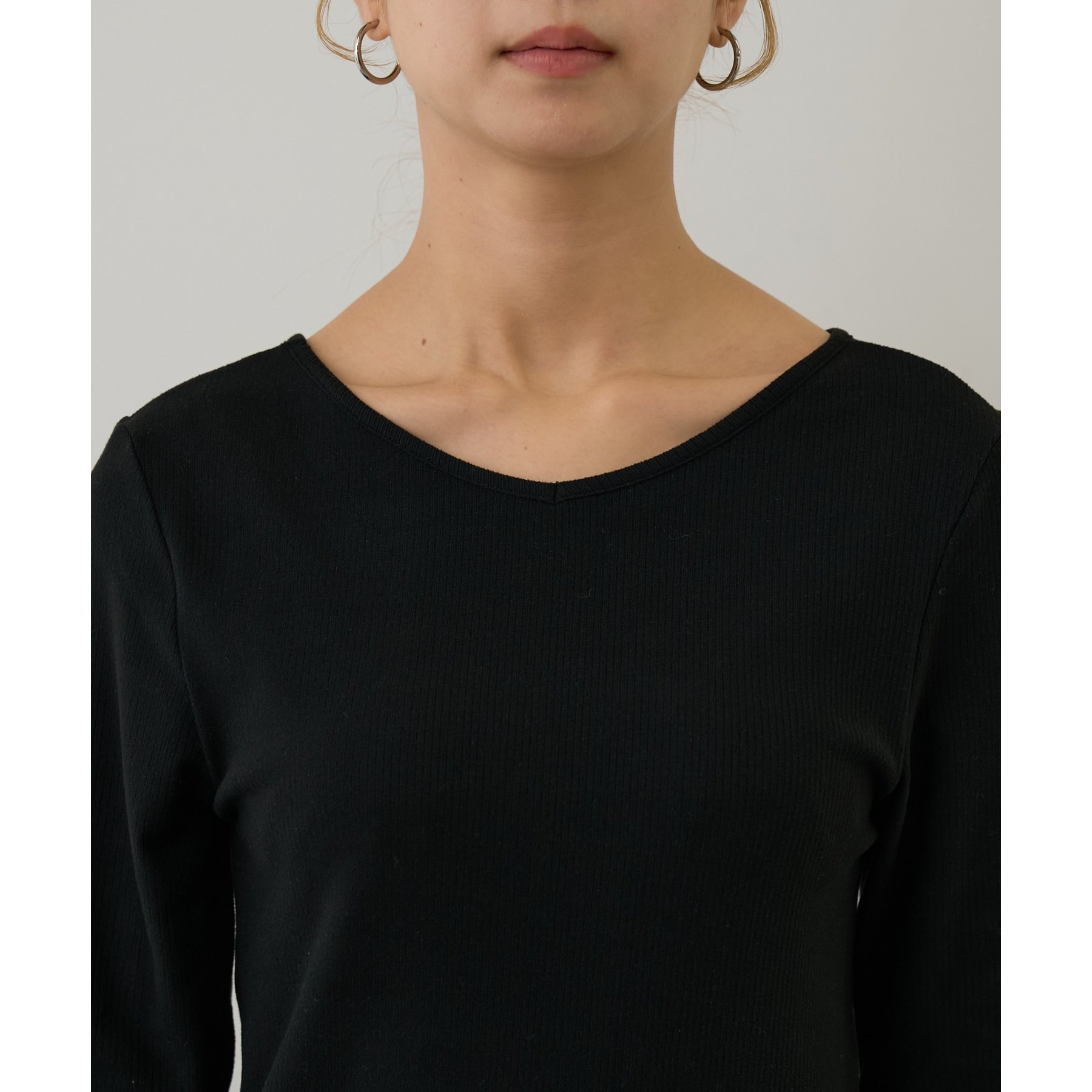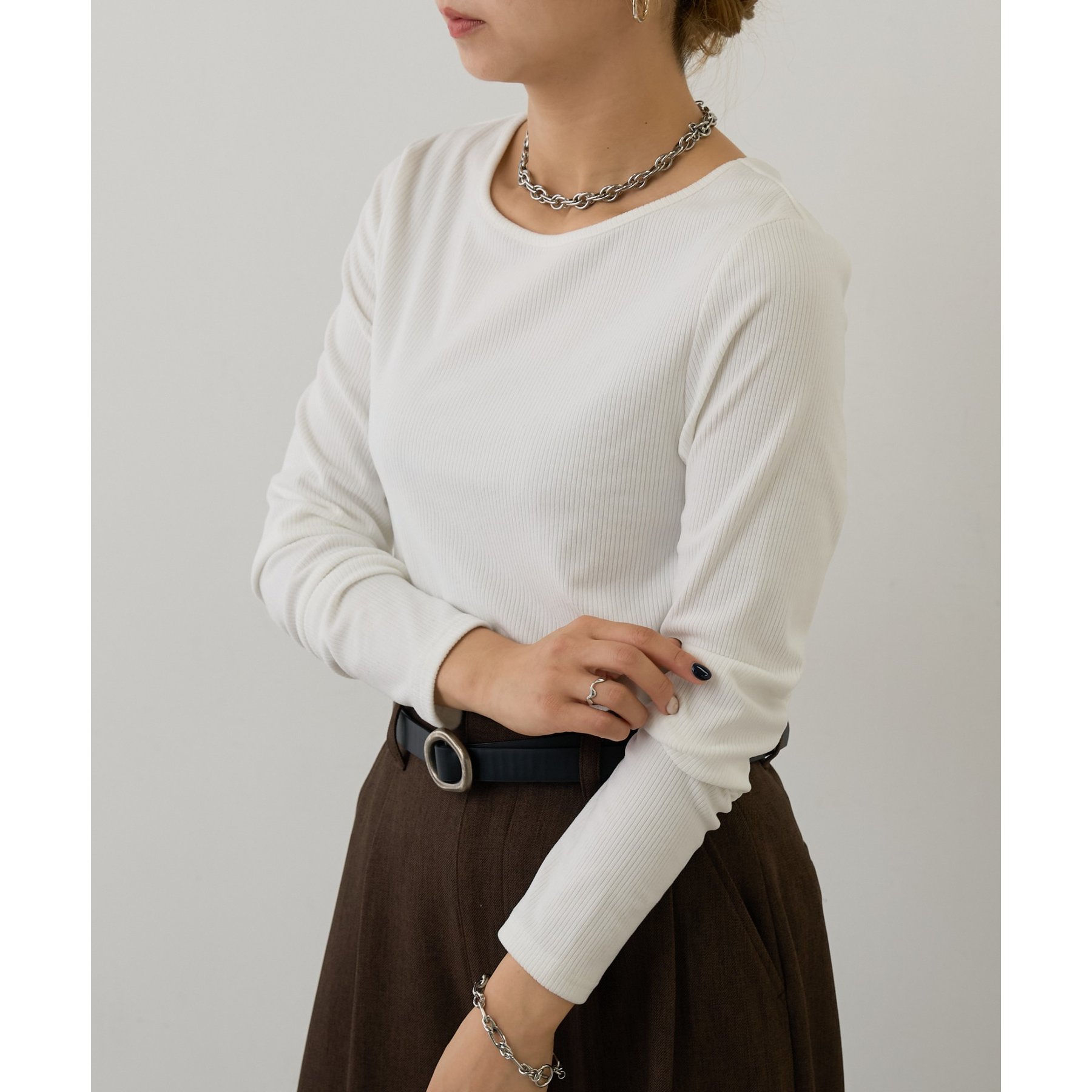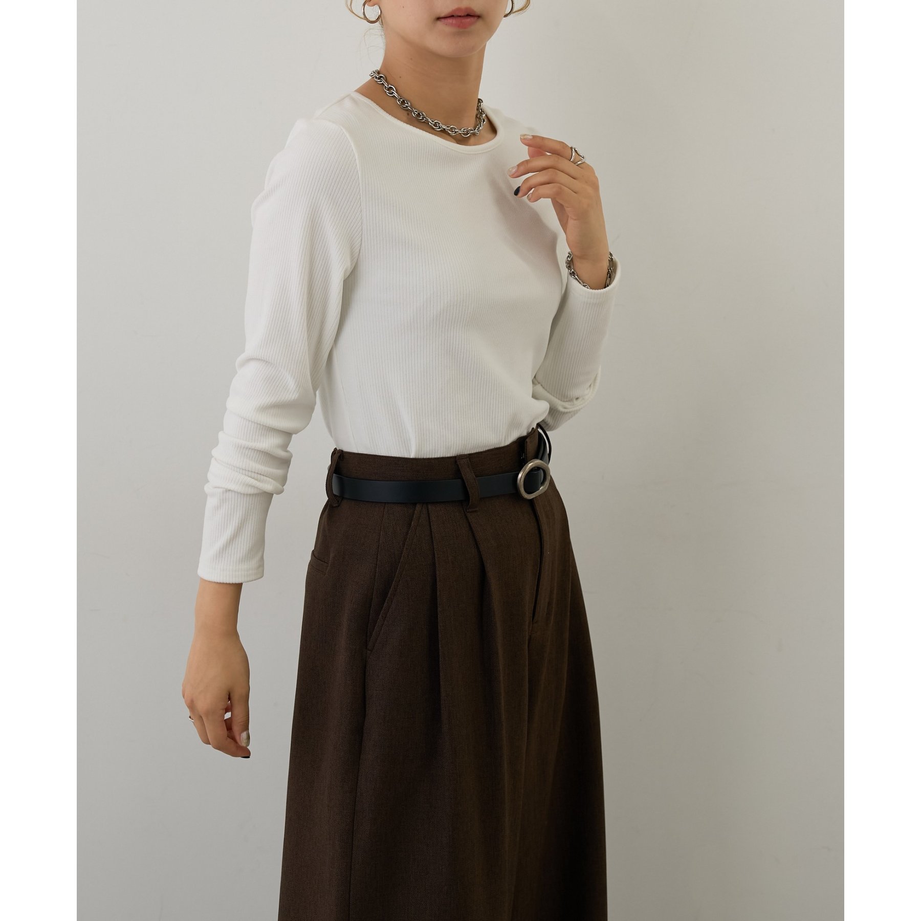滑らかで柔らかい着心地を体感でき、体のラインに沿ったシルエットで着痩せ見えが叶う一枚です◎