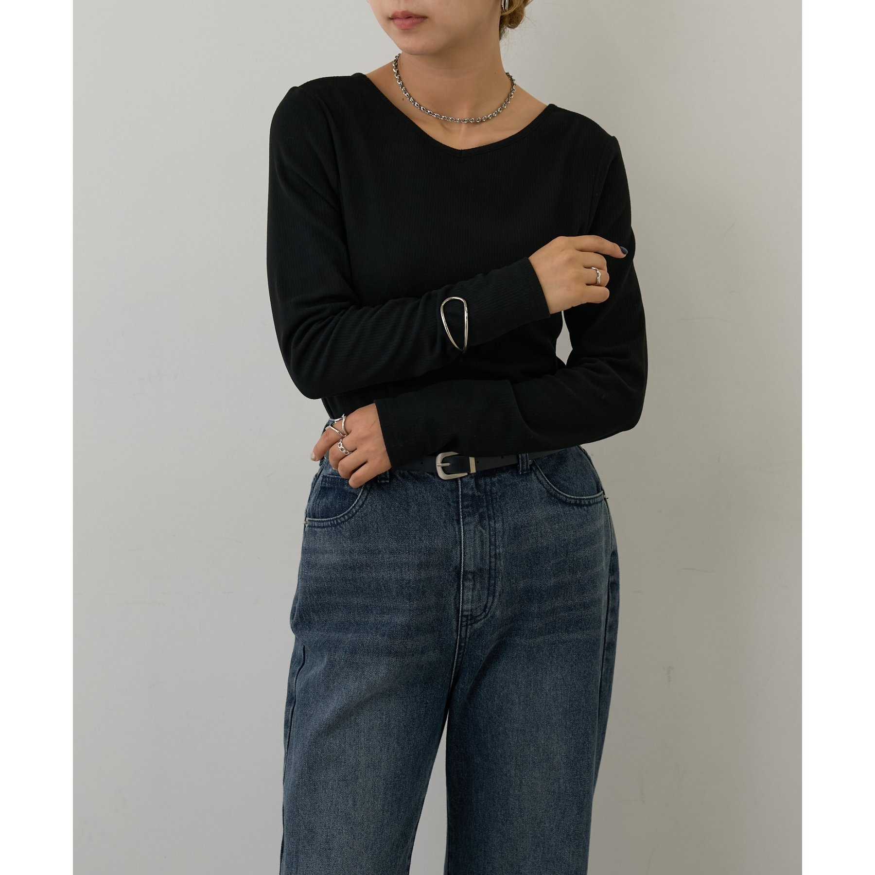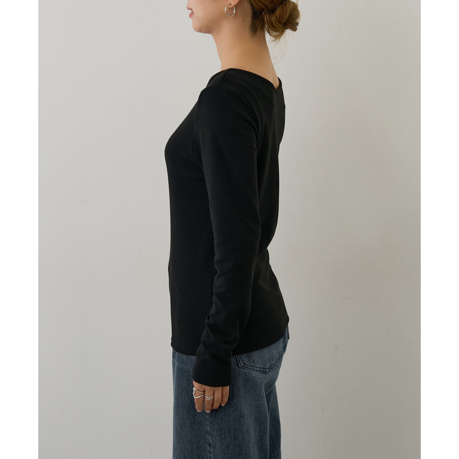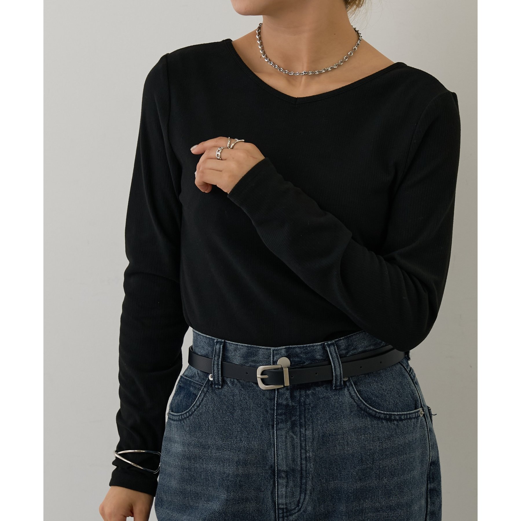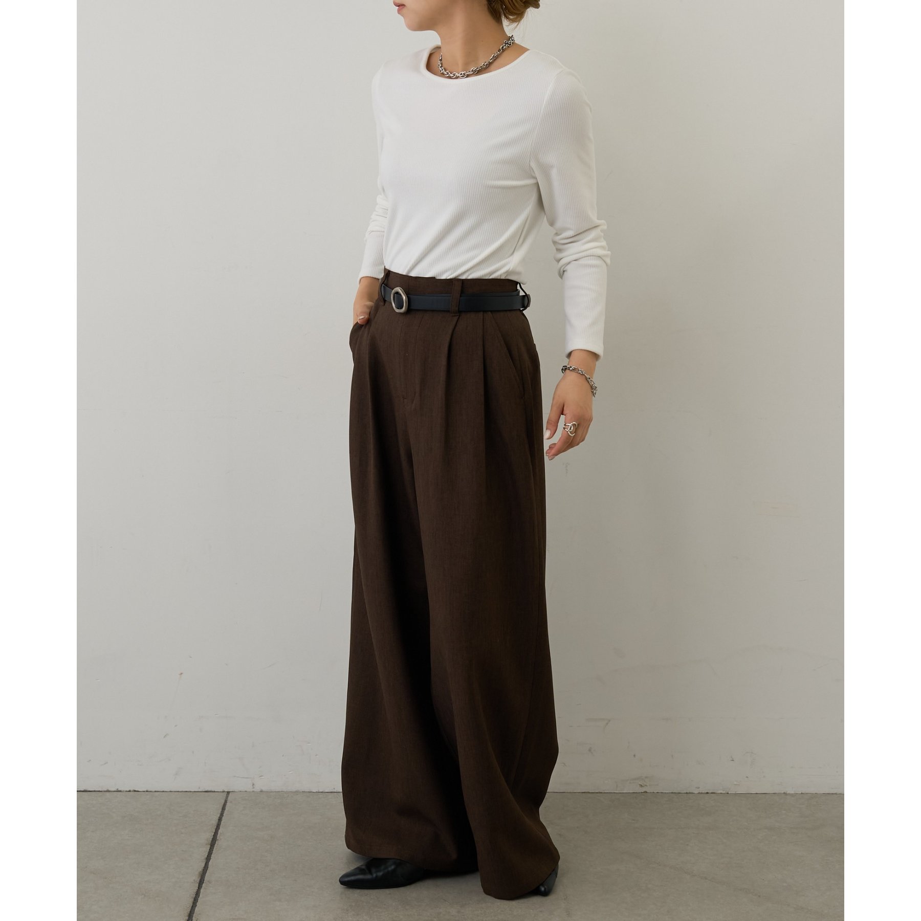 滑らかで柔らかい着心地を体感でき、体のラインに沿ったシルエットで着痩せ見えが叶う一枚です◎