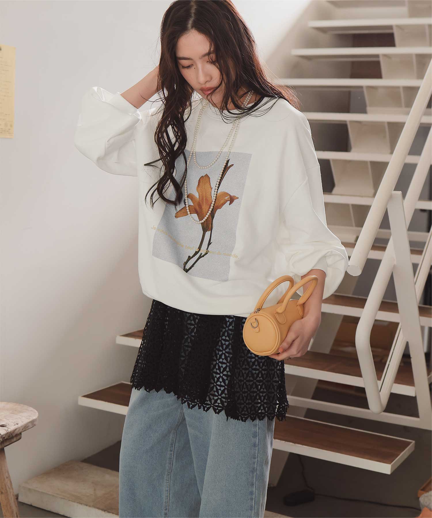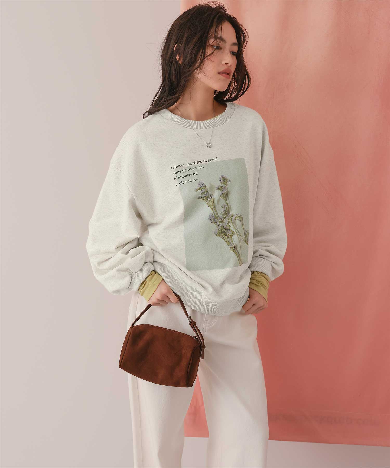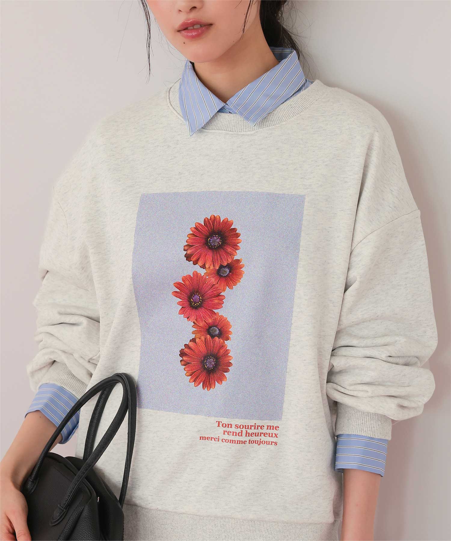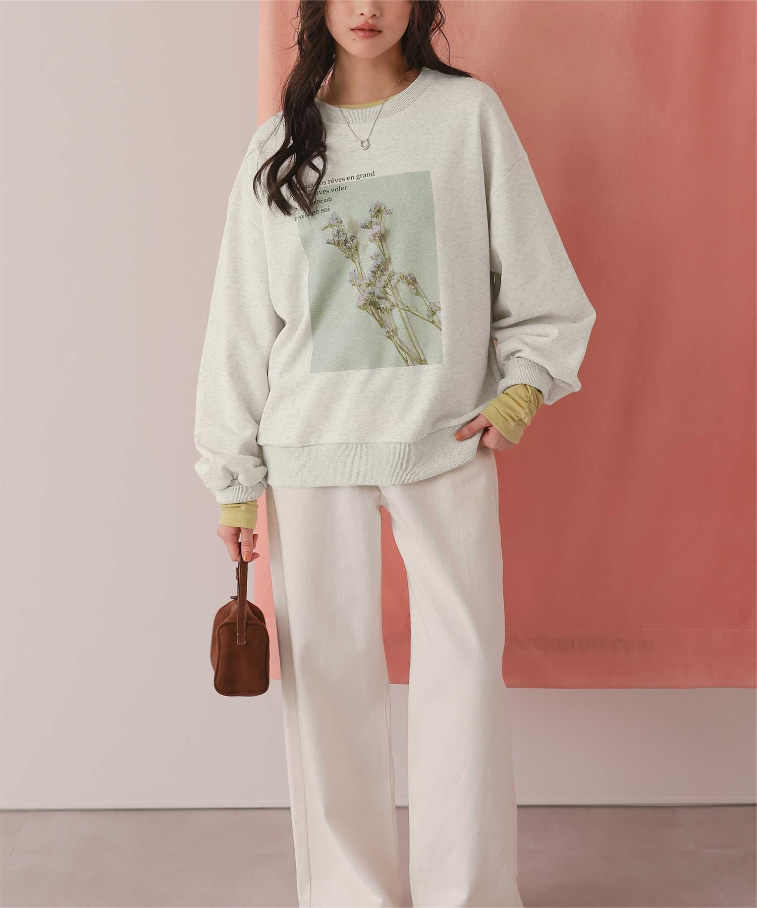 ・フロントに施した花のフォトアートプリントが、スタイリングにやわらかな個性をプラス