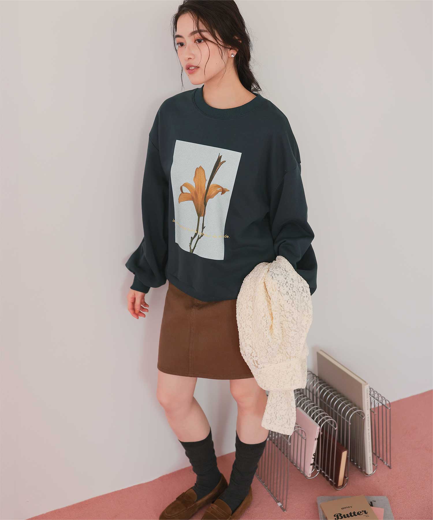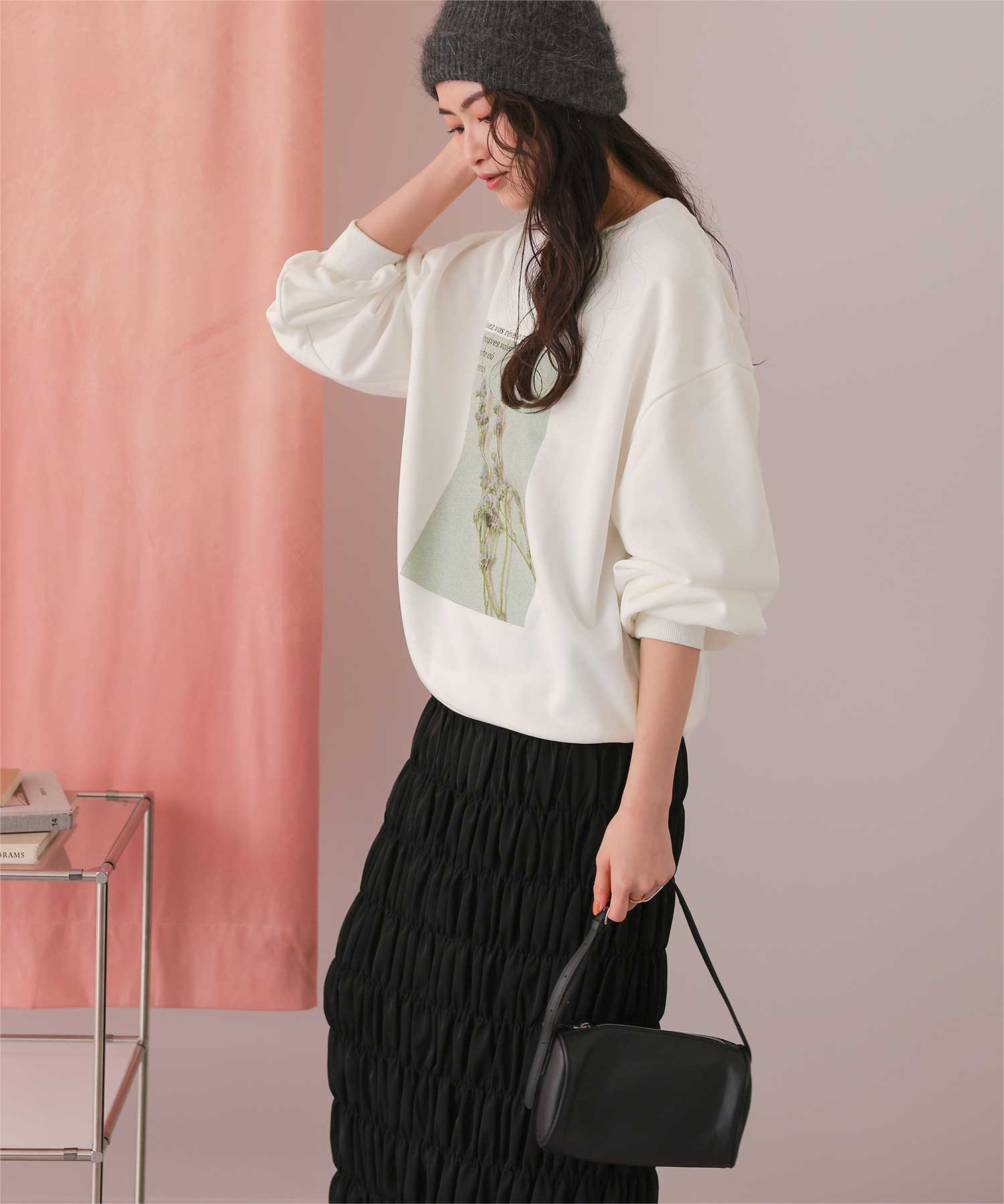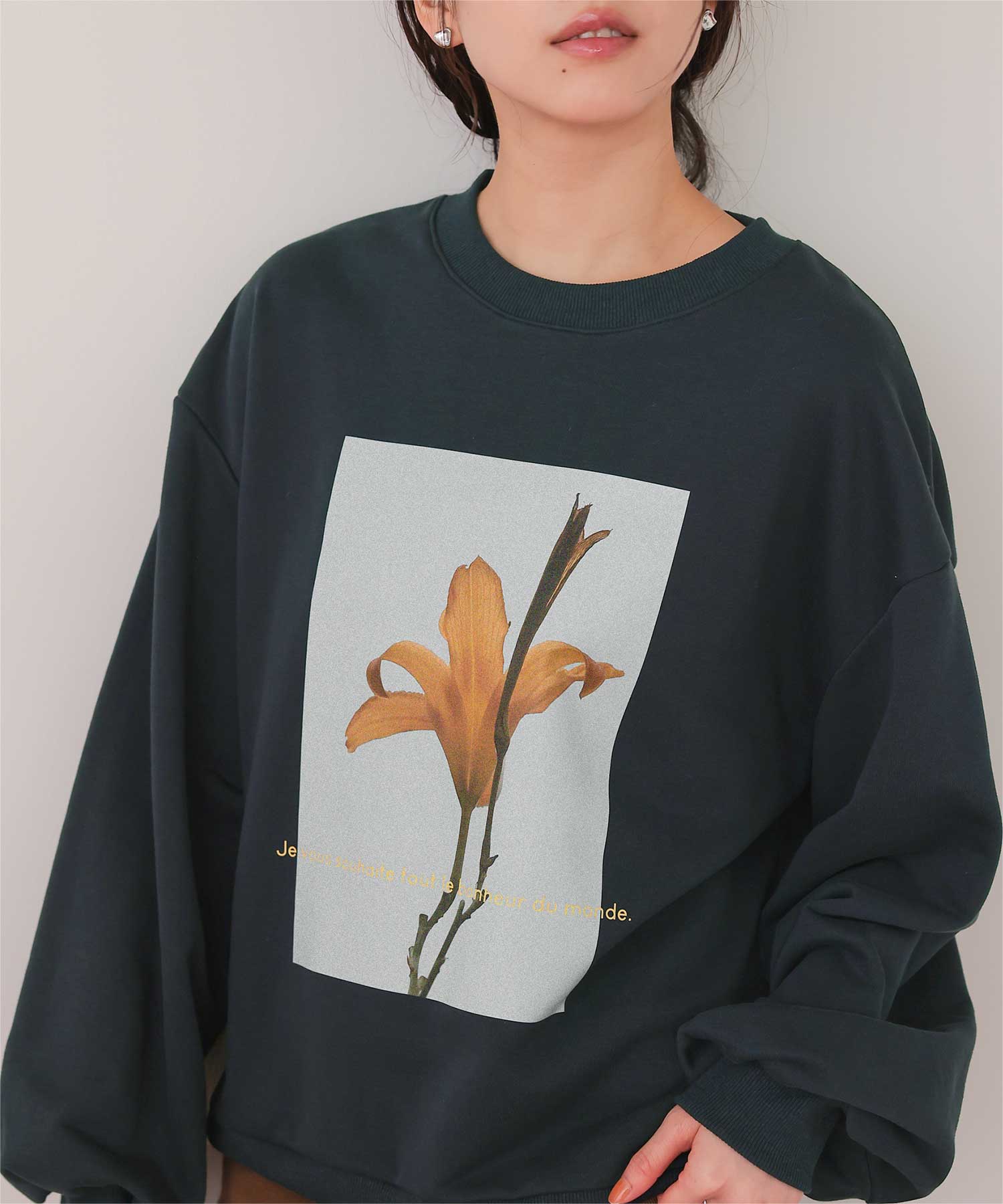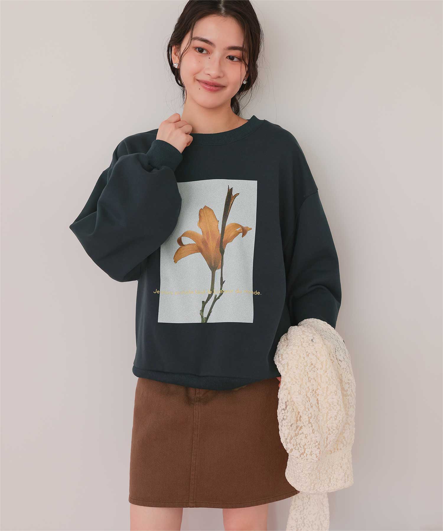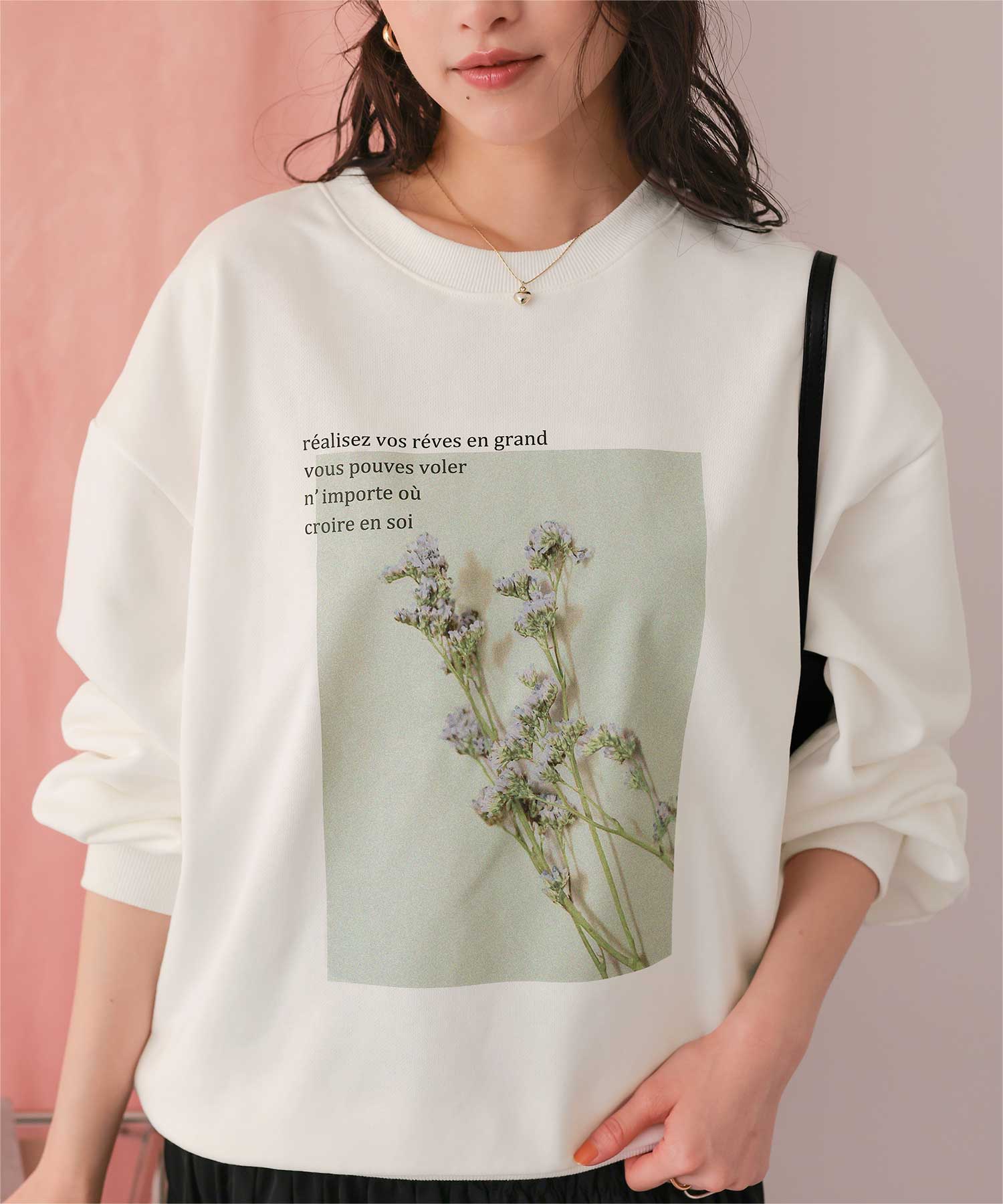 ・フロントに施した花のフォトアートプリントが、スタイリングにやわらかな個性をプラス