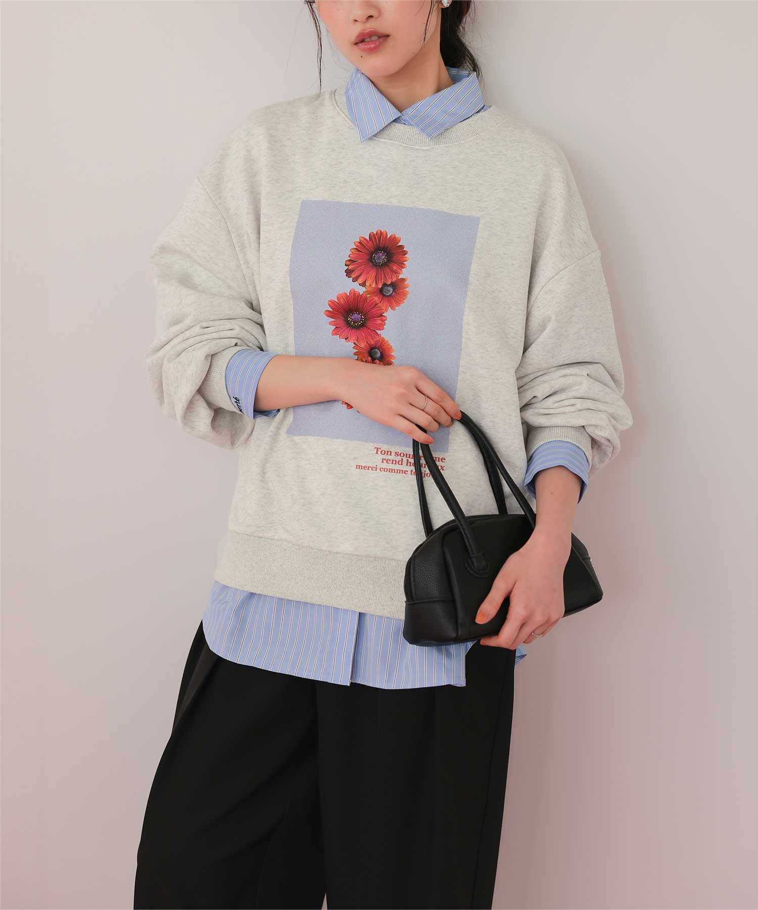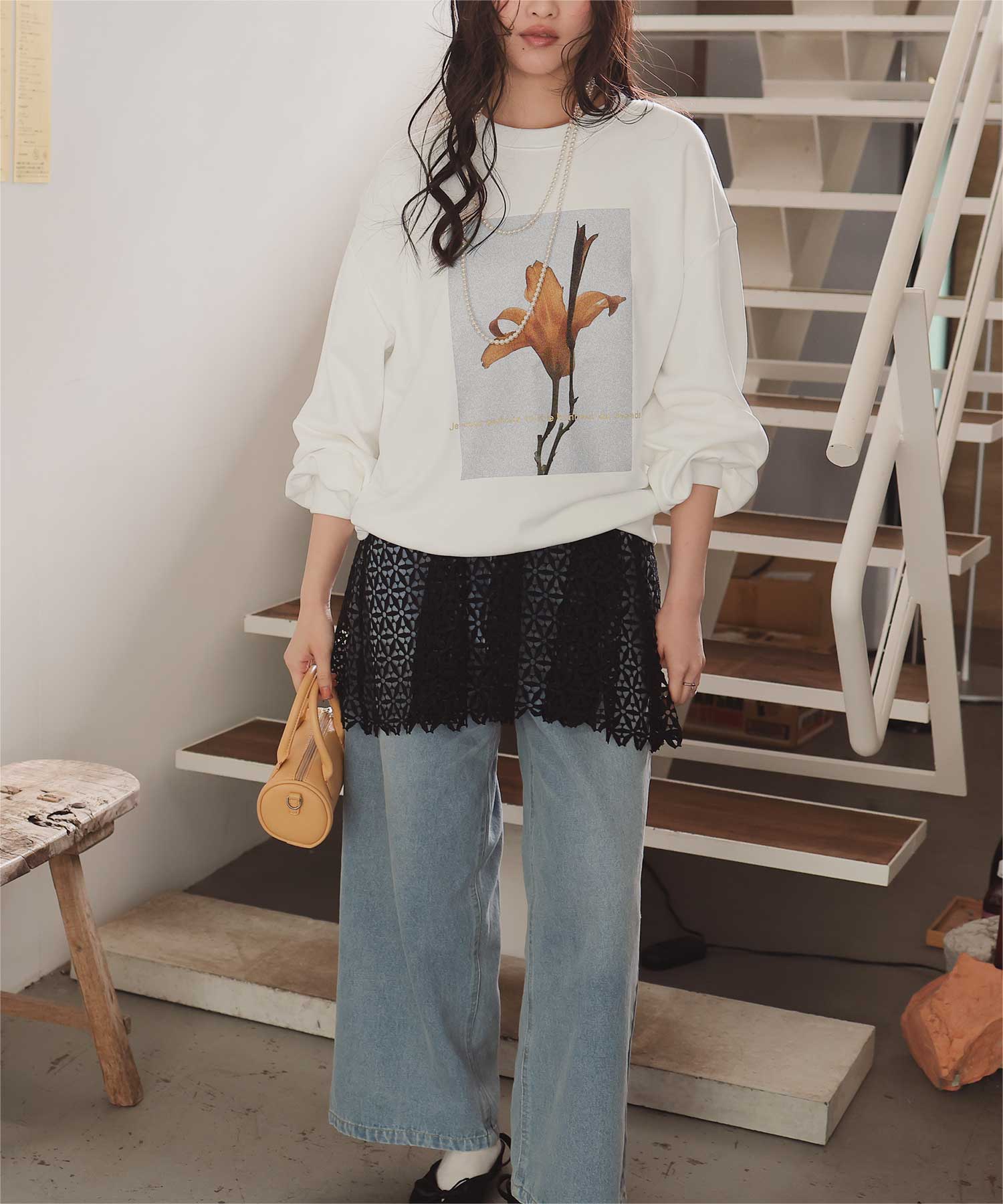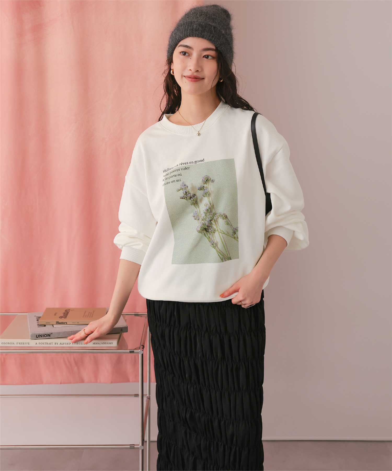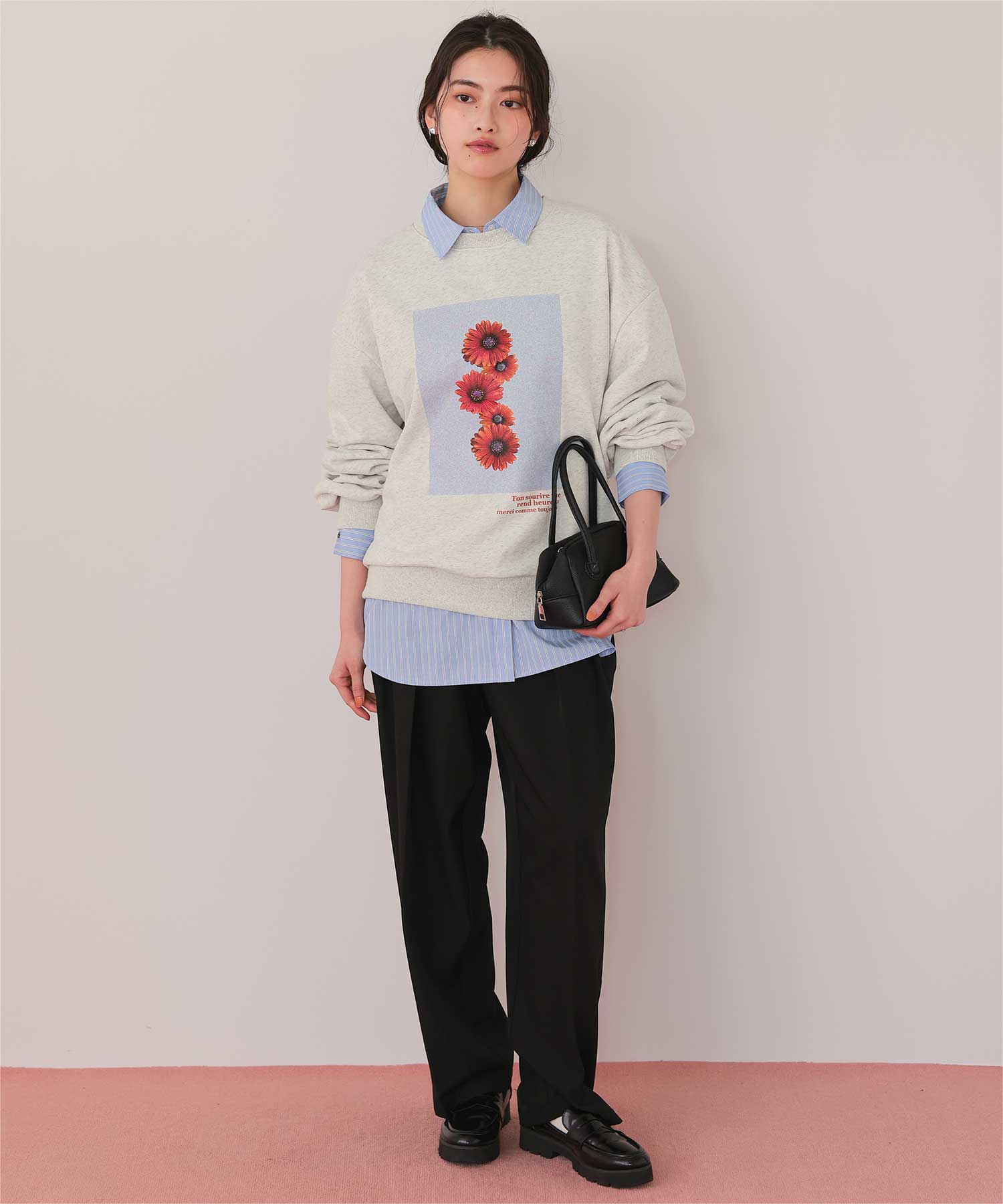 ・フロントに施した花のフォトアートプリントが、スタイリングにやわらかな個性をプラス