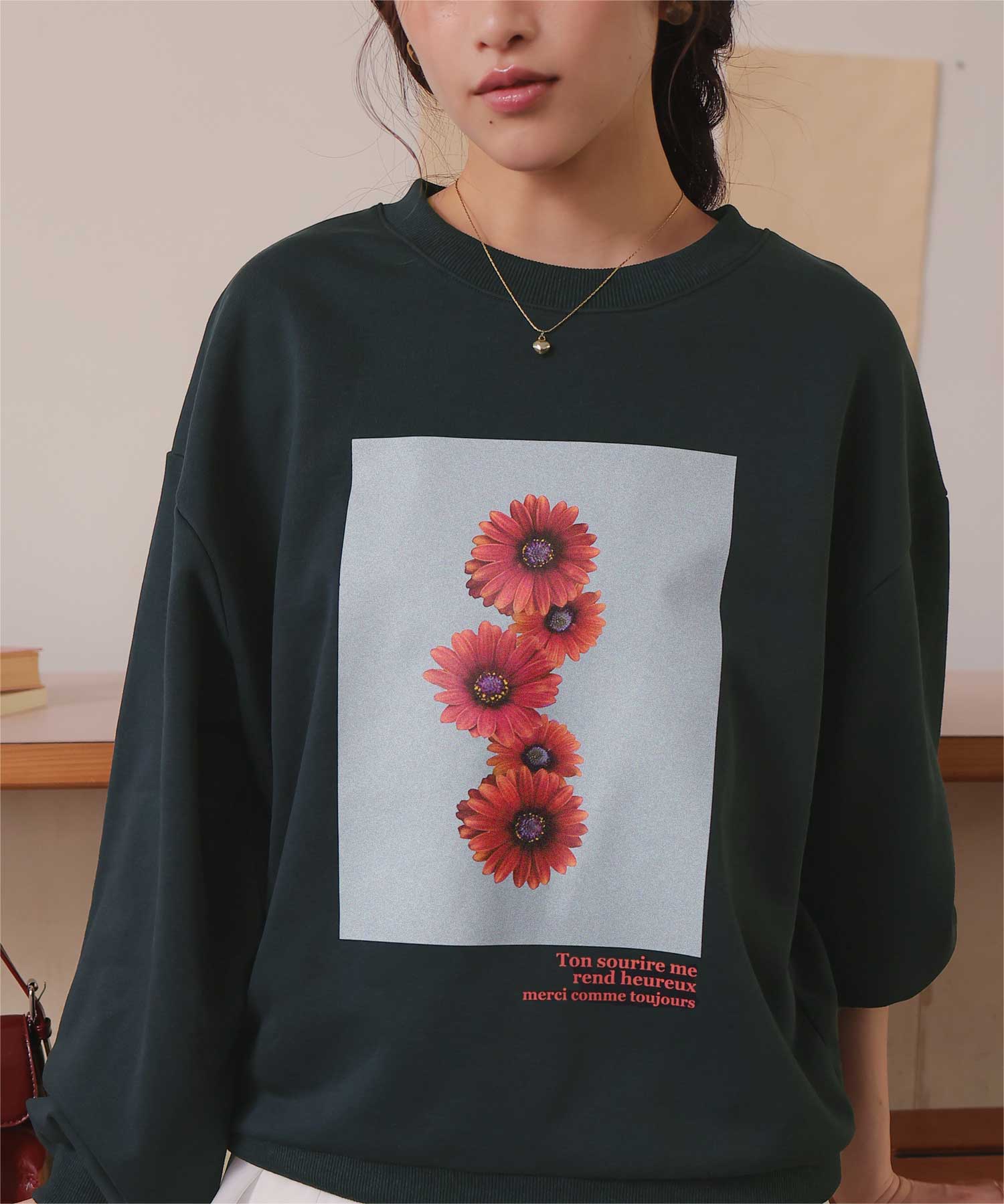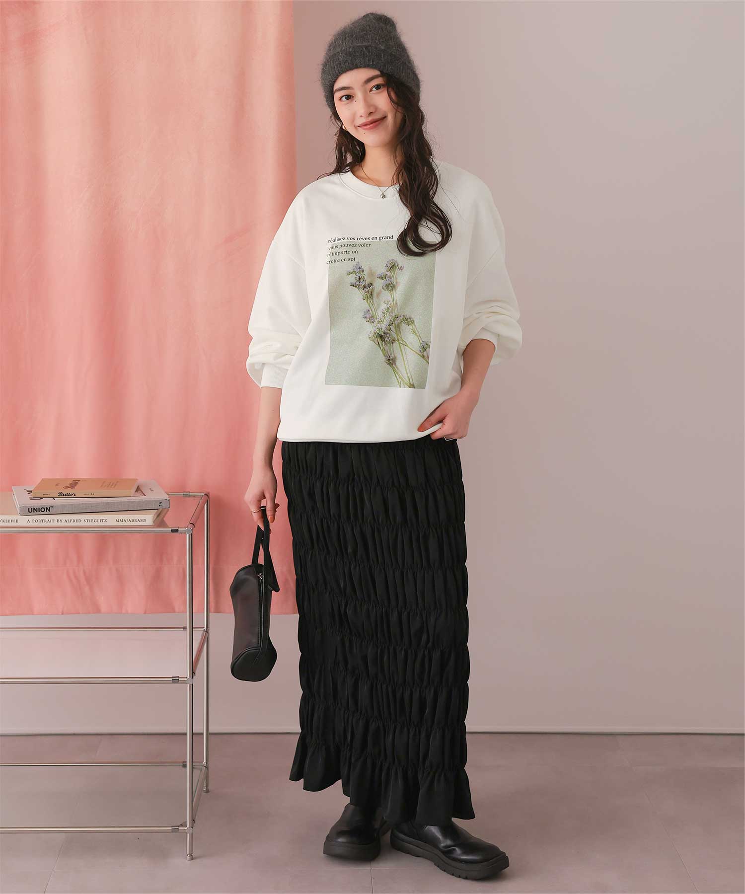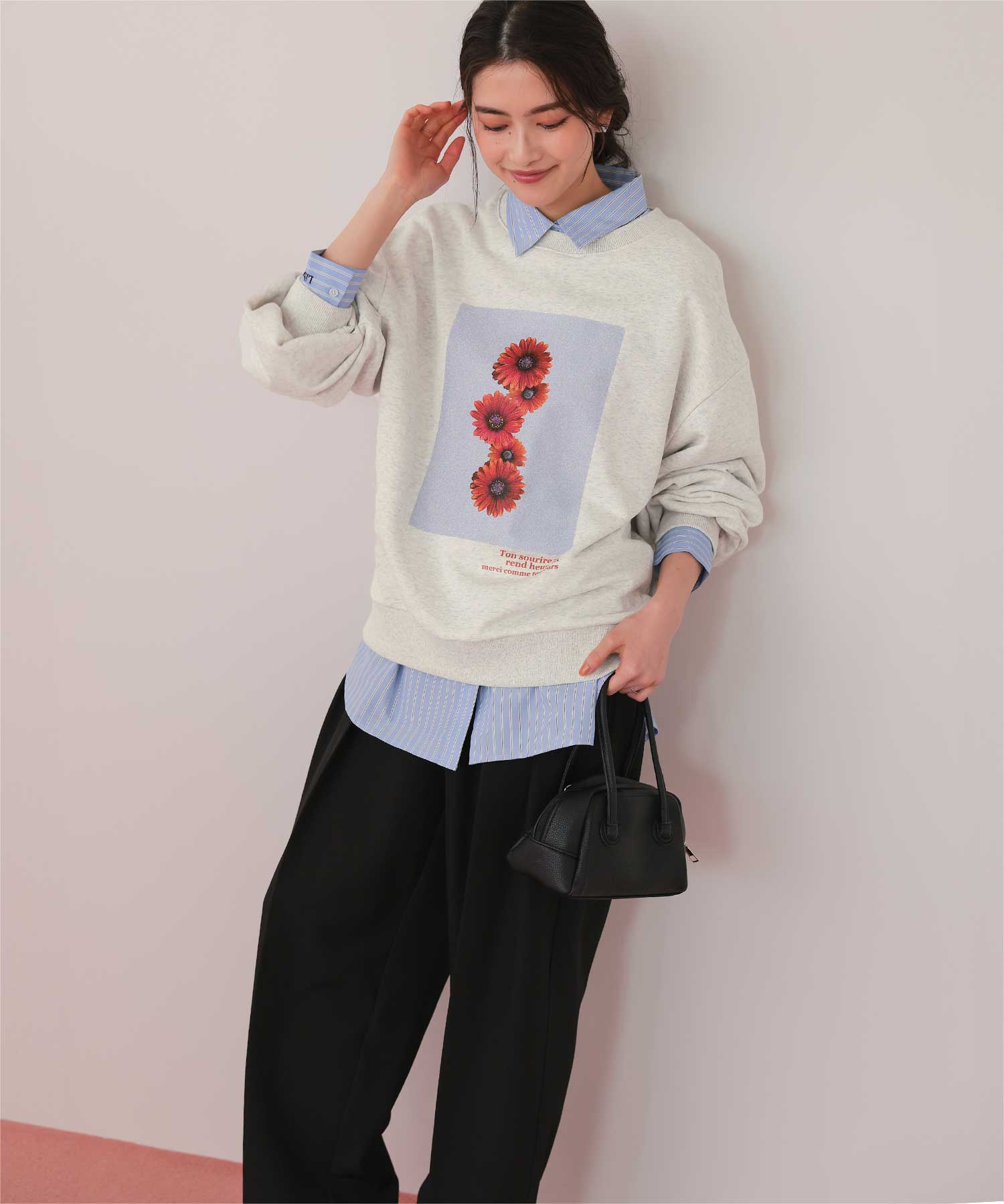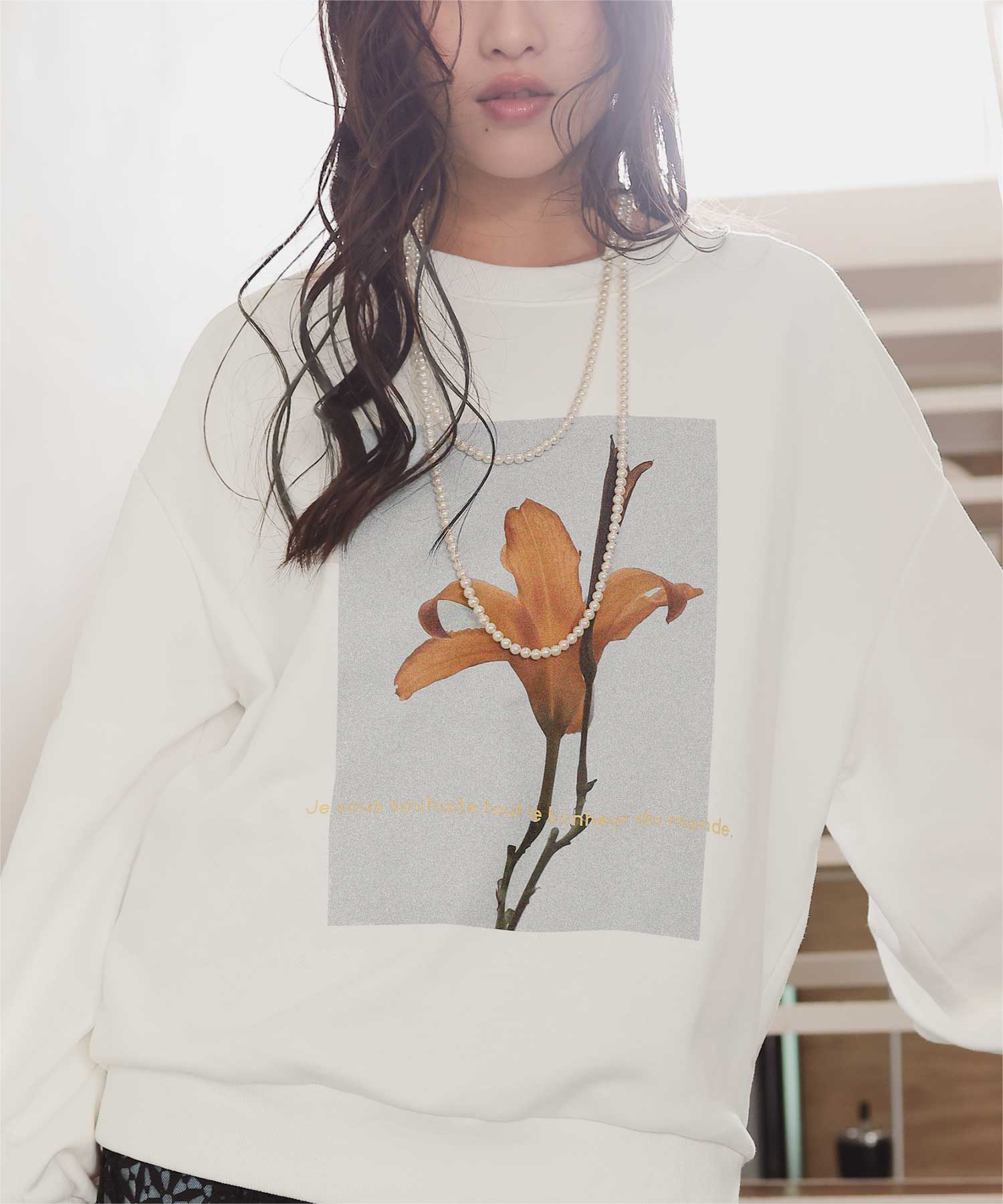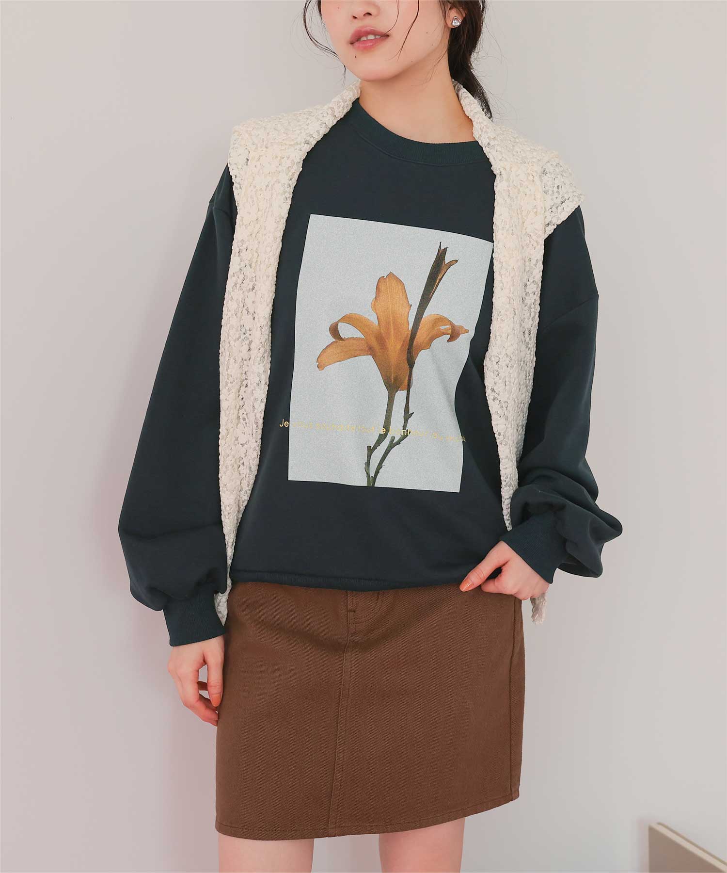 ・フロントに施した花のフォトアートプリントが、スタイリングにやわらかな個性をプラス