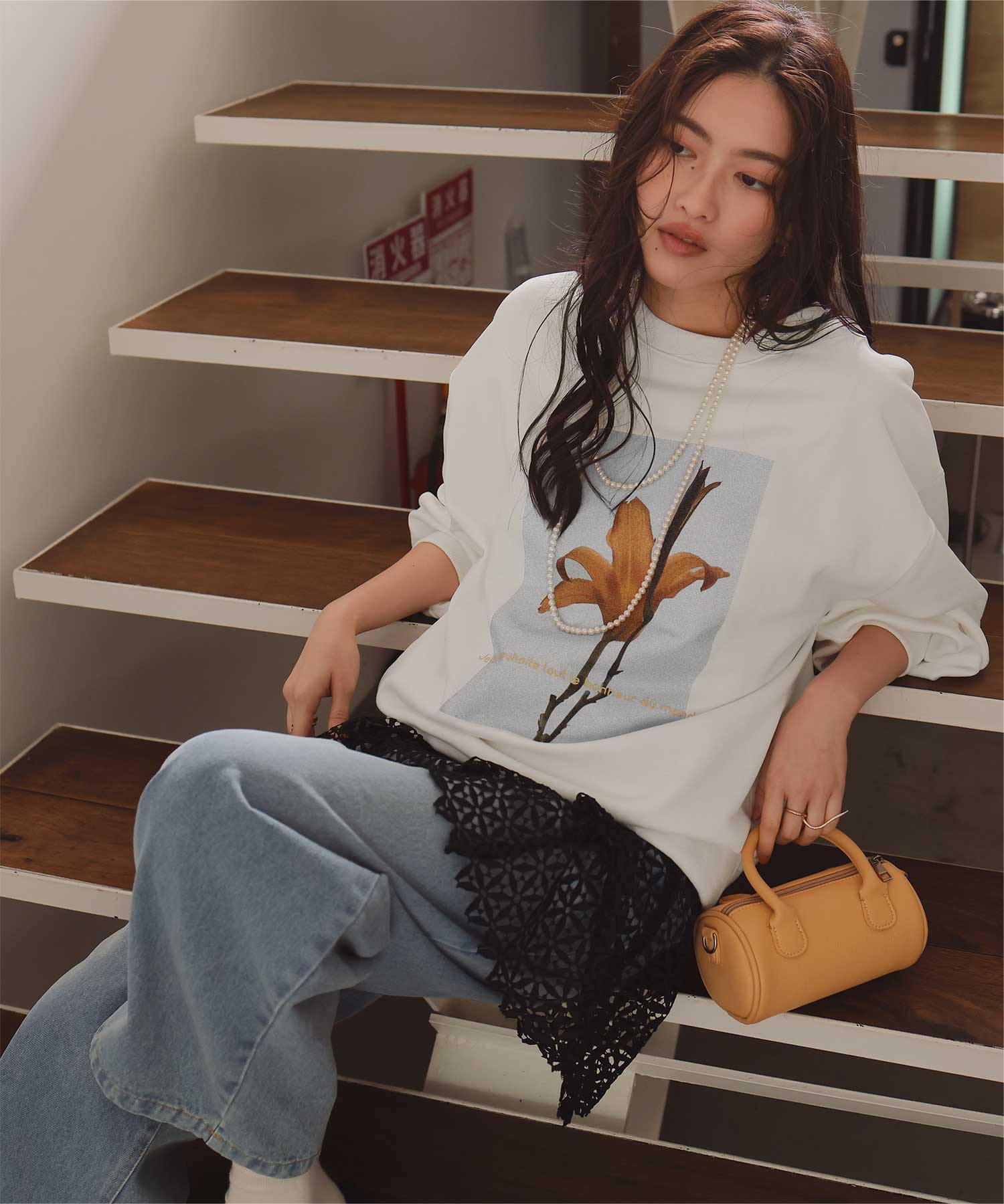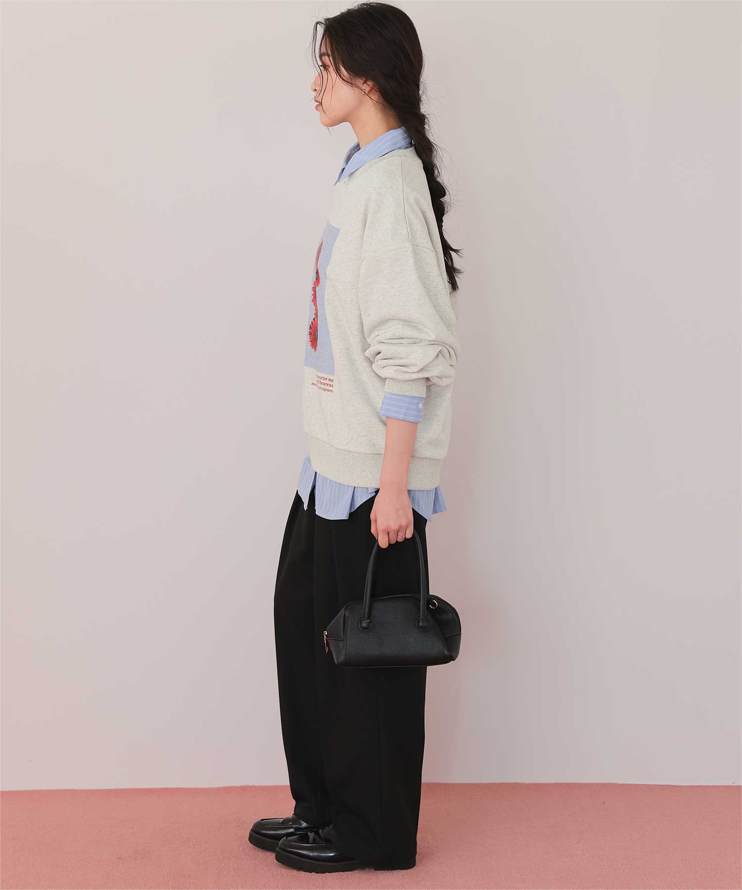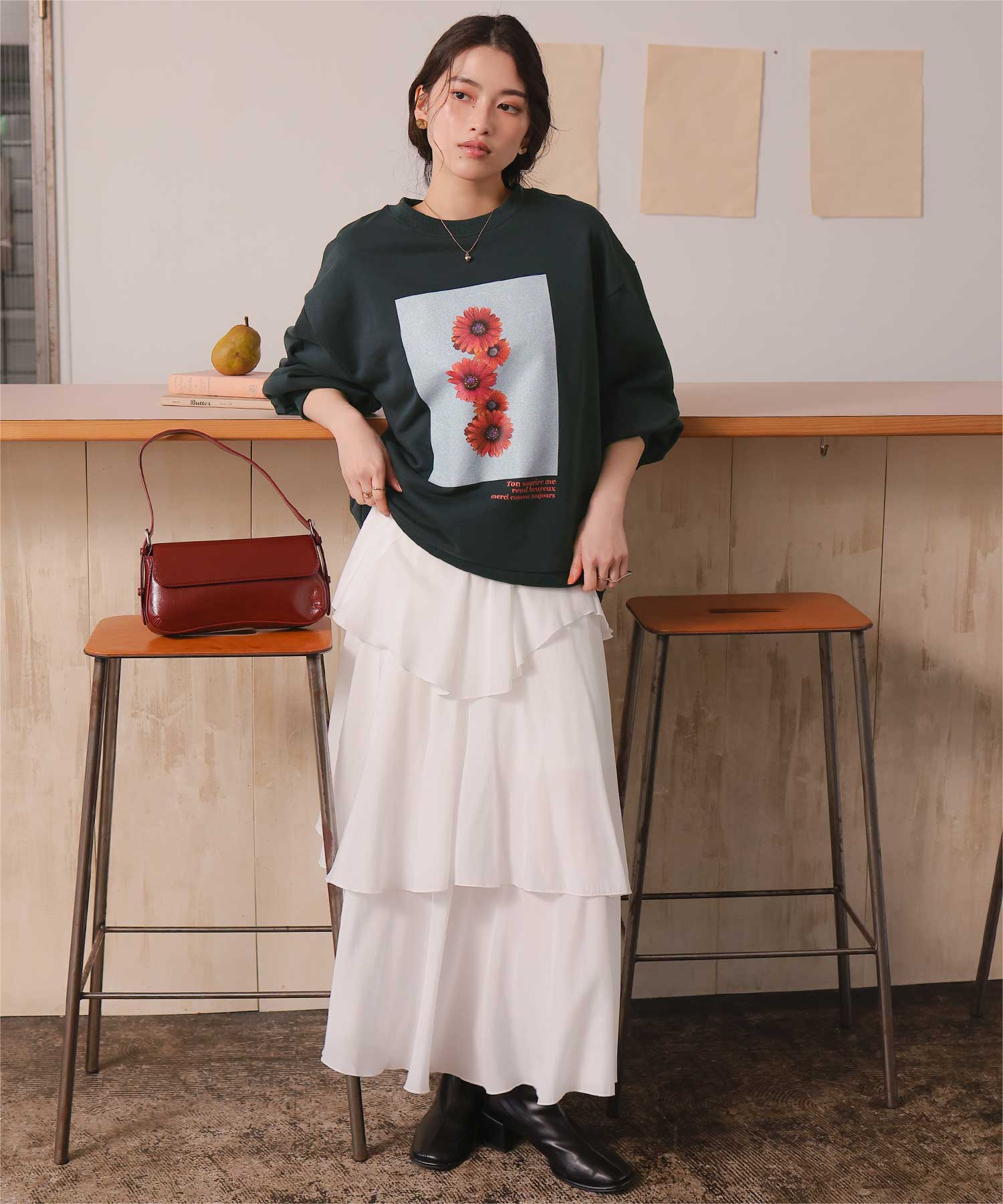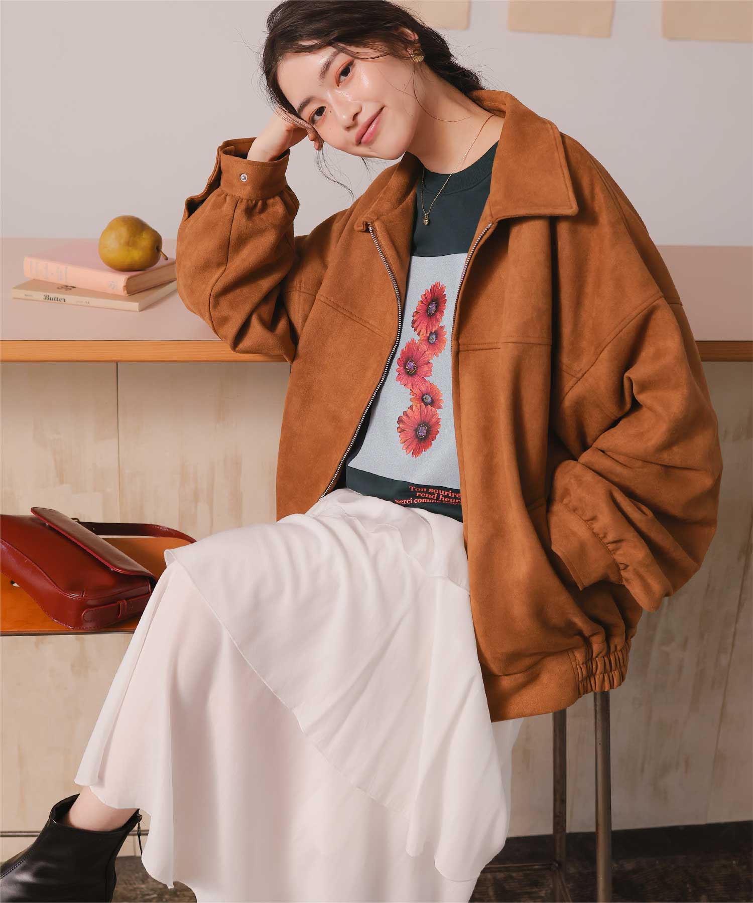 ・フロントに施した花のフォトアートプリントが、スタイリングにやわらかな個性をプラス