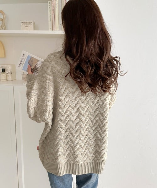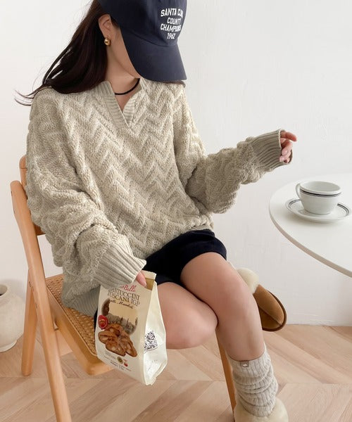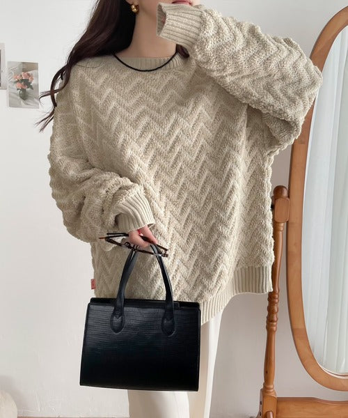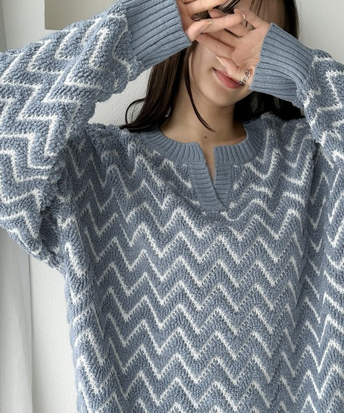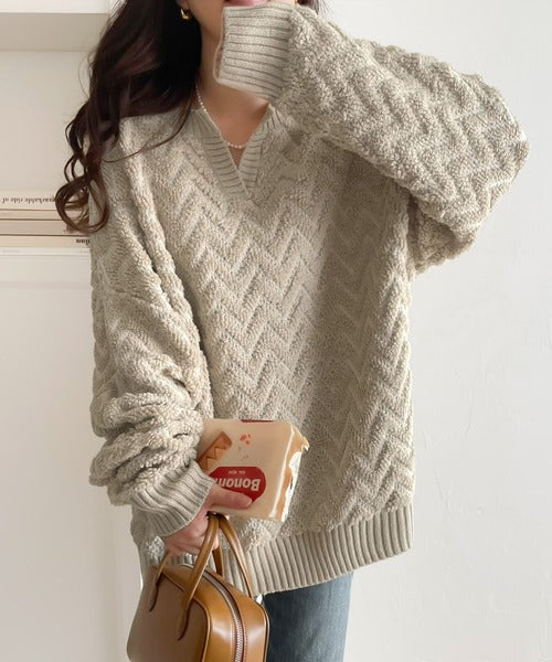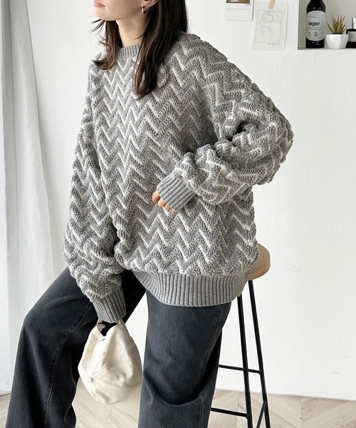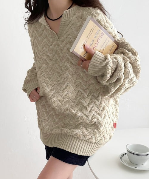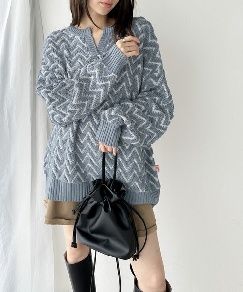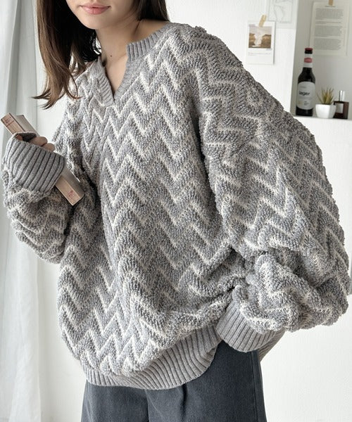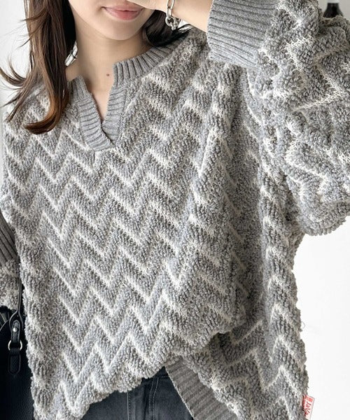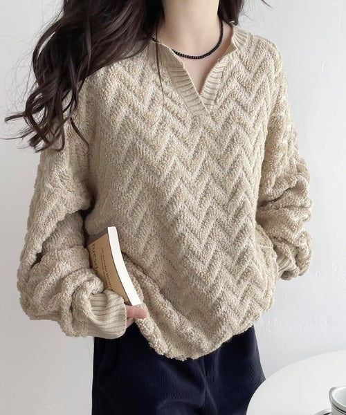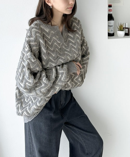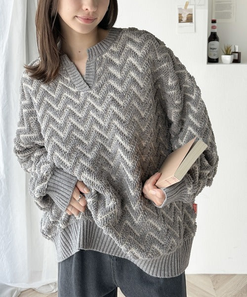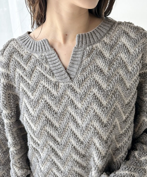 《Javaジャバコラボ》主役級に映える、前後2wayヘリンボーン柄キーネックニット jv1260052