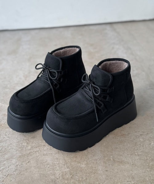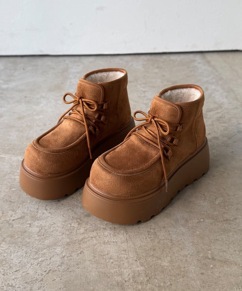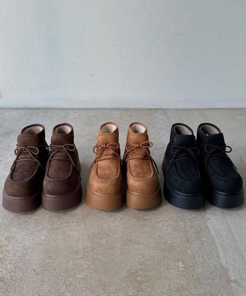 ヌバック調のフェイクレザーを使用したムートンブーツ。