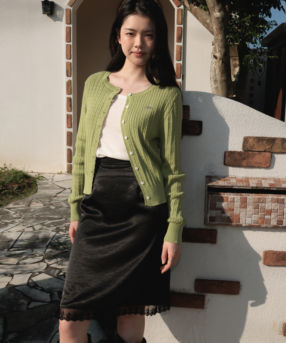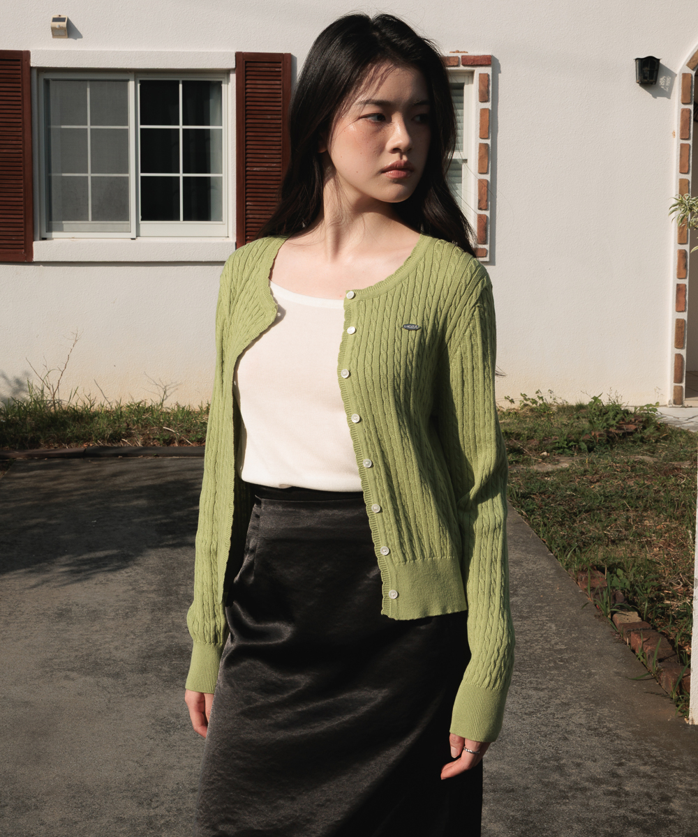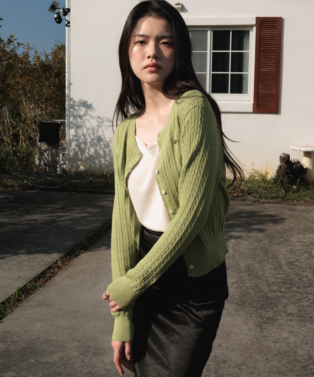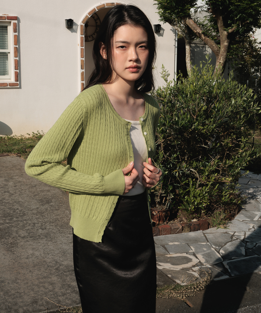ミニマルなシルエットとクラシックなケーブル編みで活用度の高いアイテムのケーブルニットカーディガンです。