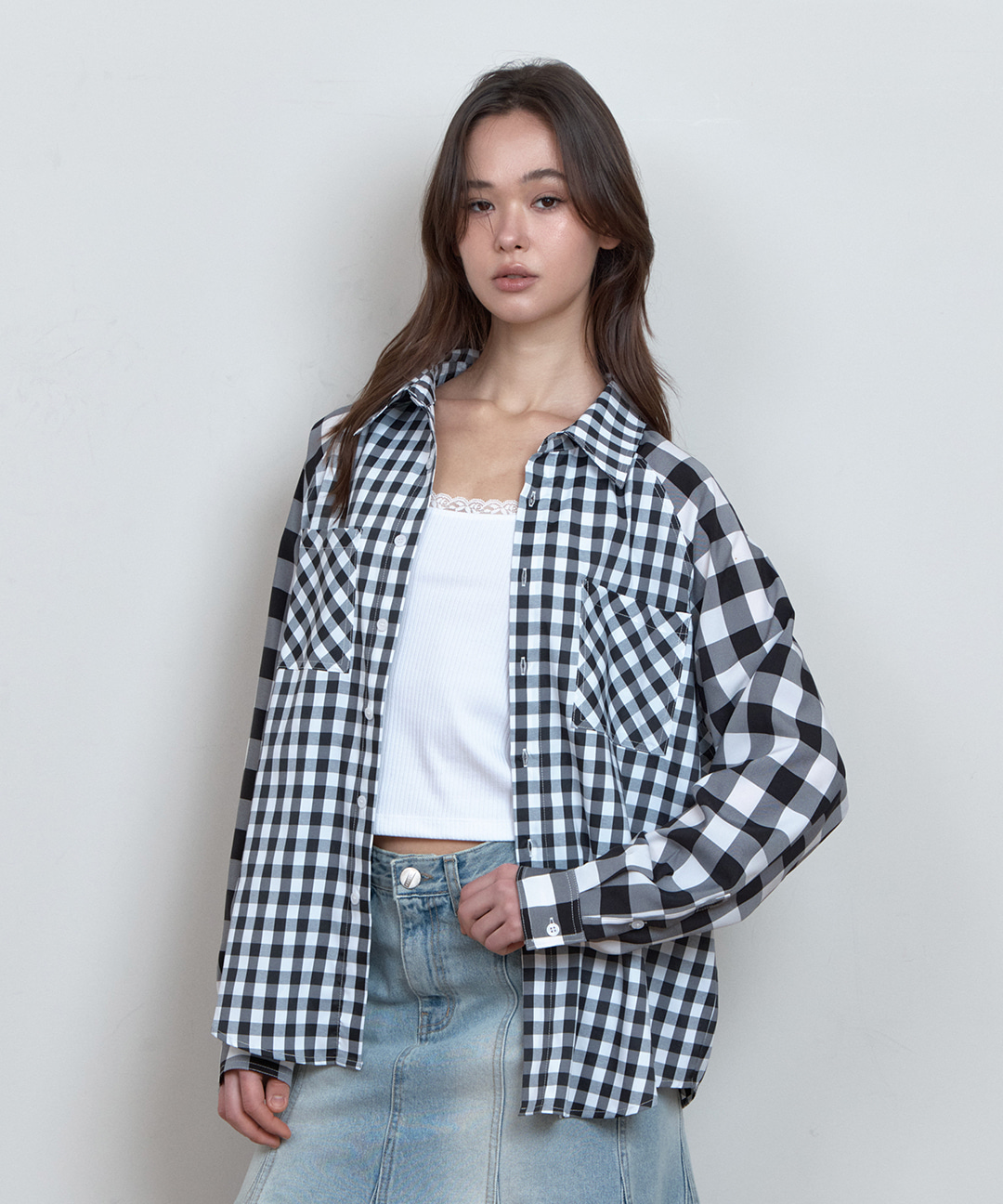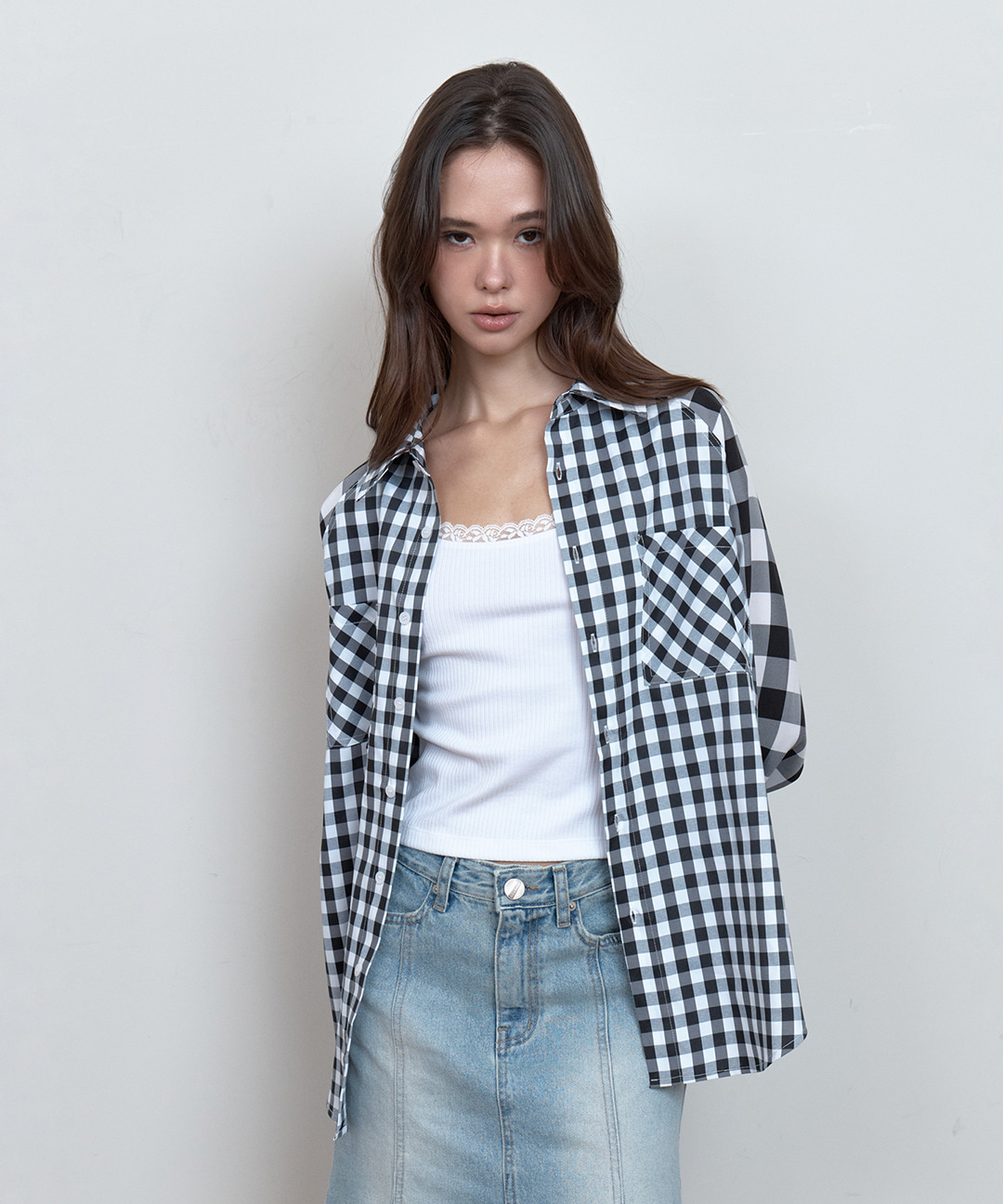 C COLOR BLOCK CHECK OVERSIZED SHIRT_BLACK