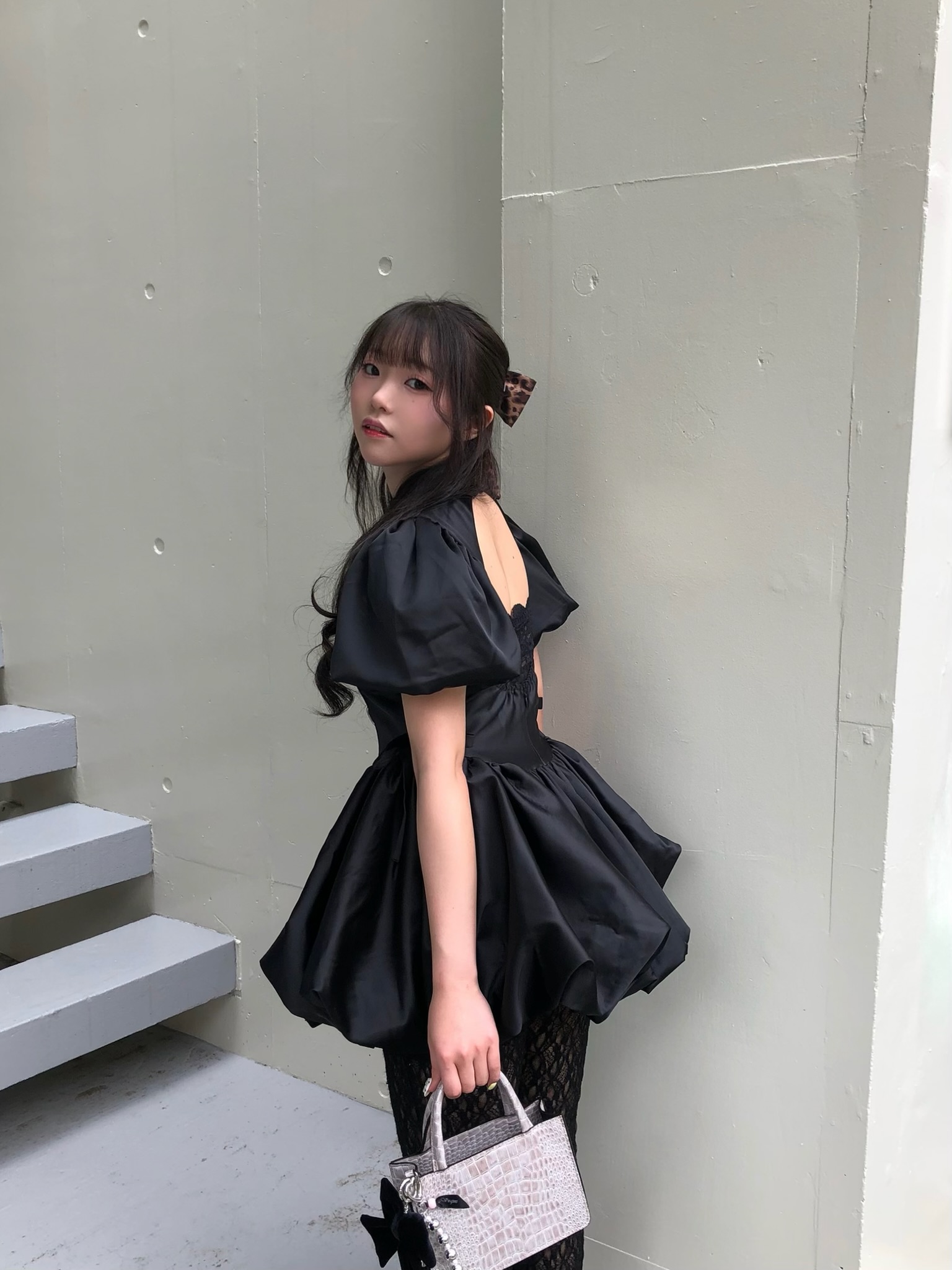 ウエストラインの切り替えとボリューミーなバルーンペプラムでスタイルアップを叶え、サイドのリボンもワンポイントに。
