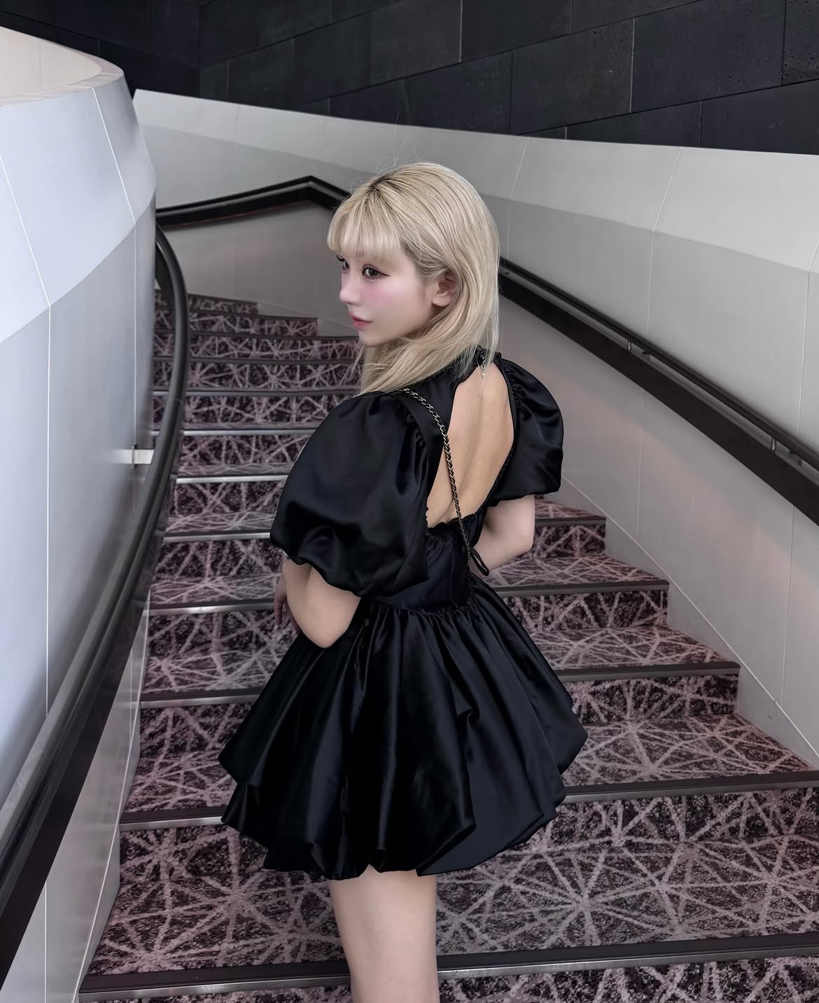 柔らかい色味で落ち着いた印象を与えながらも、大胆なバックデザインで女性らしさをプラス。