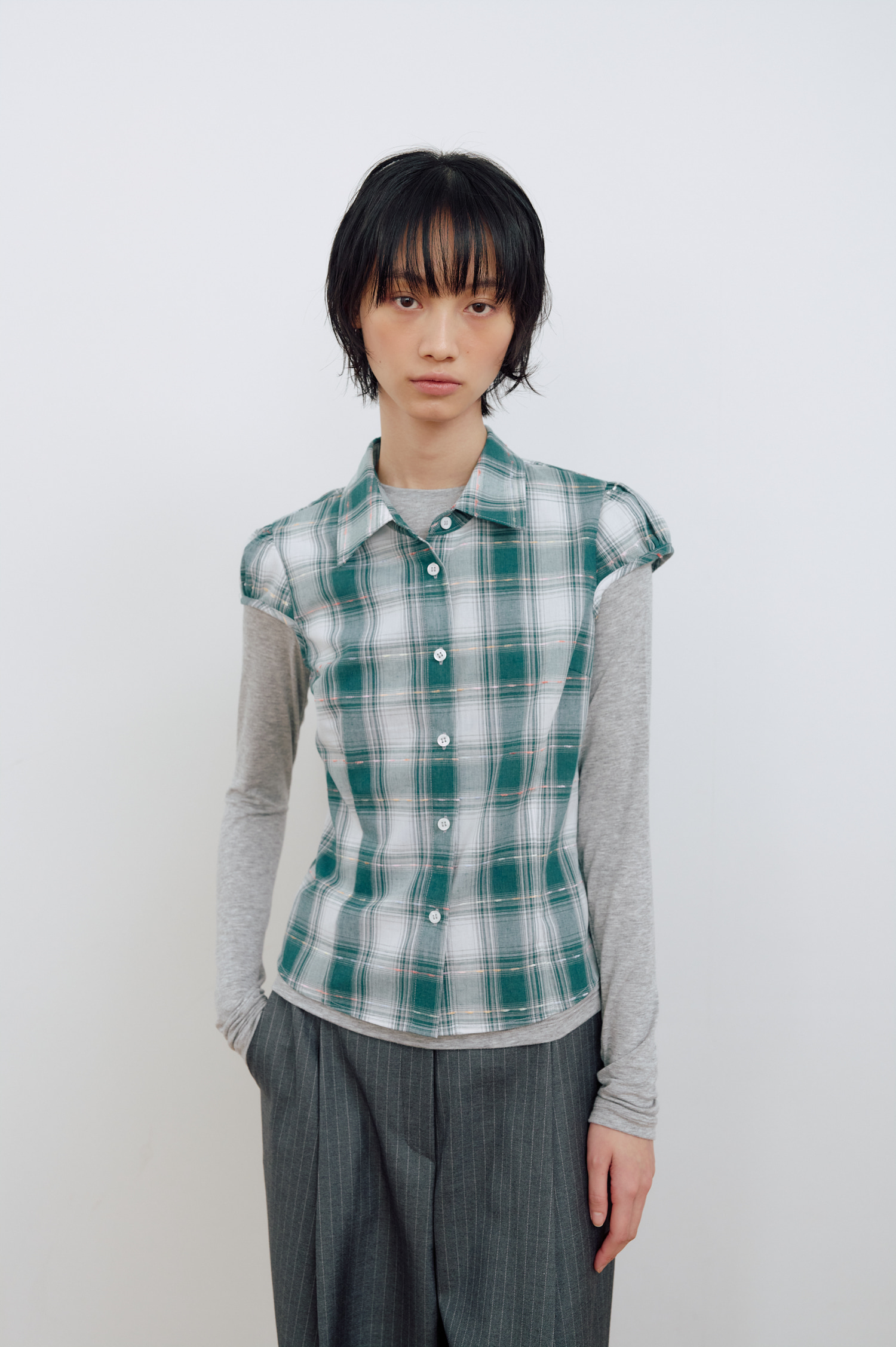 CHECK CAP SLEEVE SHIRT_GREEN