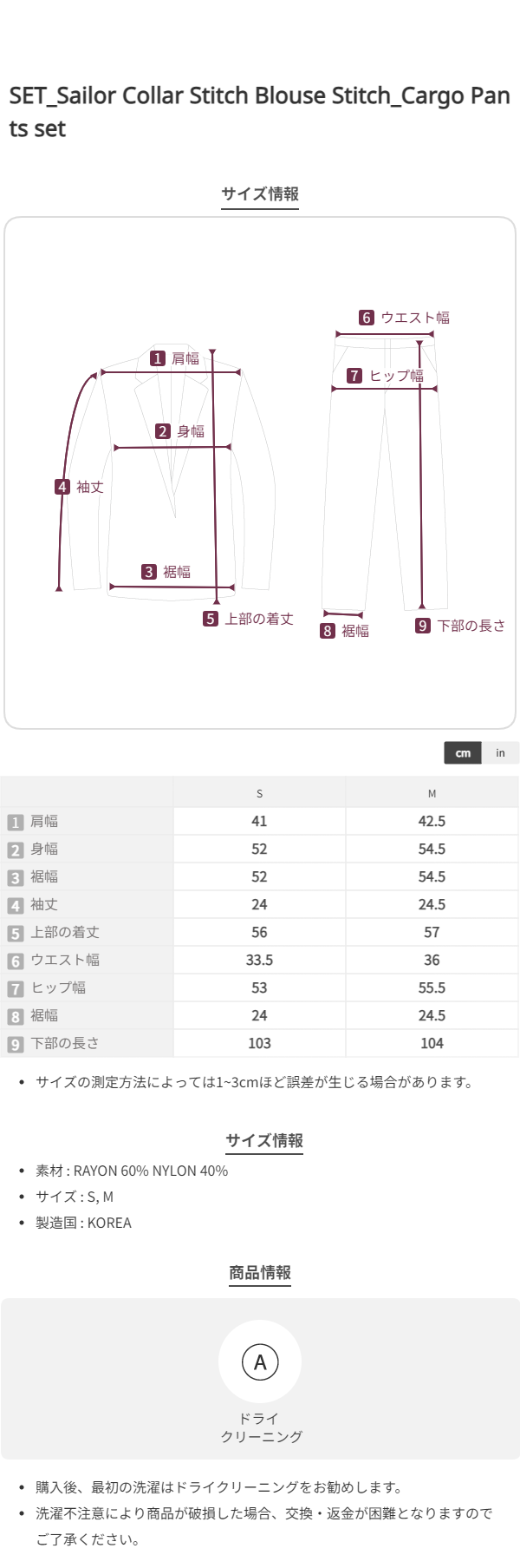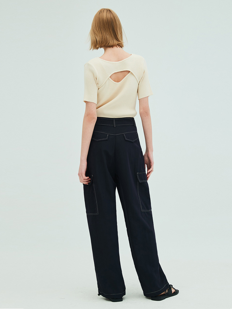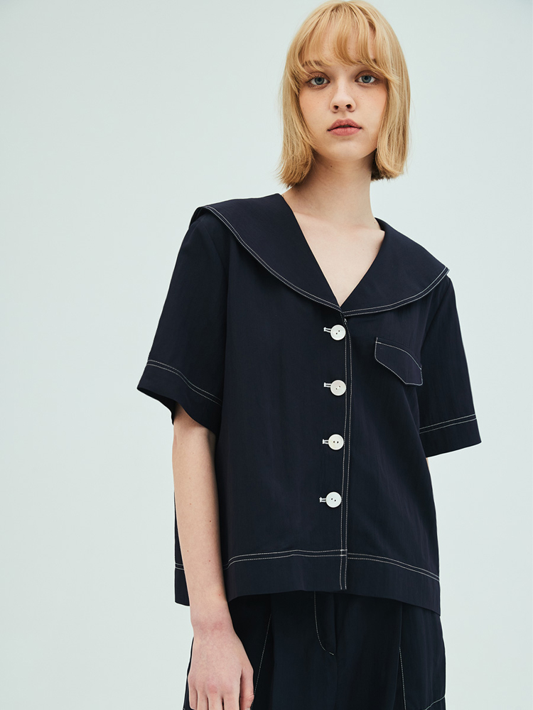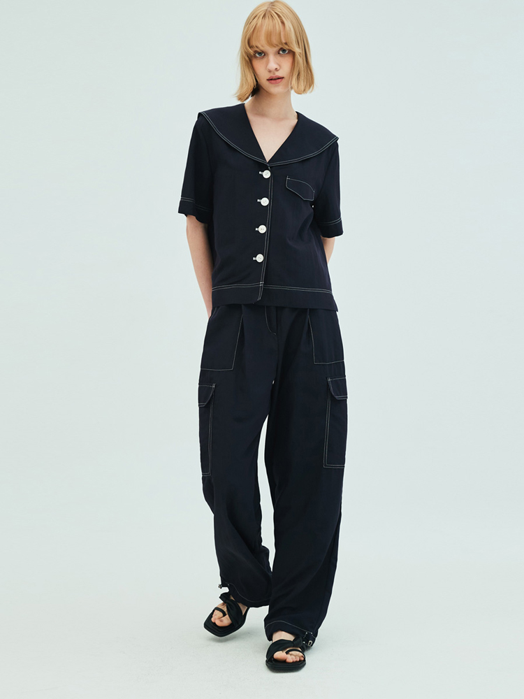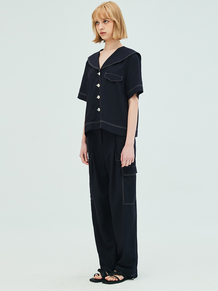 SET_Sailor Collar Stitch Blouse Stitch_Cargo Pants set_Navy