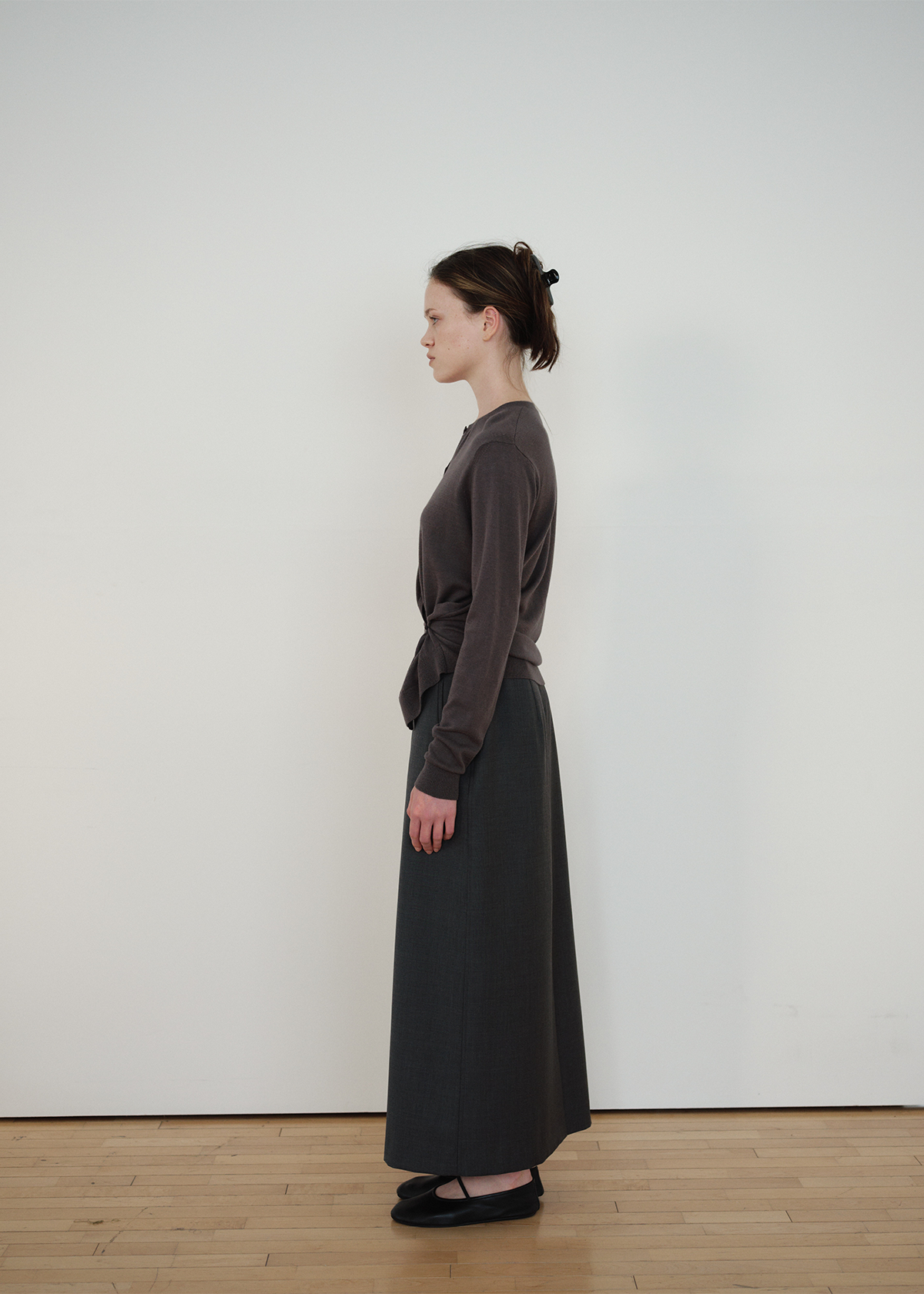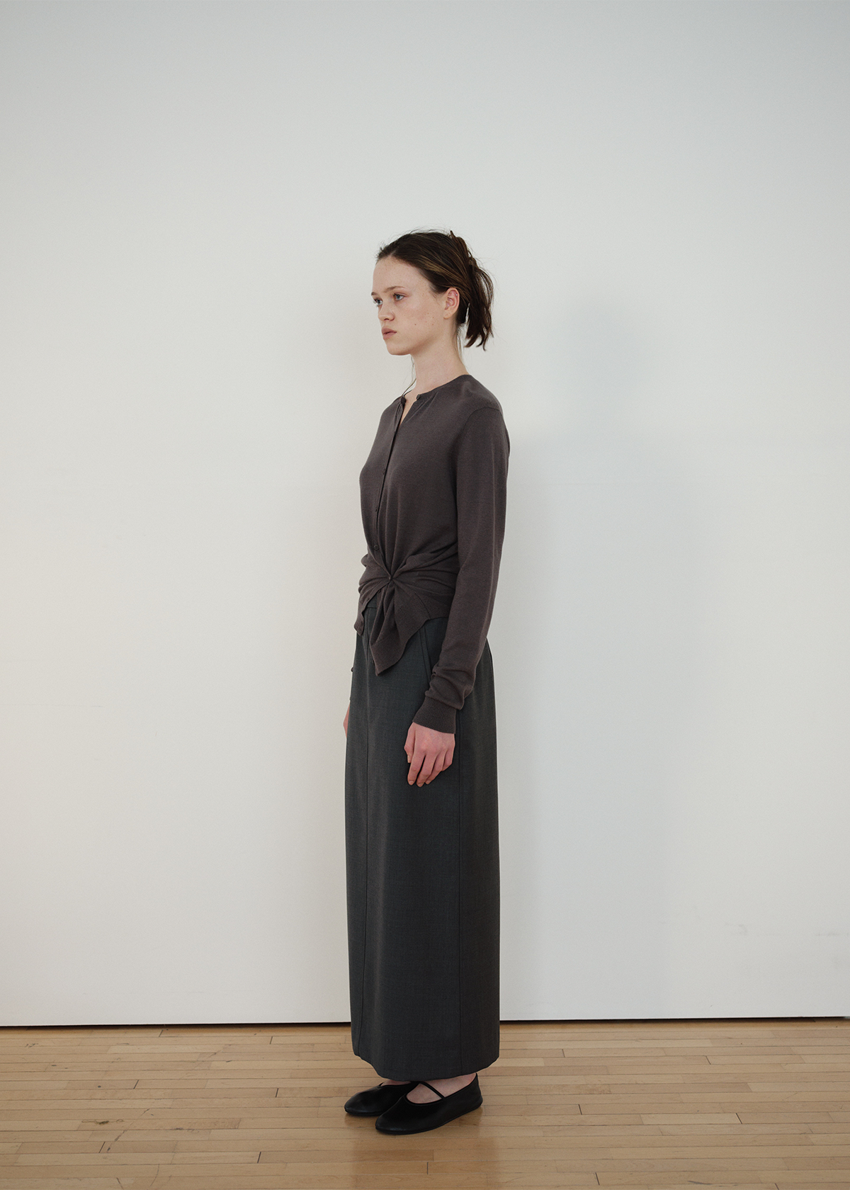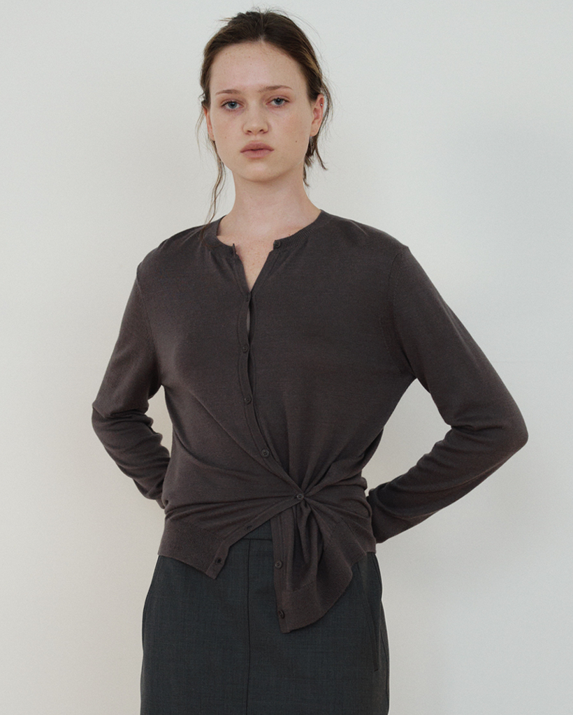 サイドラインのボタンディテールを活かしてラップのように結べる 2WAY デザインで、ベーシックなカーディガンスタイルとポイントのあるシルエットの両方を楽しめます。袖口と裾はリブ組織で仕上げ、ほどよいテンションでフォルムを整えます。Cream・Charcoal・Black の3色構成で、デイリーからフォーマルなスタイリングまで幅広くマッチします。
