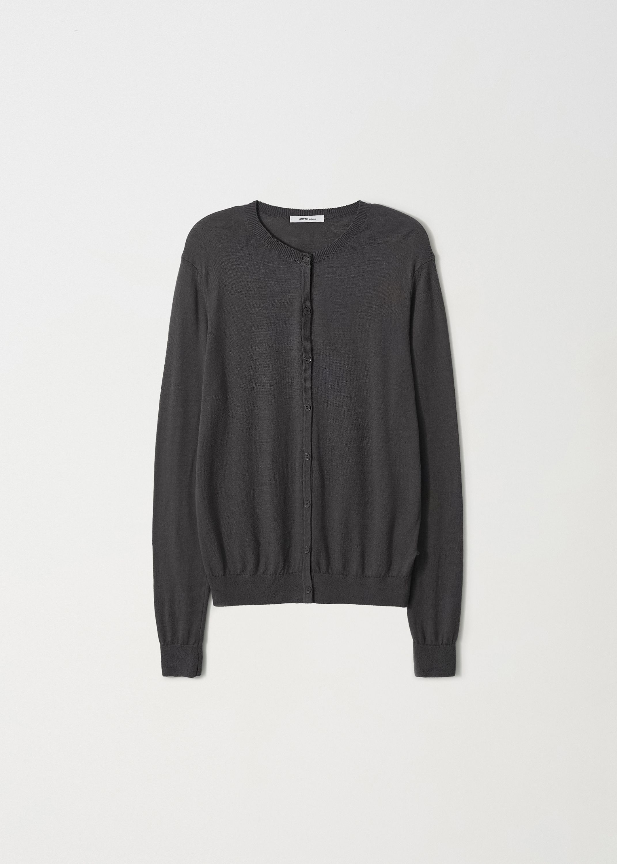 SILK ブレンド糸で仕立てたニットカーディガンです。RAYON 混ならではのシルキーなタッチと自然なドレープが際立ち、季節の変わり目には一枚で、またアウターのインナーとしても活用しやすい厚みに仕上げました。