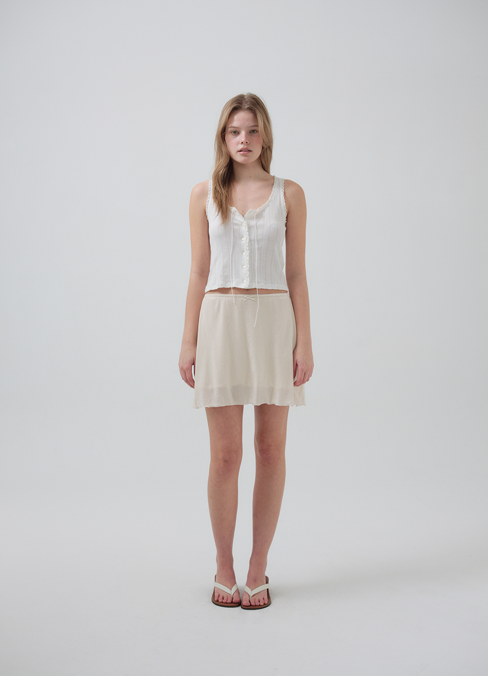 女性らしいUネックとフルオープン仕様のボタンディテールを備えたスリーブレスデザイン