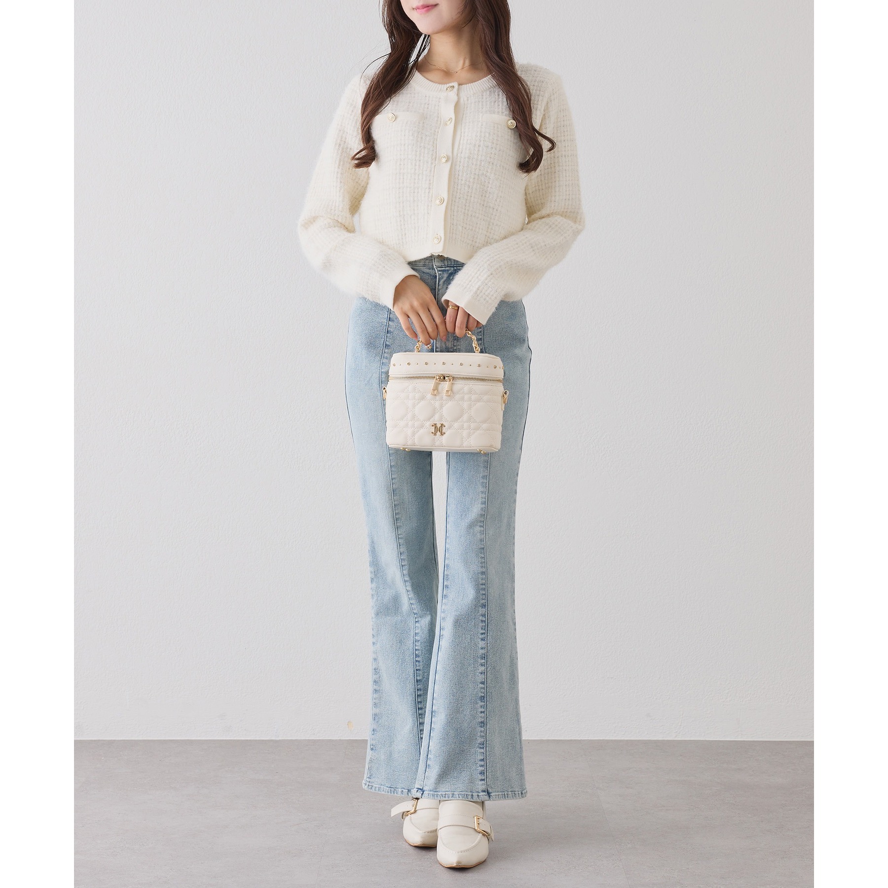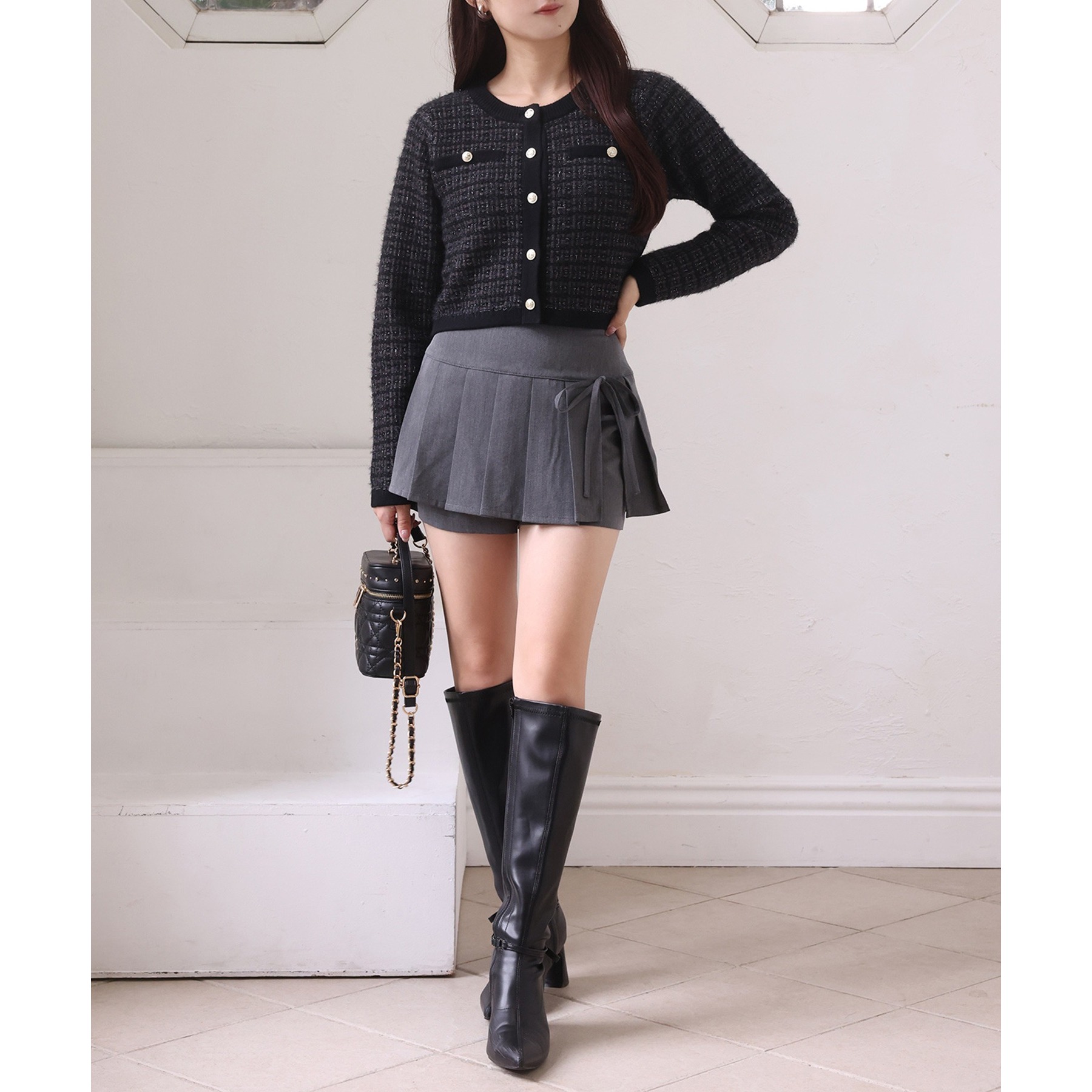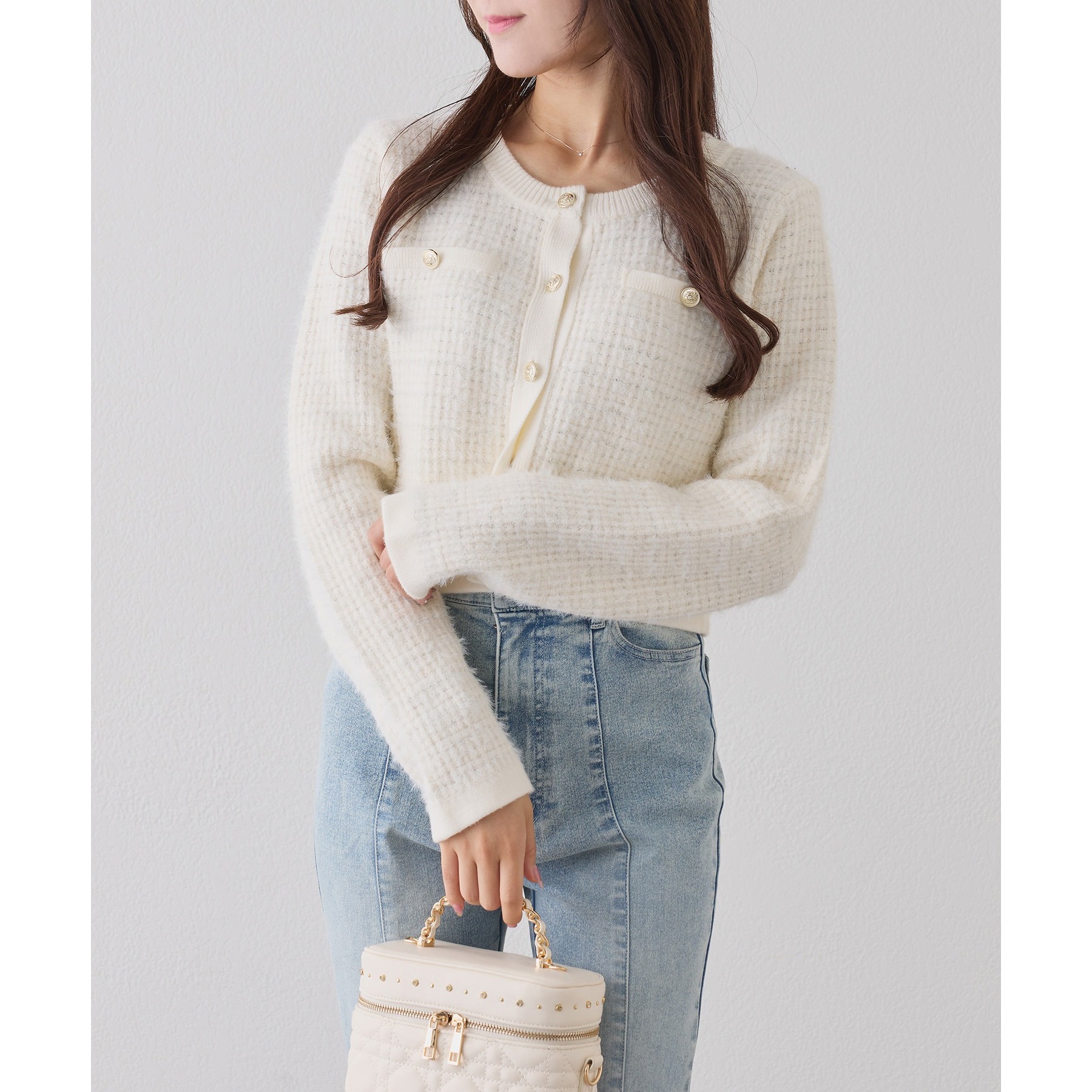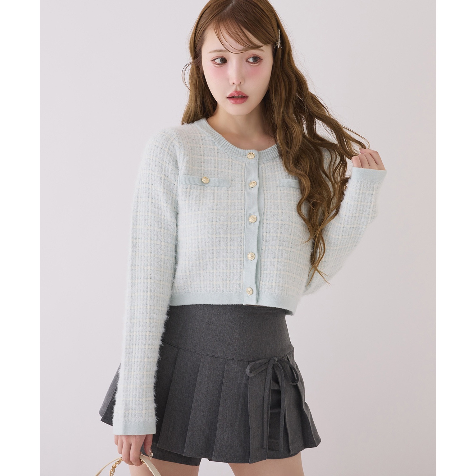 金ボタンラメツイードカーデ