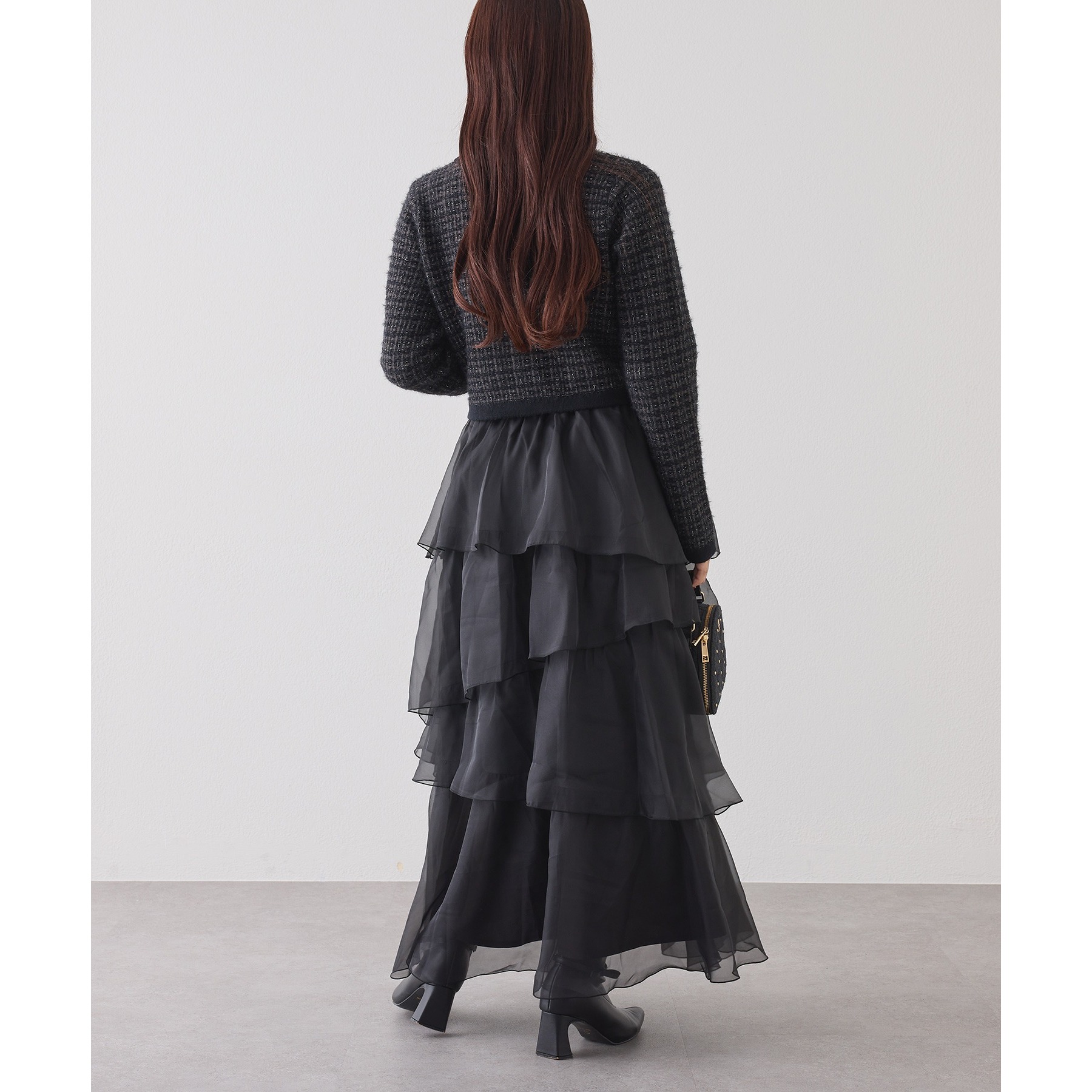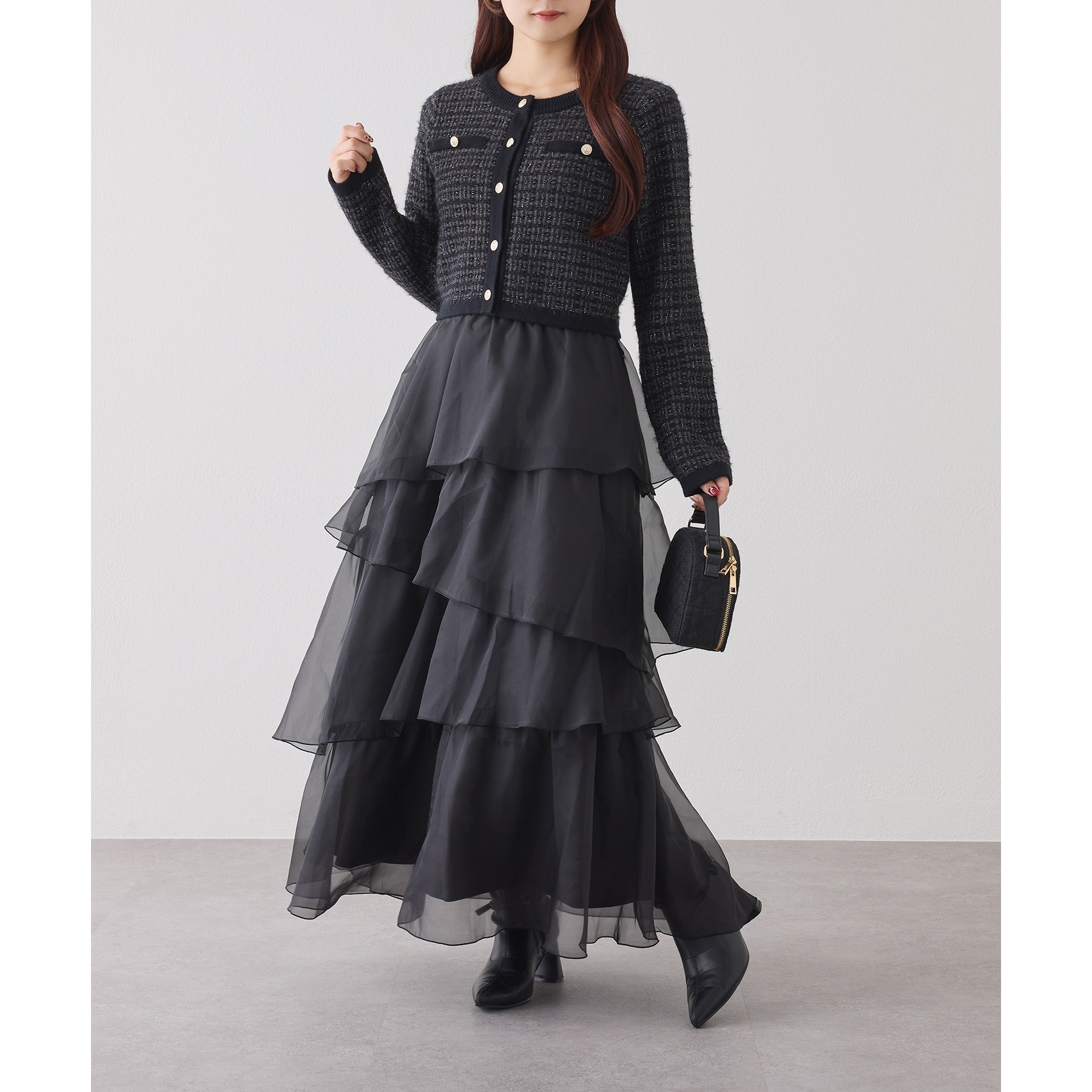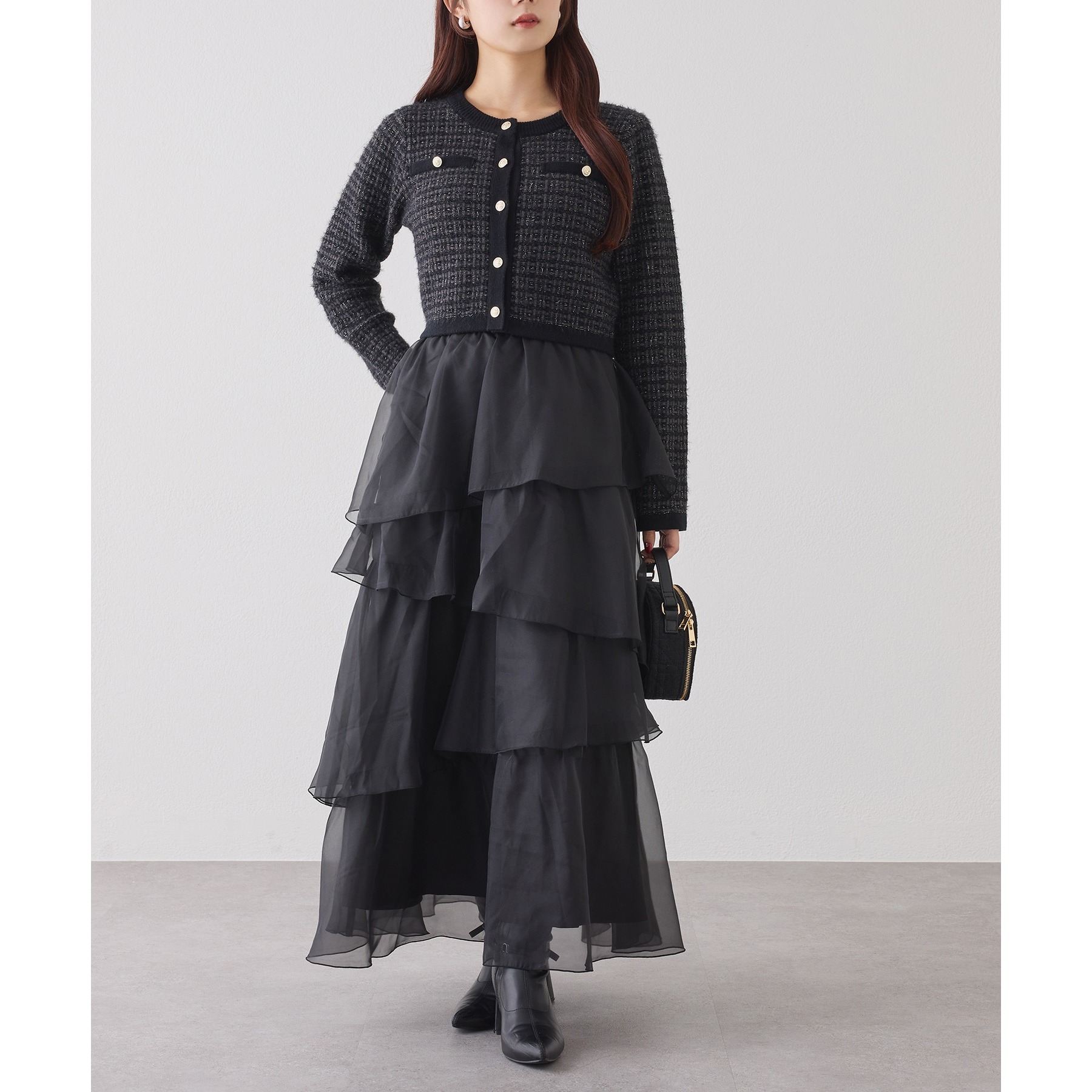 多色の糸を組み合わせて編むことで、立体感と奥行きを出したツイードニットカーディガン。