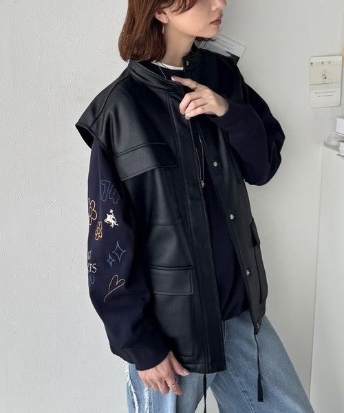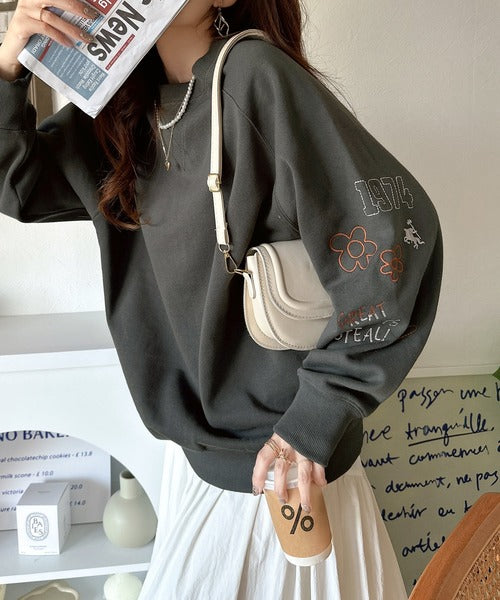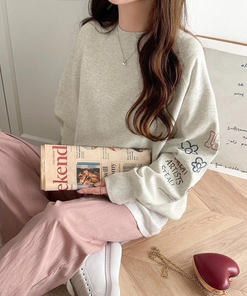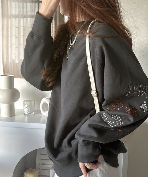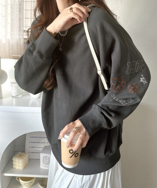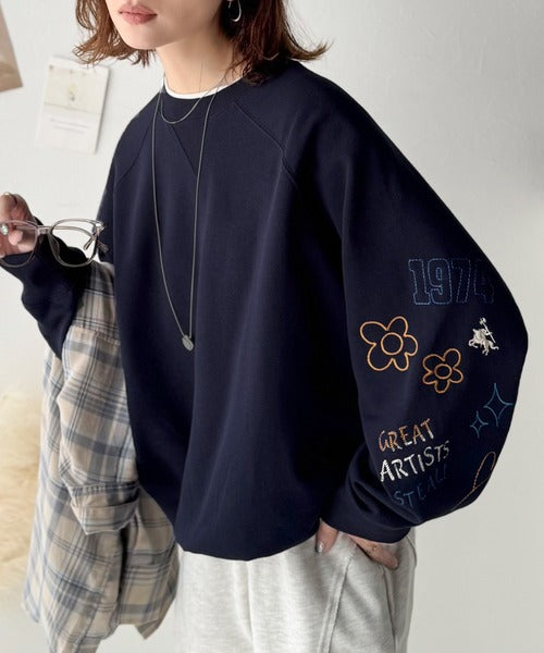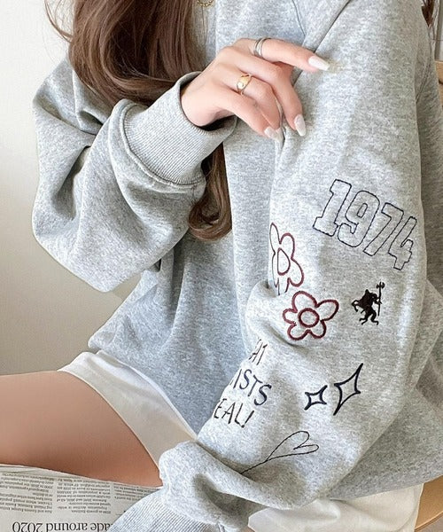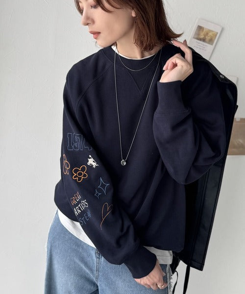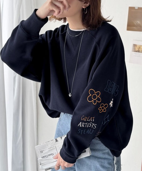 片袖にハンドメイド風の刺繍を多種施した裏起毛スウェット。