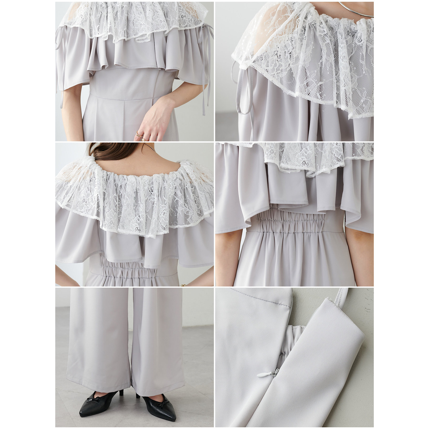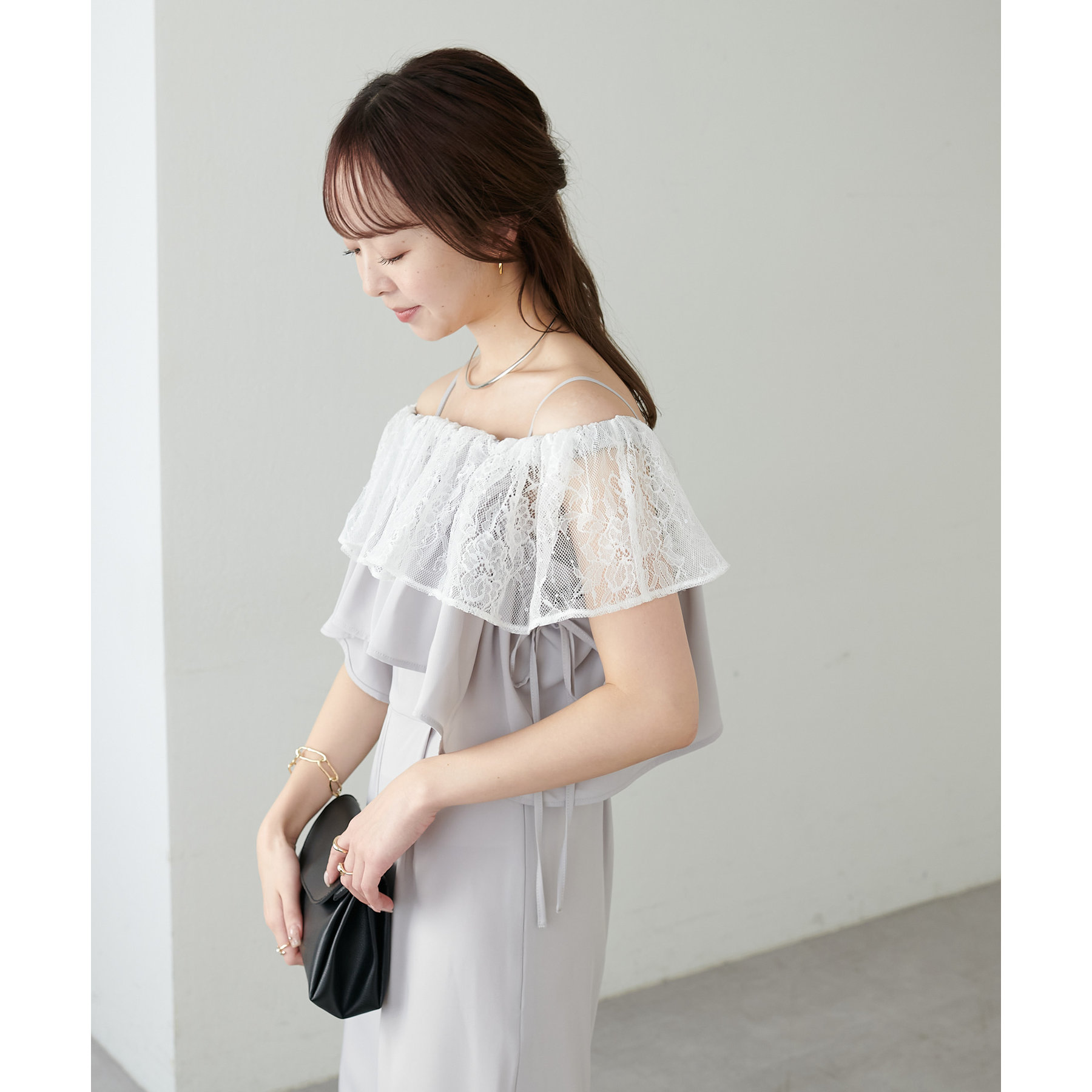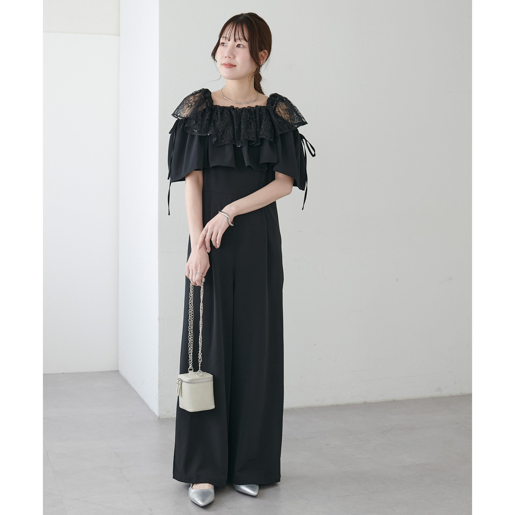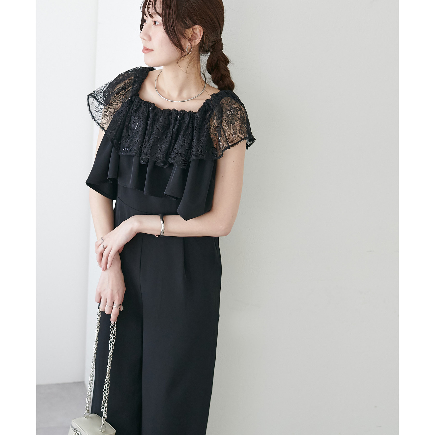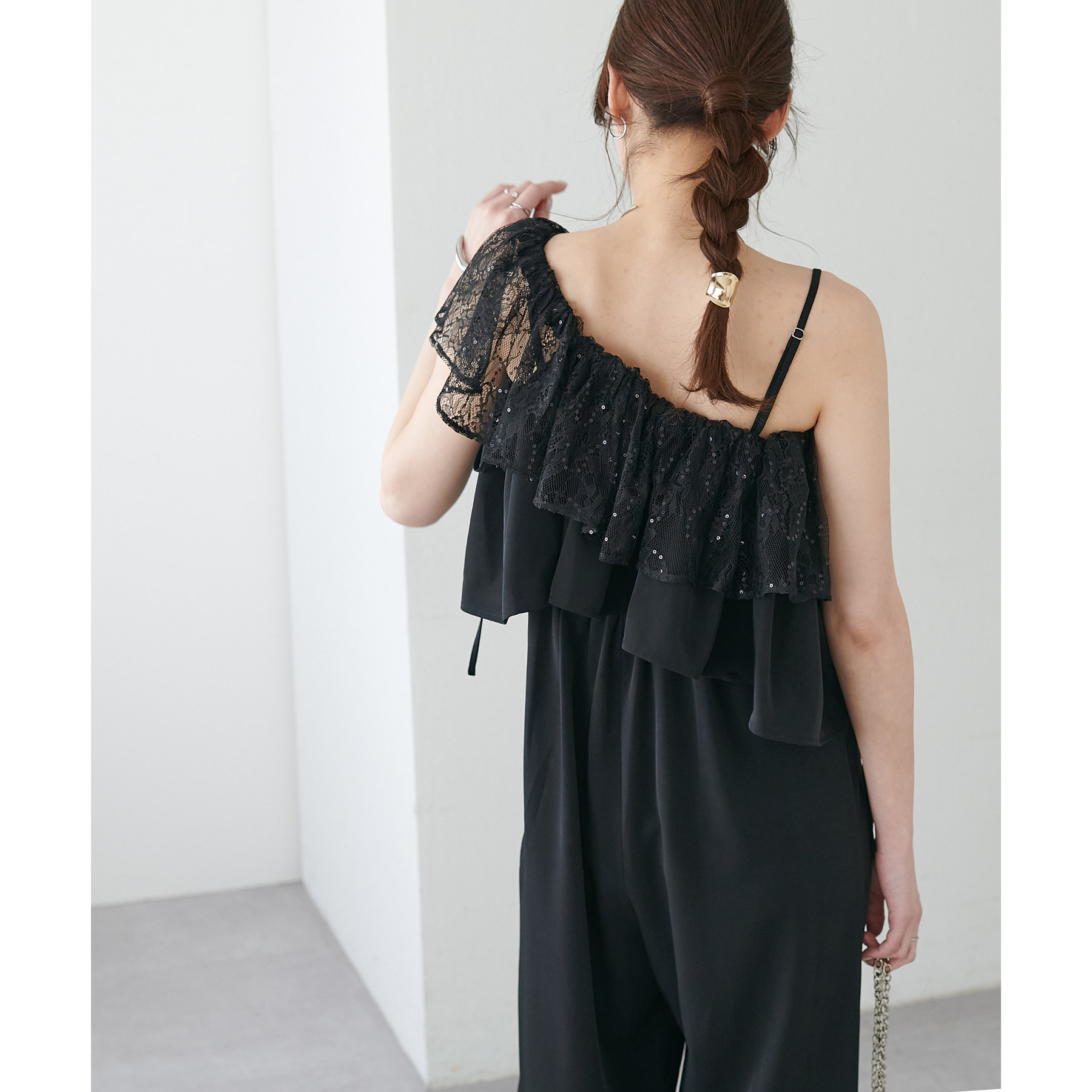 マルチウェイで使えるフリル。使い方によって雰囲気を変えてお楽しみいただけます♩フリルレースにスパンコールが入っているので異素材の組み合わせで高見え◎袖のリボンデザインもポイントです。