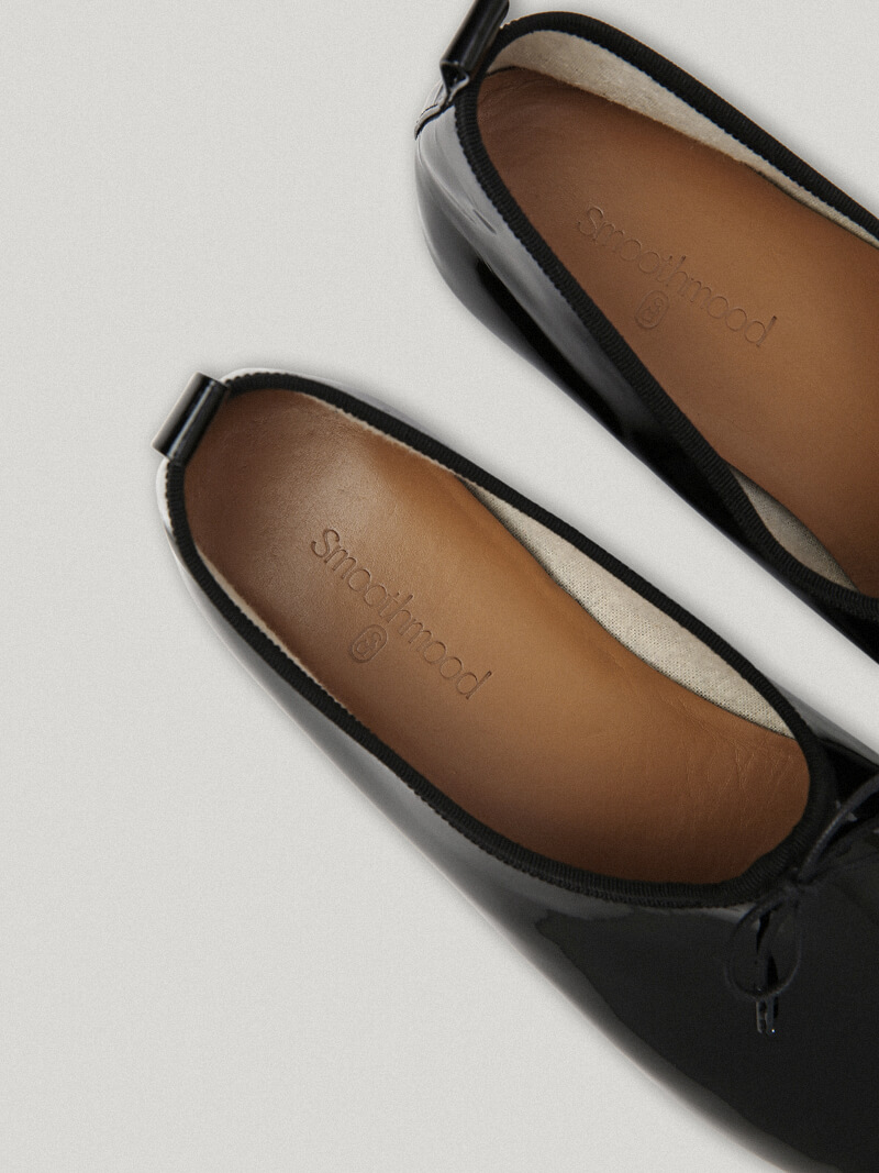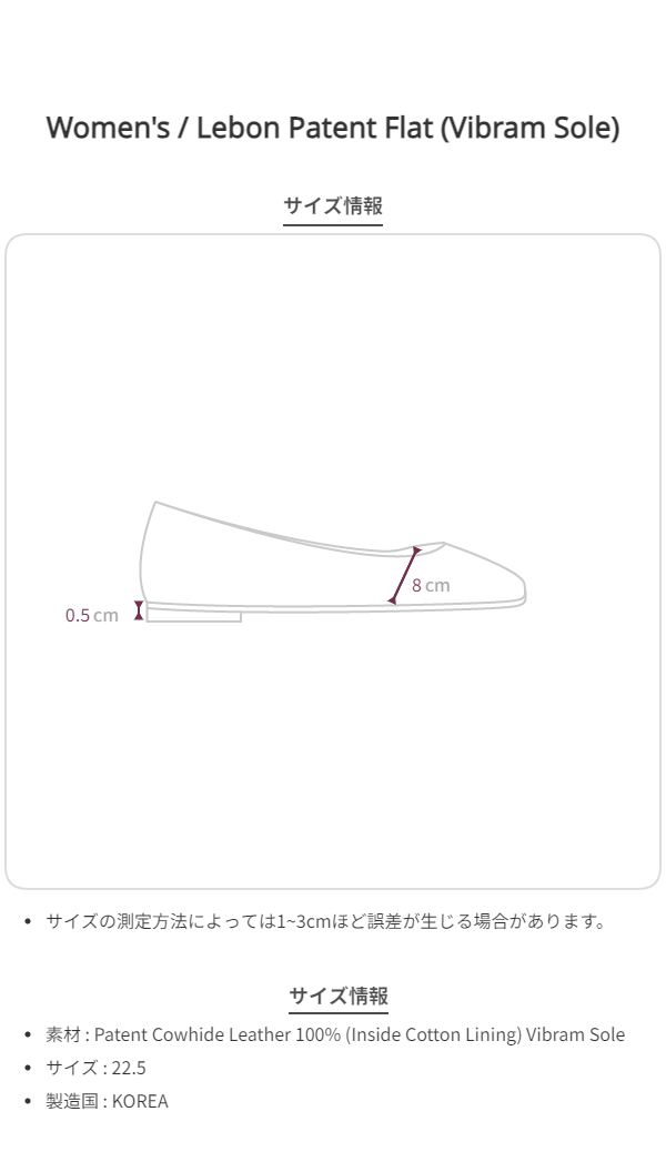 クラシックでガーリーなムードにグロッシーさを加えた、ル・ボン ペイテント フラットです。一般的なバレエフラットより甲をより包み込むハイヴァンプシルエットで、より感覚的で安定して着用できるデザインです。ミニマルで愛らしいボウディテールを加え、フラットシューズならではのガーリーでクラシックな魅力が詰まったシューズです。ほのかな光沢感が漂うパテント素材で作られ、アッパーはしっかりしたパテントカウハイドレザーで無駄のない端正な艶を伝え、ライニングはコットンライニングを使用して軽い履き心地を提供します。気軽に楽しめる低めのヒールで快適に着用でき、アウトソールにはイタリアの名品Vibram(ビブラム)社のソールを使用し、安定した履き心地と耐久性を加えました。Smoothmoodのすべてのアウトフィットに感覚的で愛らしくマッチするシューズとして、スタイルやシーズンにとらわれずクラシックにお楽しみくださいㆍアッパー Patent Cowhide Leatherㆍライニング Cotton Liningㆍハイヴァンプ シルエットㆍボウ ディテールㆍアウトソール/ヒール Vibram Sole*サイズはジャストサイズをおすすめします。*Patent Leatherは光沢があり硬めでしっかりした素材の特性上、着用するほど自然にシワが入り、スクラッチが生じる場合があります。天然皮革の特性上、シワや斑点、軽微なスクラッチ、色味の差、シボ(結)の跡、血筋、レザー内側や仕上げ部分の剥がれ、粉、汚れのように見えるシミがある場合があります。これは天然皮革の自然な特性ですので、あらかじめご了承ください。汚れや色移りに弱いため、水分を避けた丁寧なお手入れが必要です(雪・雨 注意)。製品の特性上、ヒールやアウトソールに微細なスクラッチや汚れがある場合がありますので、あらかじめご了承ください。*1:1の受注制作商品につき、ご注文後のキャンセル/交換/返品/返金はできません。受注制作期間は営業日基準で10~14日程度かかります