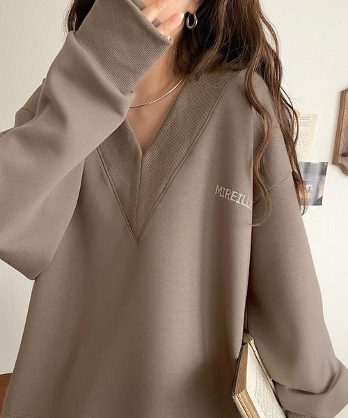 リブ切替を効かせた太めのVネックラインが小顔効果を与えつつ、大人っぽい雰囲気を演出。