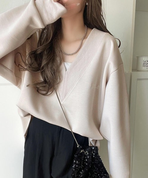 抜け感と上品さを両立。深めのネックで小顔見え♪ 胸刺繍Vネックダンボールニットトップス(長袖) ce1110130