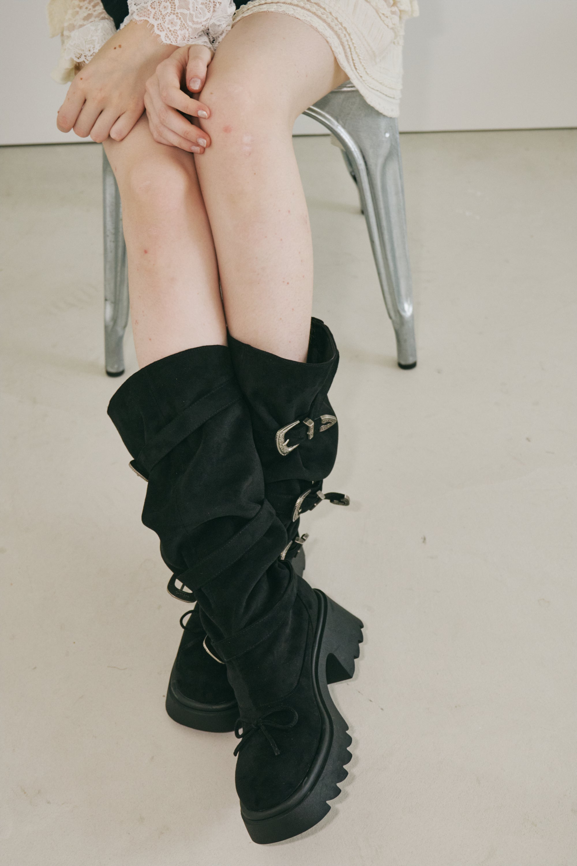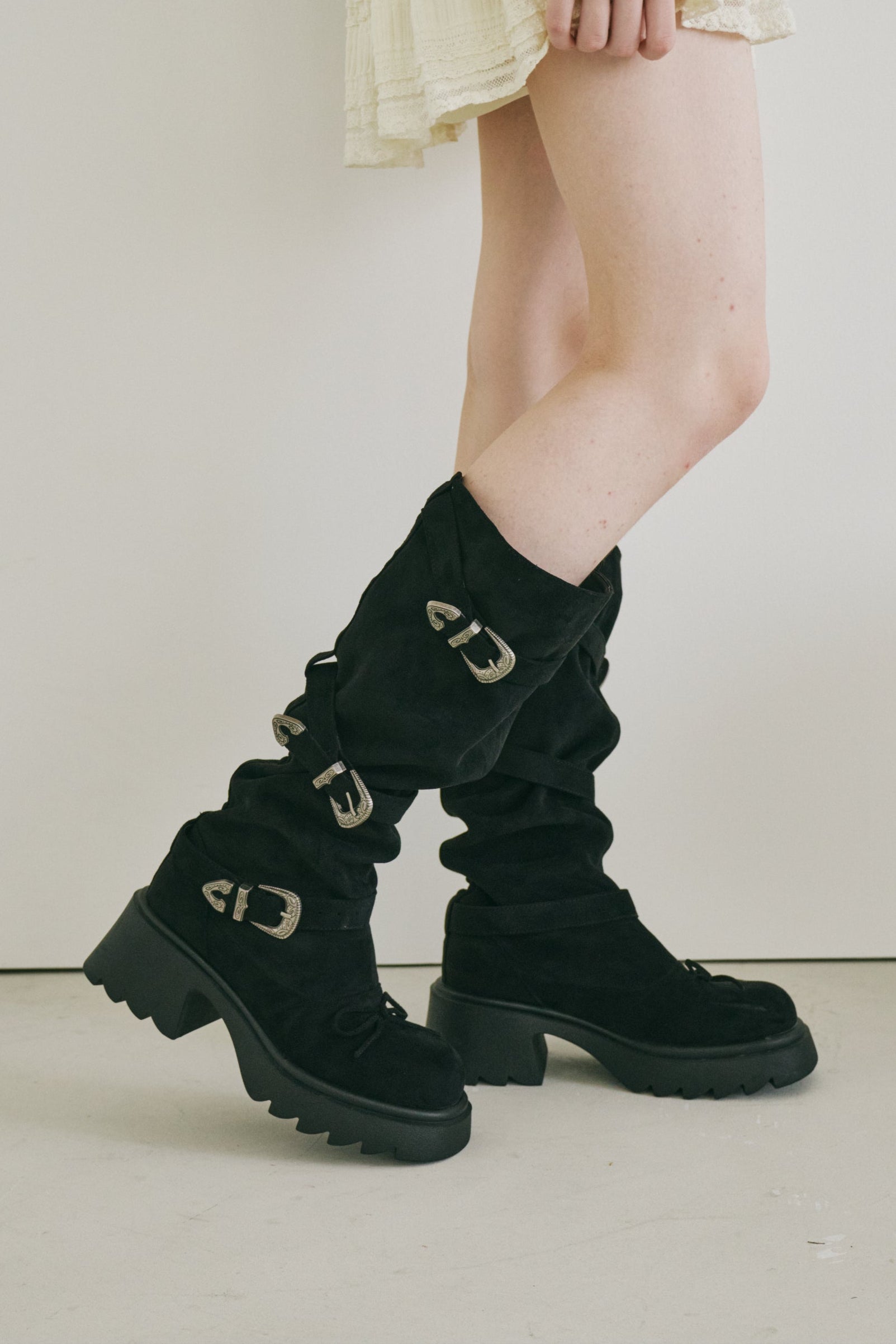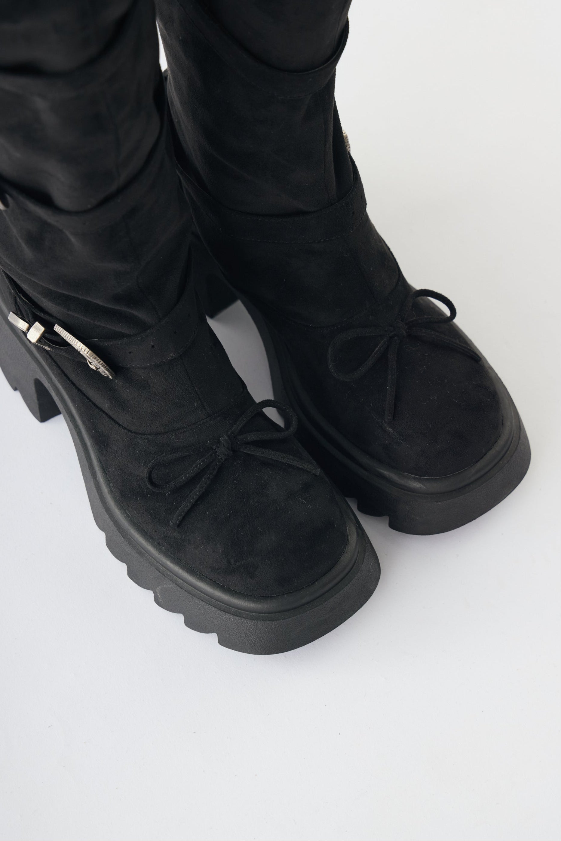 ボリュームのある厚底ソールとスエード素材で、こなれ感を演出できるロングブーツ。