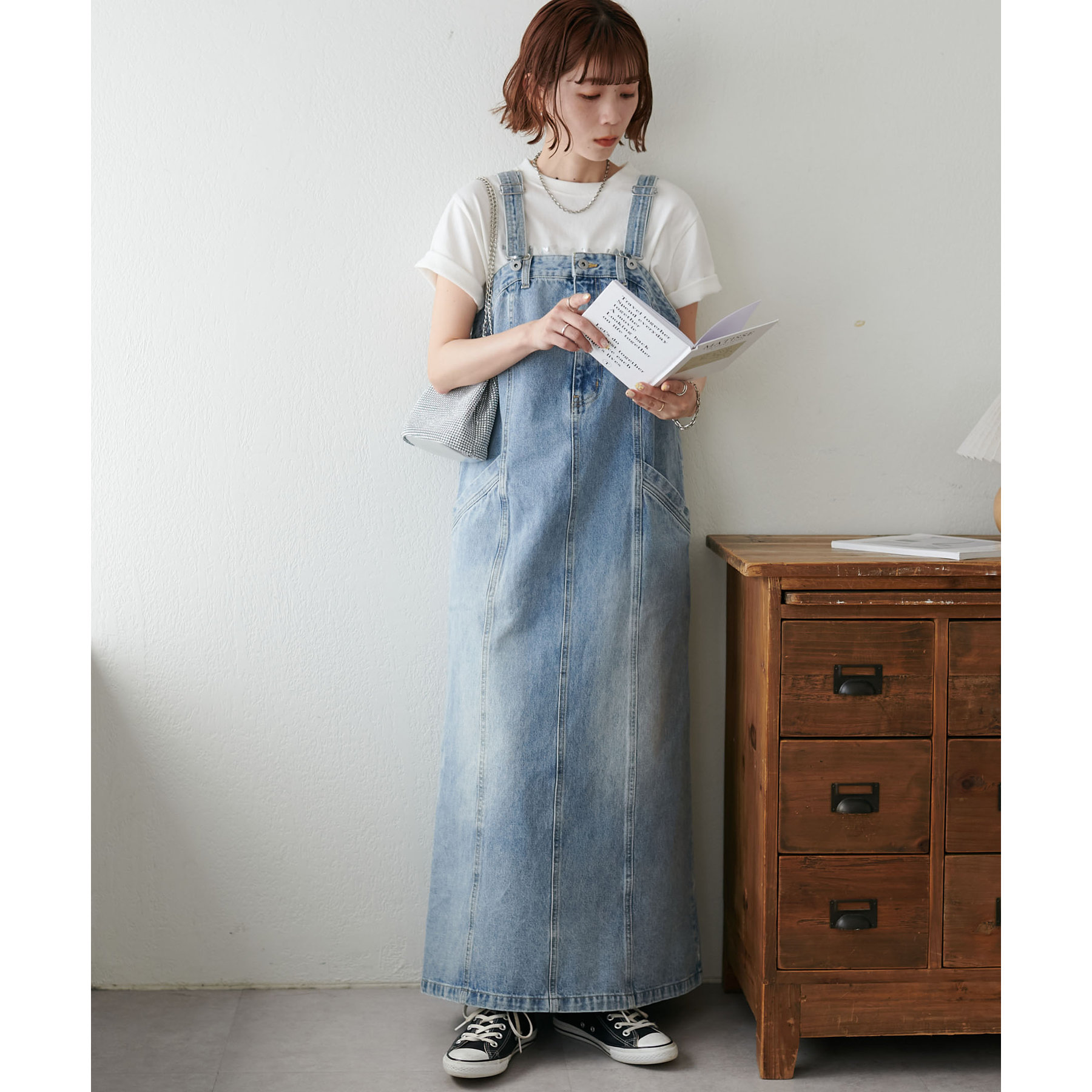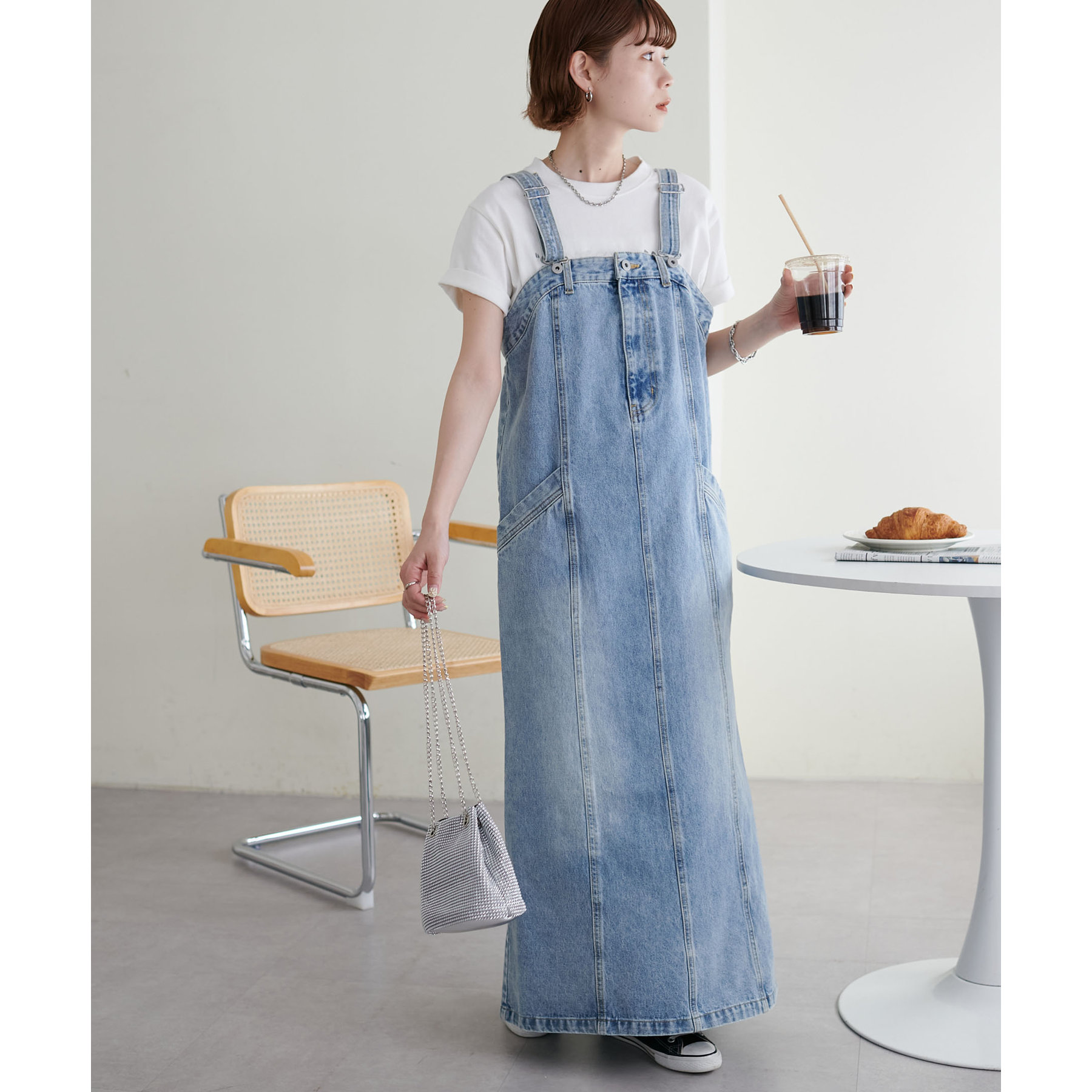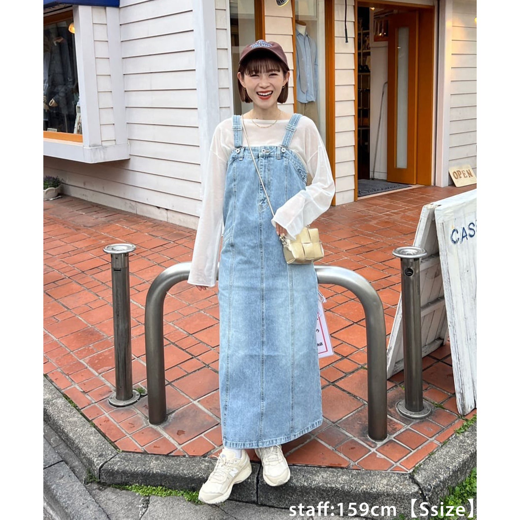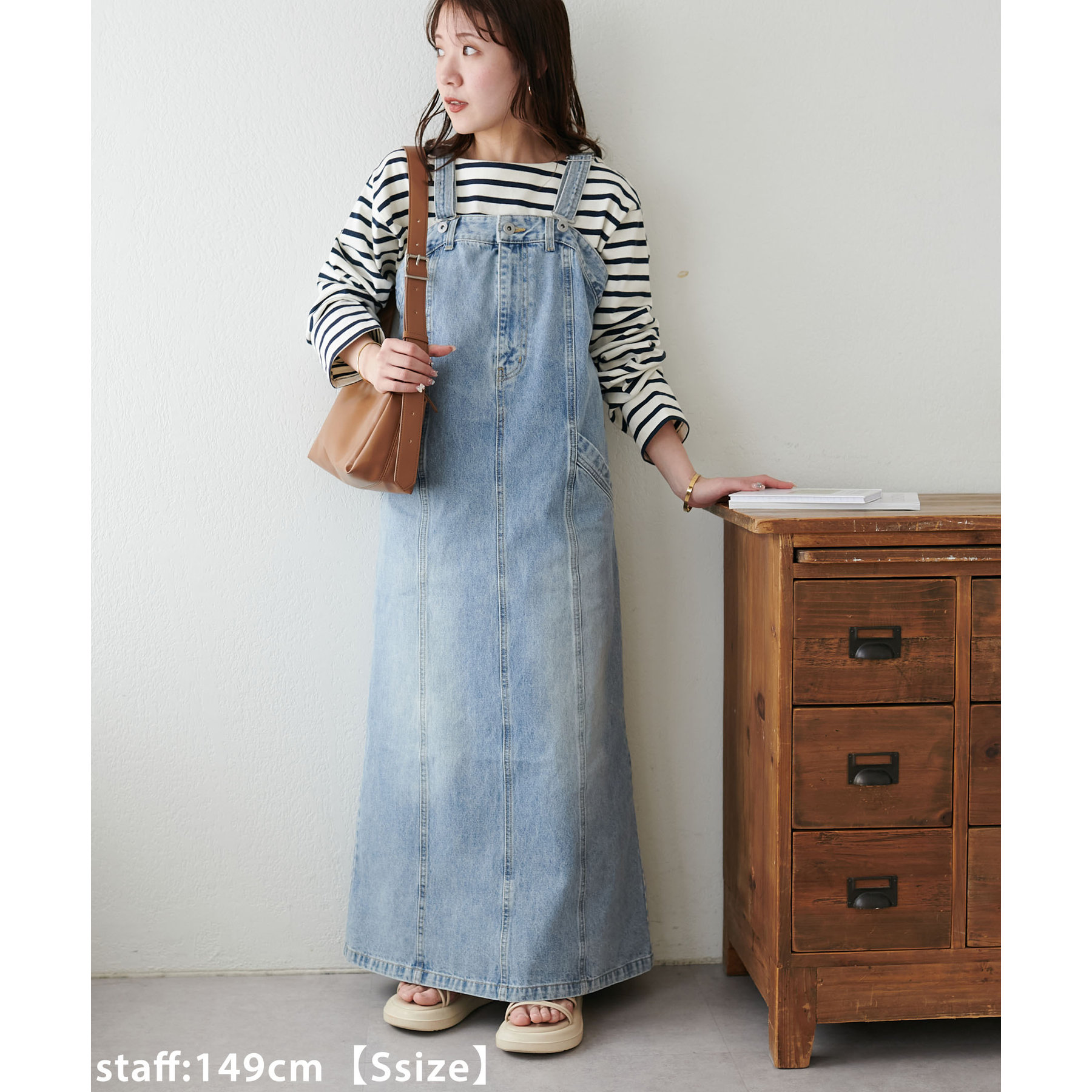 カジュアルながらも、ストンと落ちるすっきりとしたシルエットで女性らしさのある仕上がりに。肩のストラップはワイドデザインでこなれ感を演出します。バックスリットが入っているので足捌きも楽ちん◎季節問わず使えるデニムアイテムは、一着持っていれば着まわしやすい優秀アイテムです。カラーは合わせやすい定番のサックスブルーをご用意いたしました。