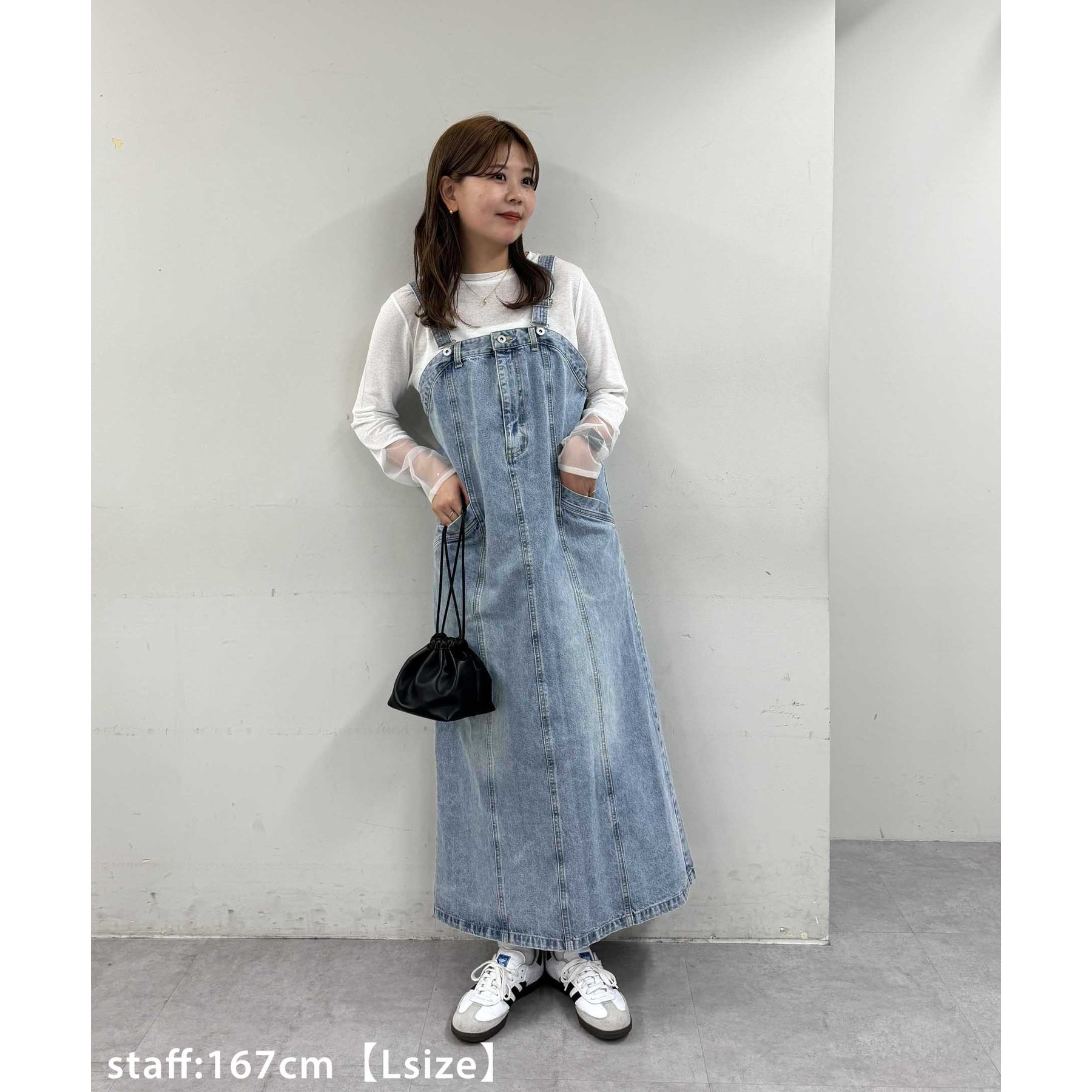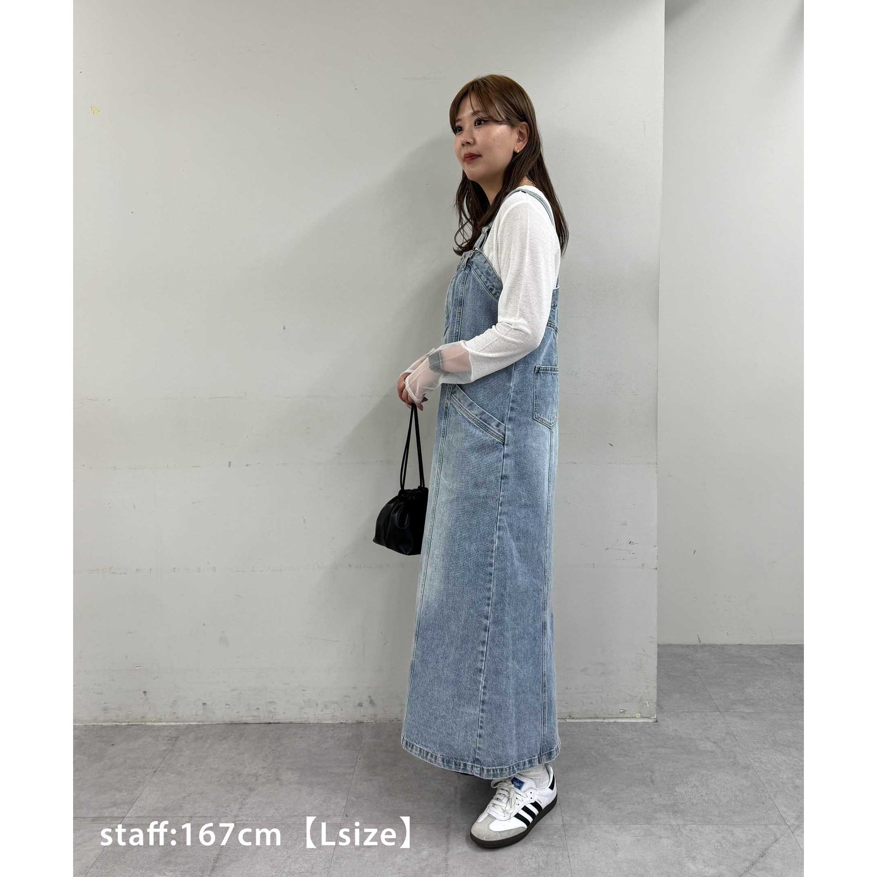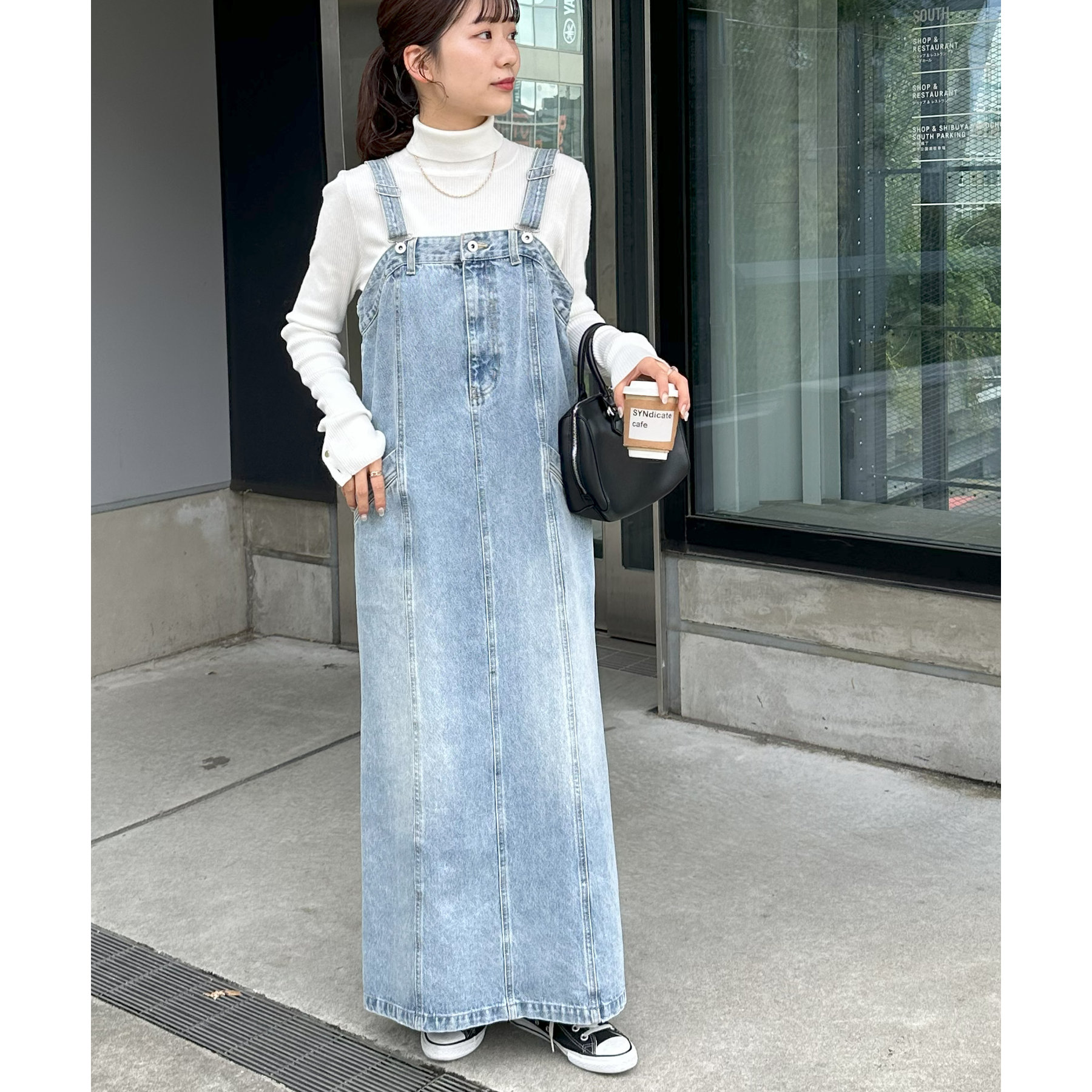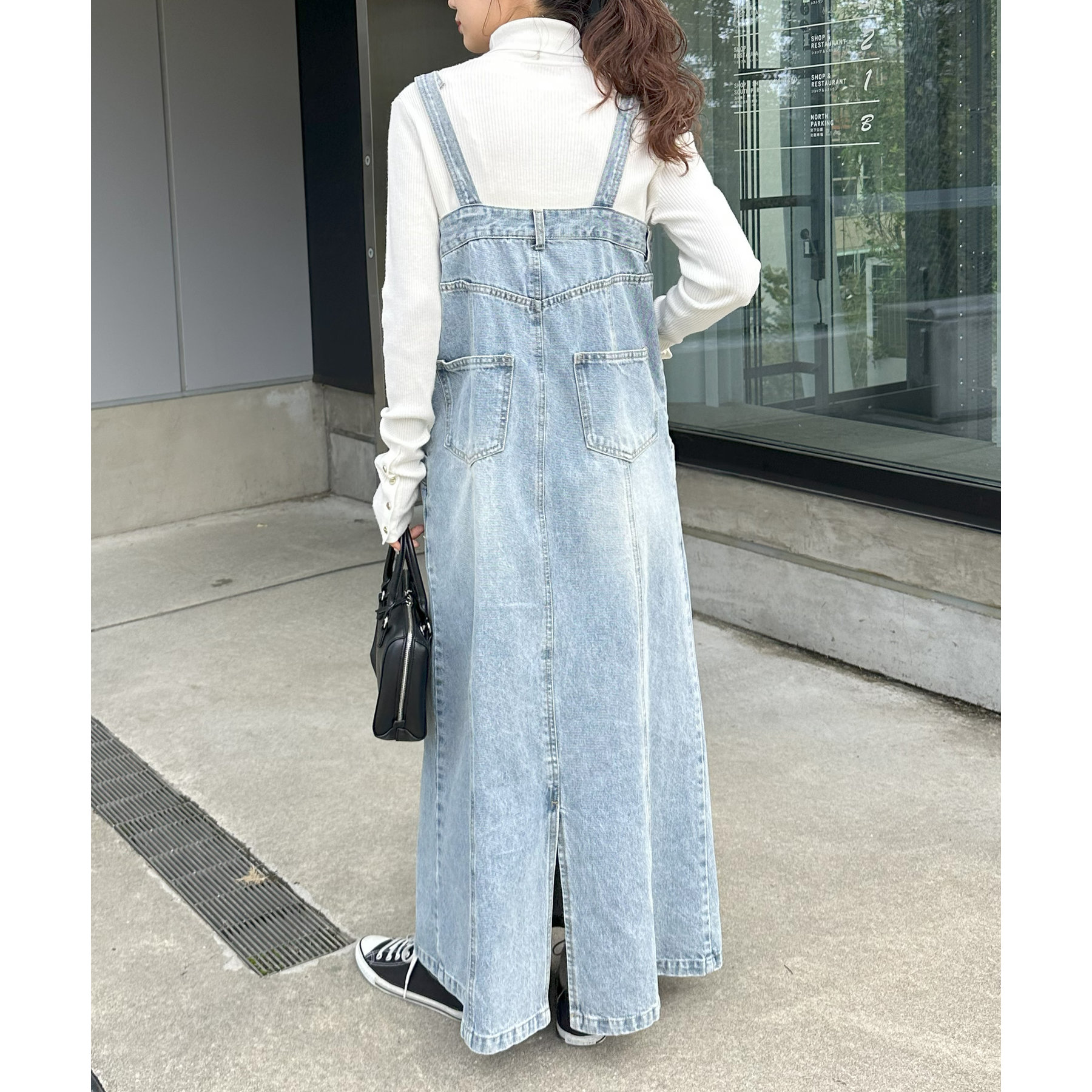 カジュアルながらも、ストンと落ちるすっきりとしたシルエットで女性らしさのある仕上がりに。肩のストラップはワイドデザインでこなれ感を演出します。バックスリットが入っているので足捌きも楽ちん◎季節問わず使えるデニムアイテムは、一着持っていれば着まわしやすい優秀アイテムです。カラーは合わせやすい定番のサックスブルーをご用意いたしました。
