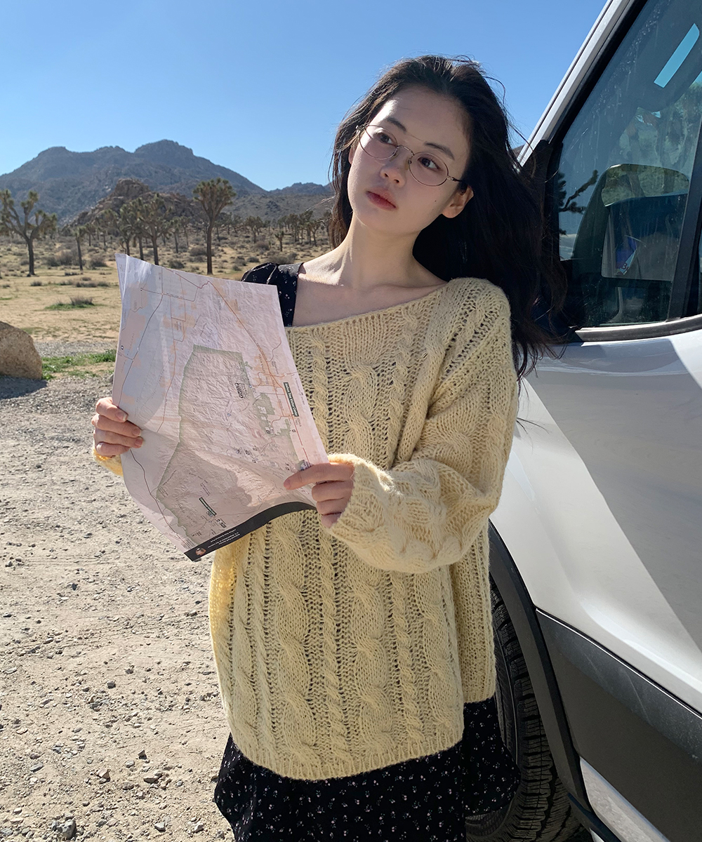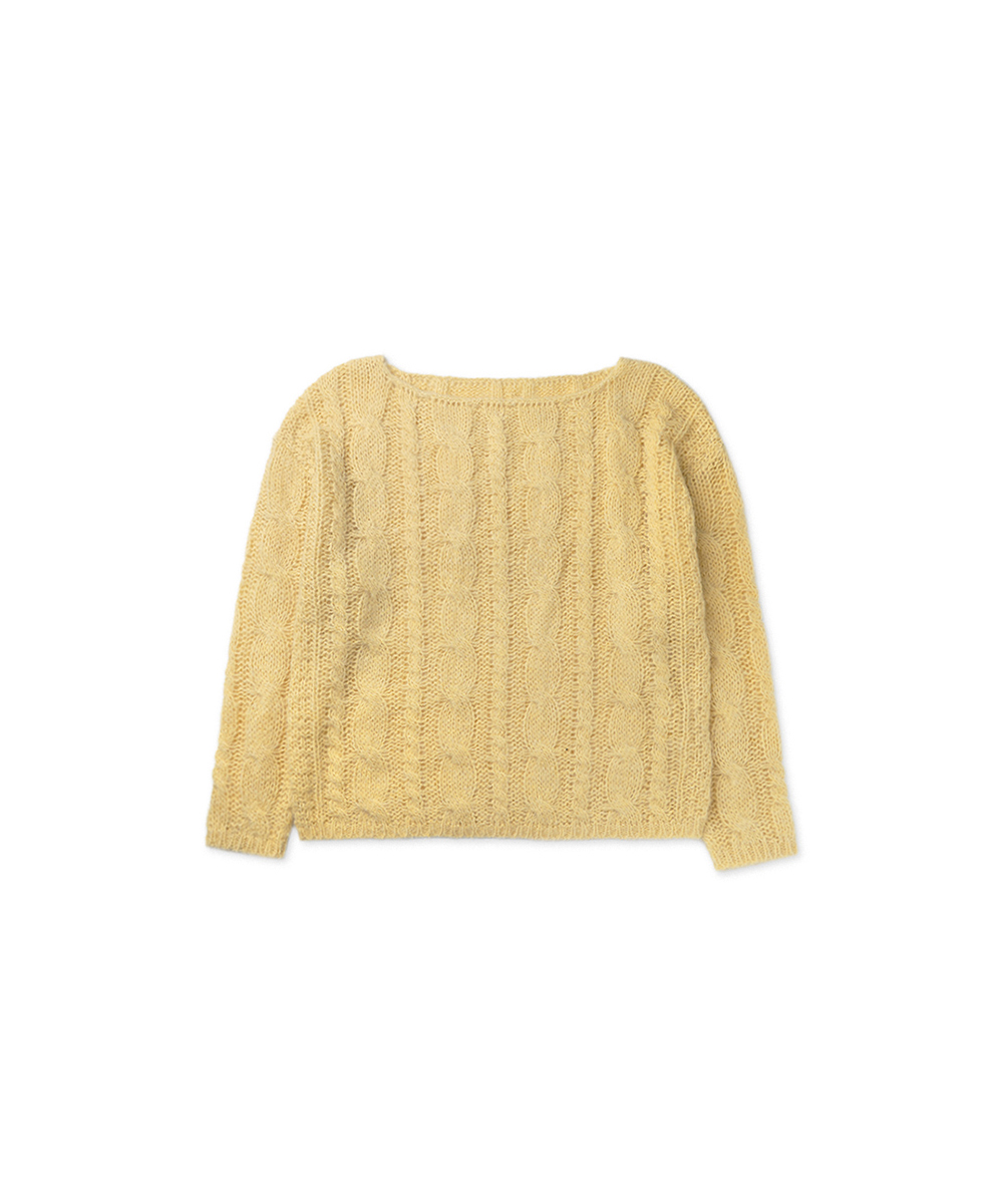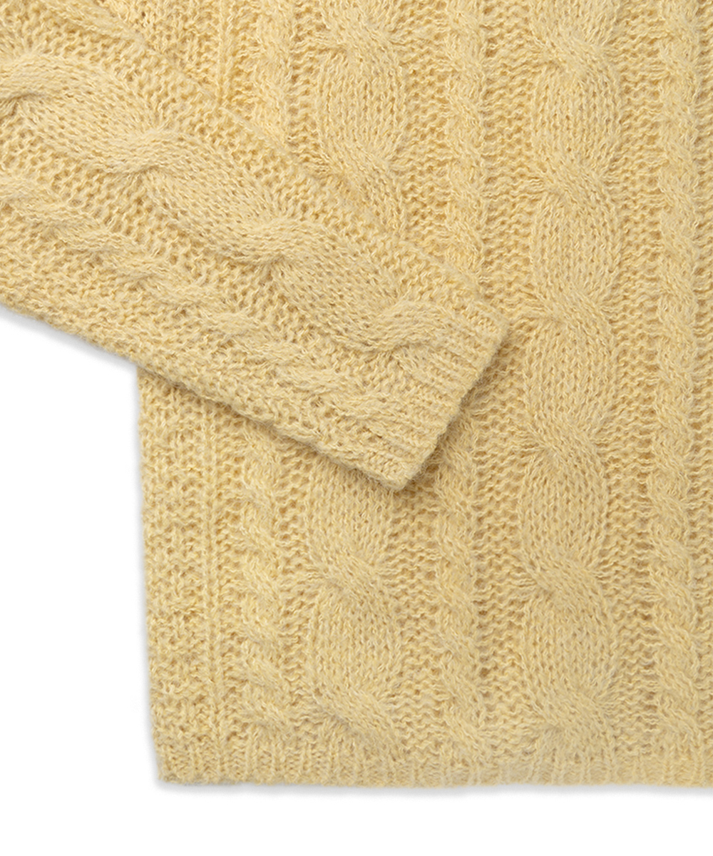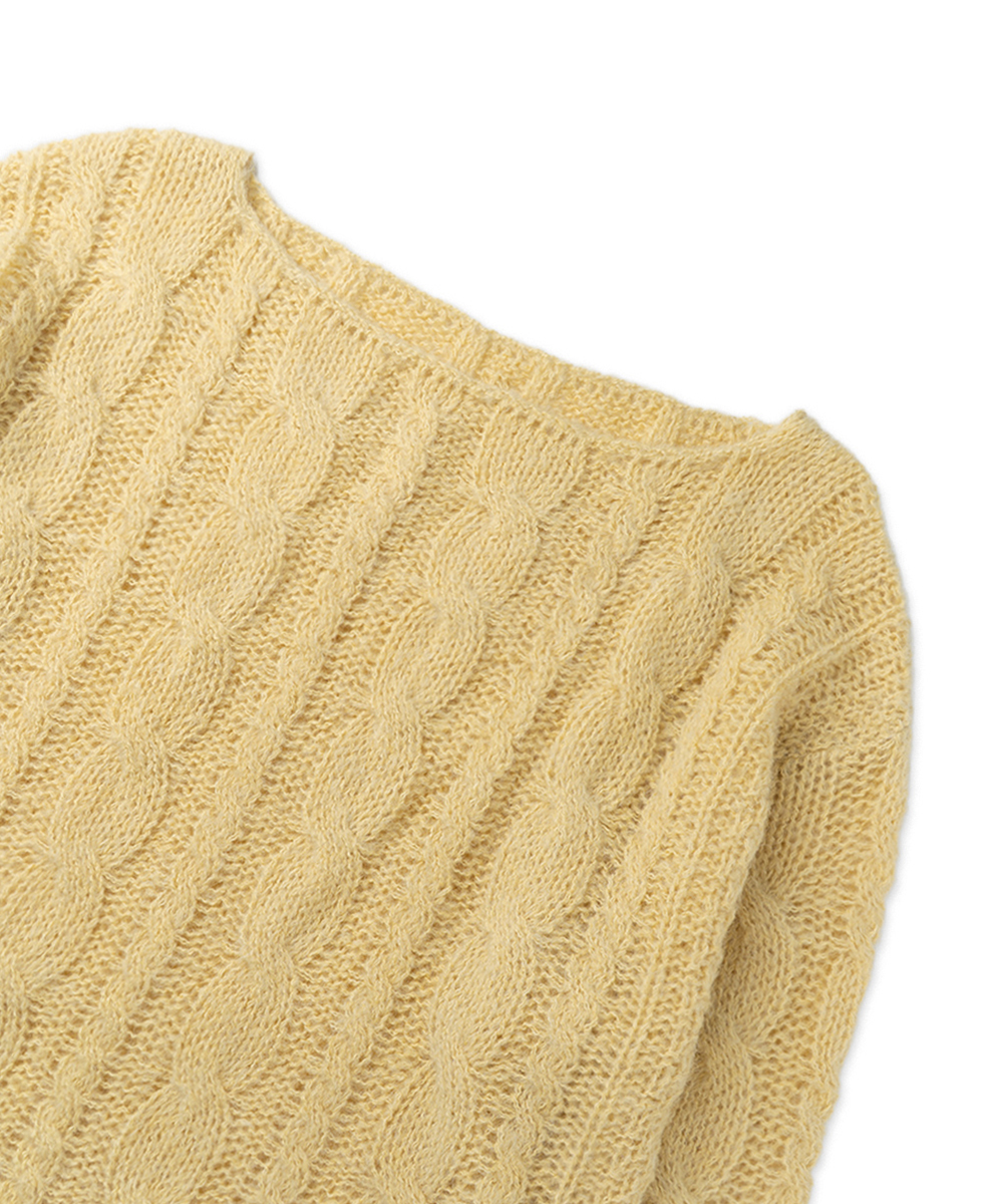 温もりのあるケーブル編みと、ふんわりとしたヘアリーな素材感、クラシックなシルエットが調和したデザイン。