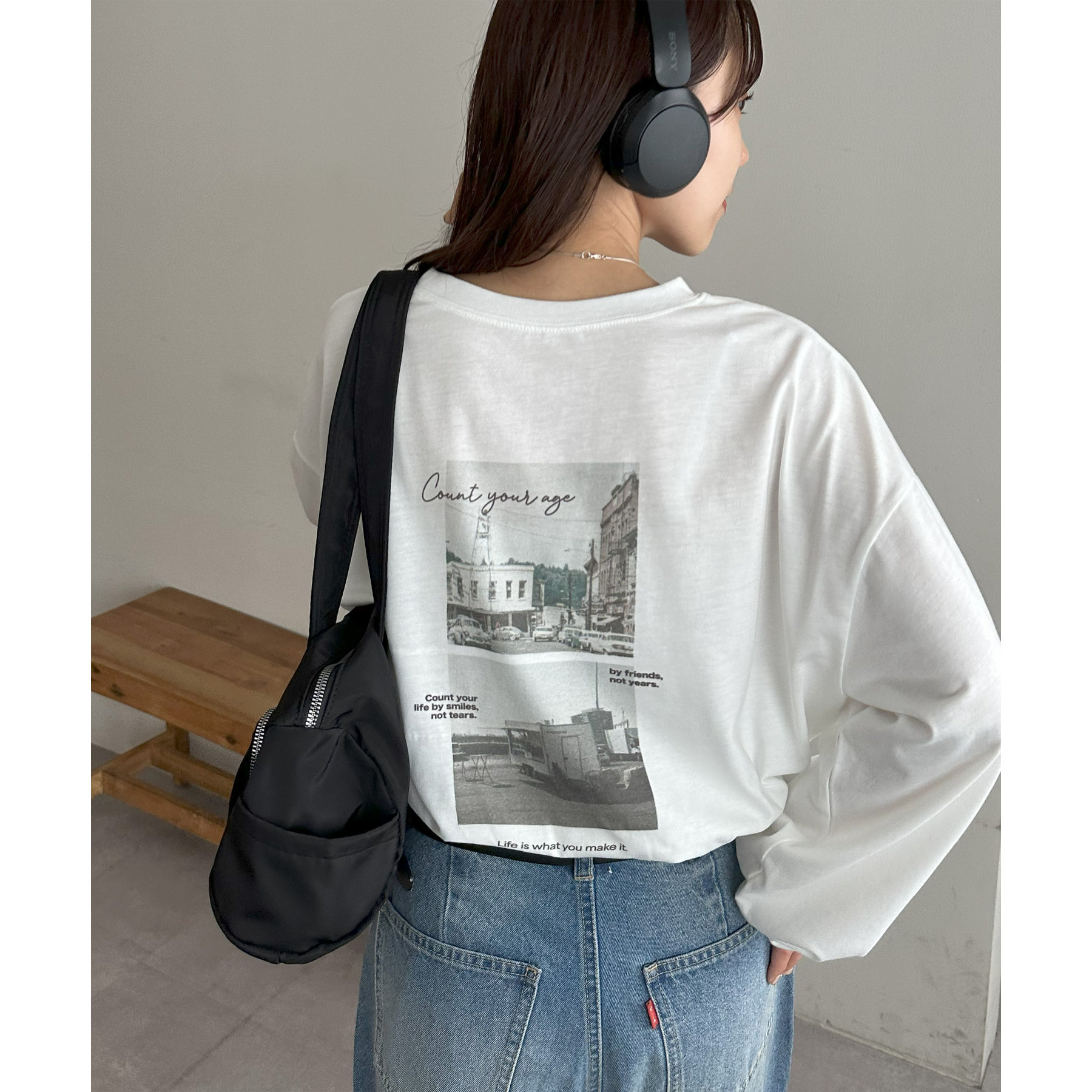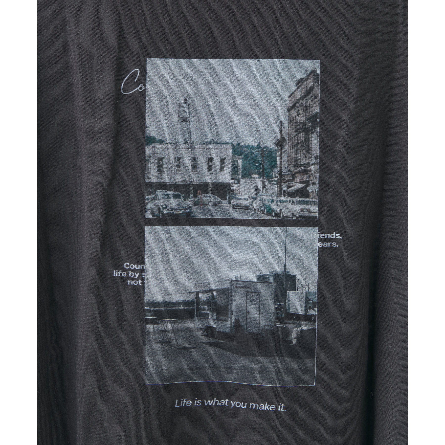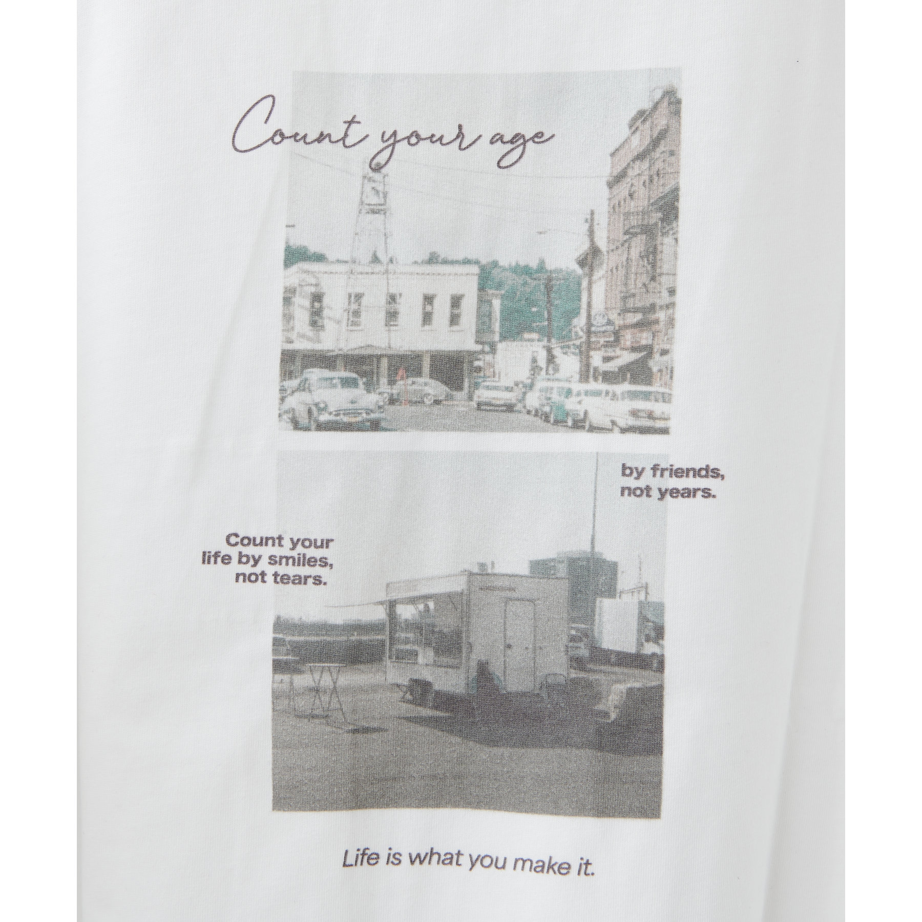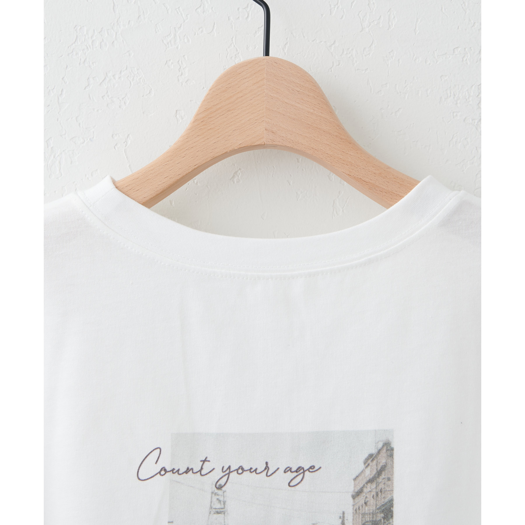ヴィンテージライクな雰囲気を漂わせる、街並みのフォトプリントがスタイリングのアクセントに。フロントはシンプルに無地で仕上げているので、どんなボトムスともバランスがとりやすいのも魅力◎