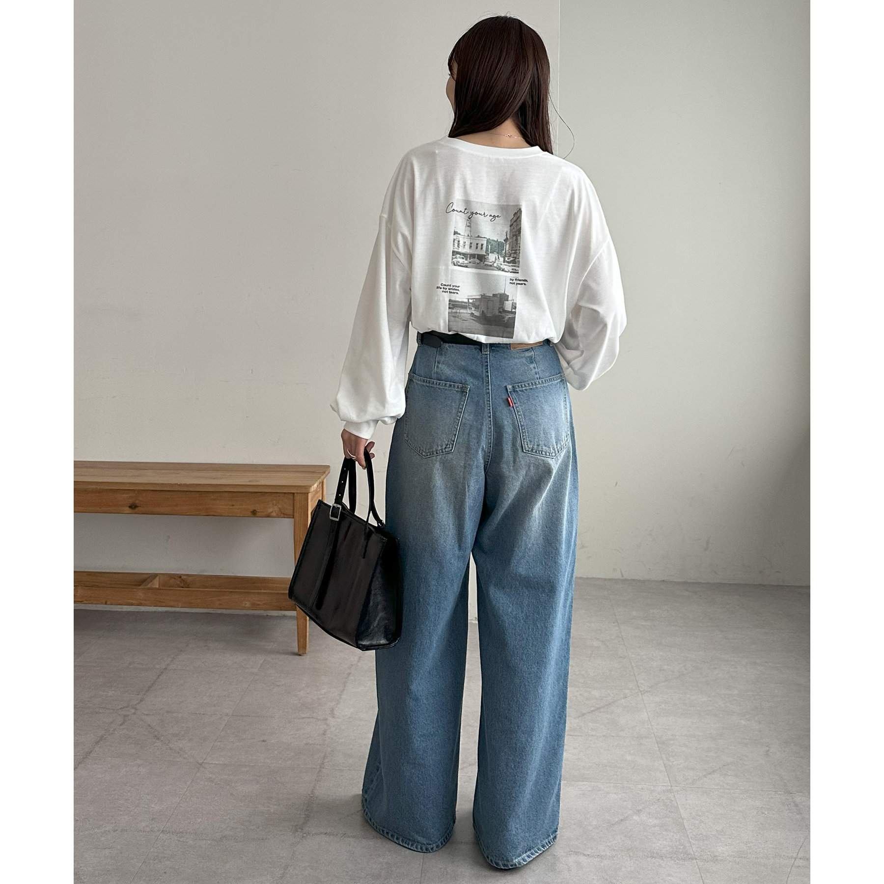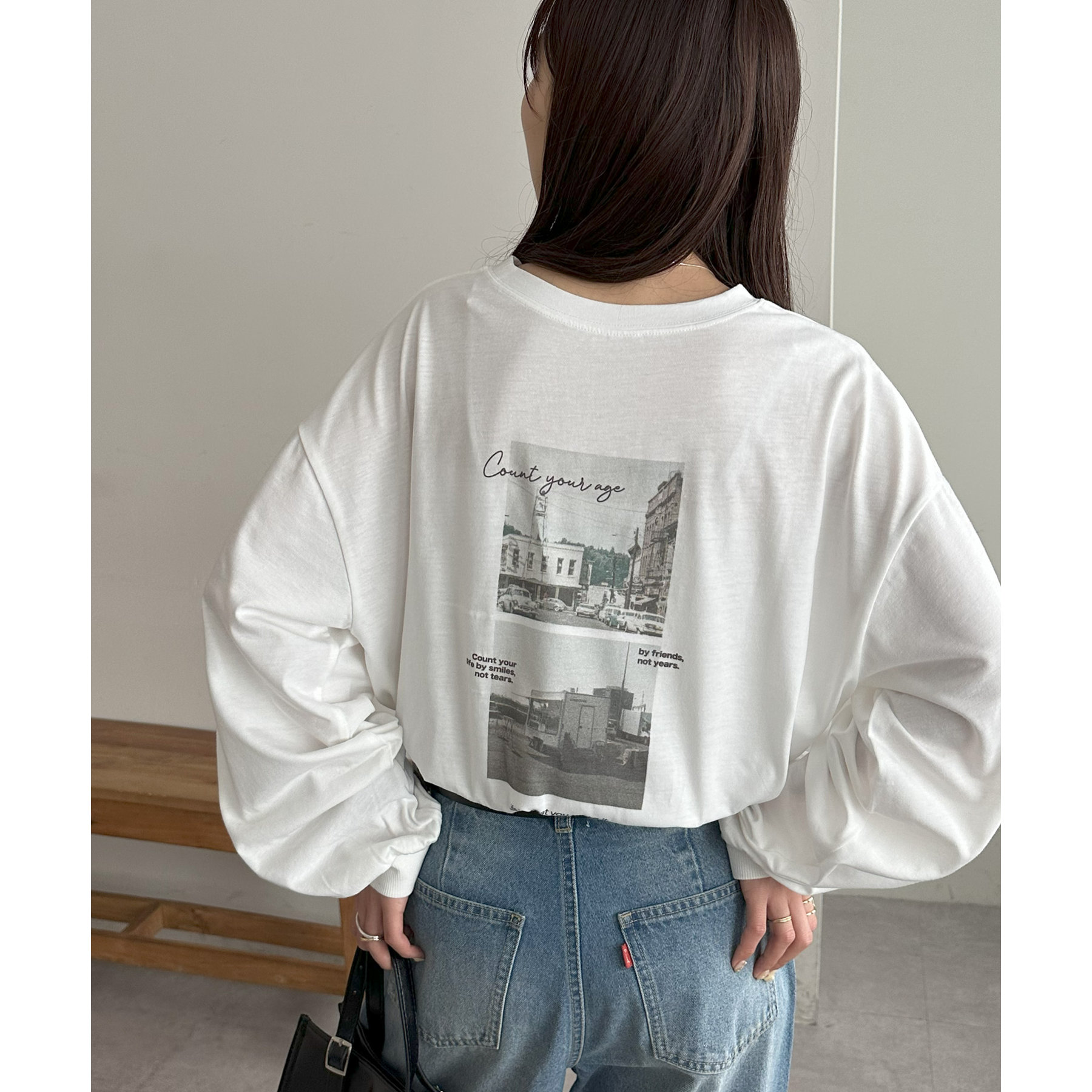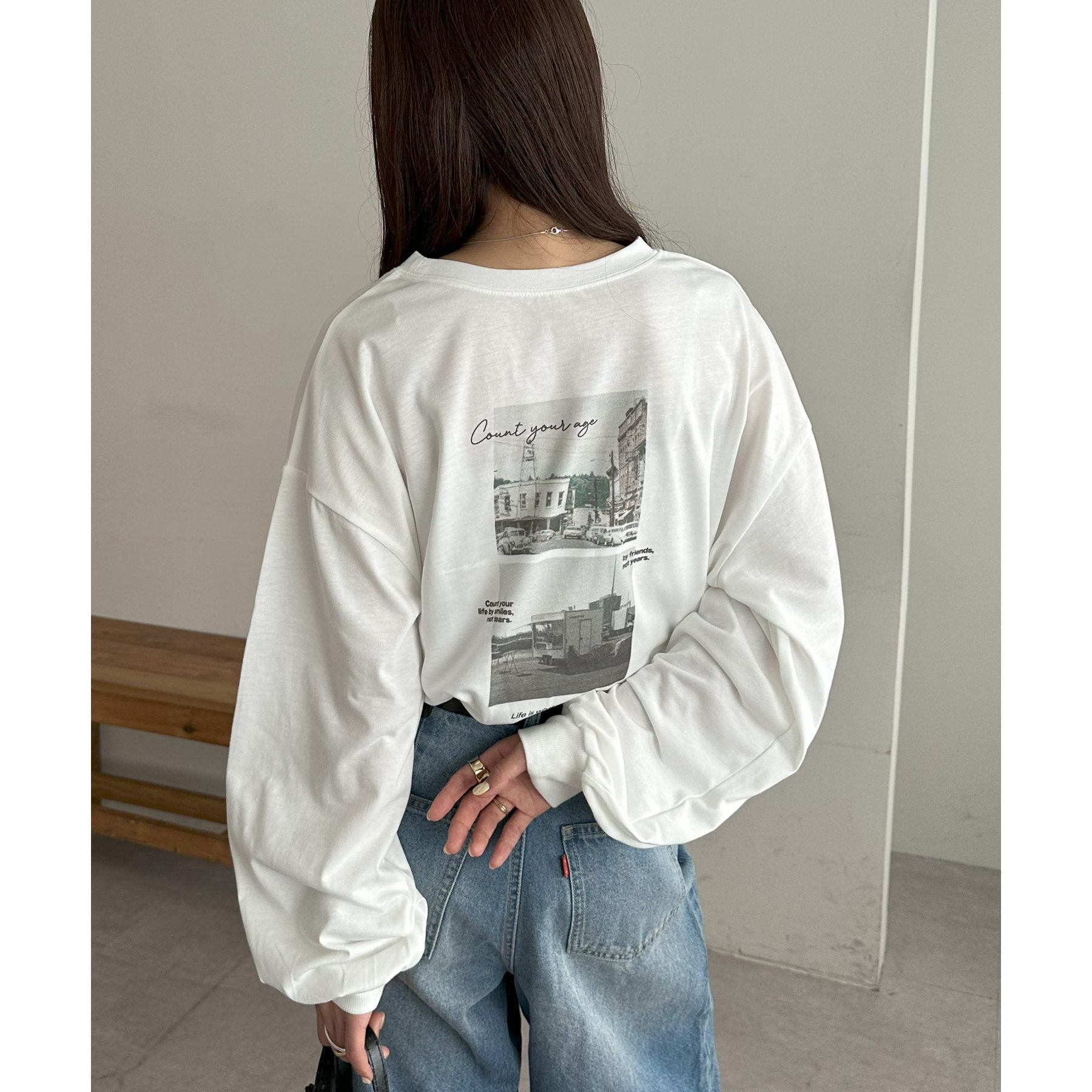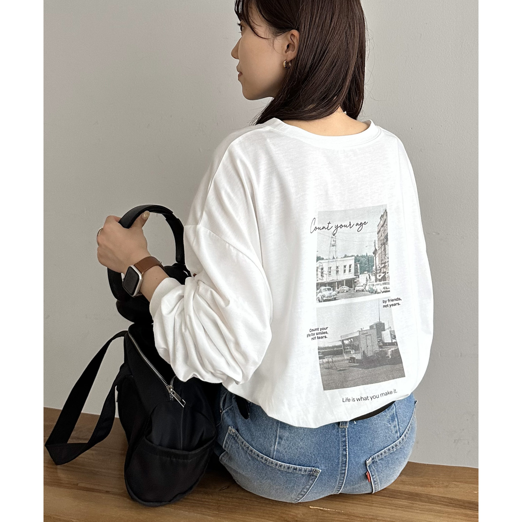 ヴィンテージライクな雰囲気を漂わせる、街並みのフォトプリントがスタイリングのアクセントに。フロントはシンプルに無地で仕上げているので、どんなボトムスともバランスがとりやすいのも魅力◎