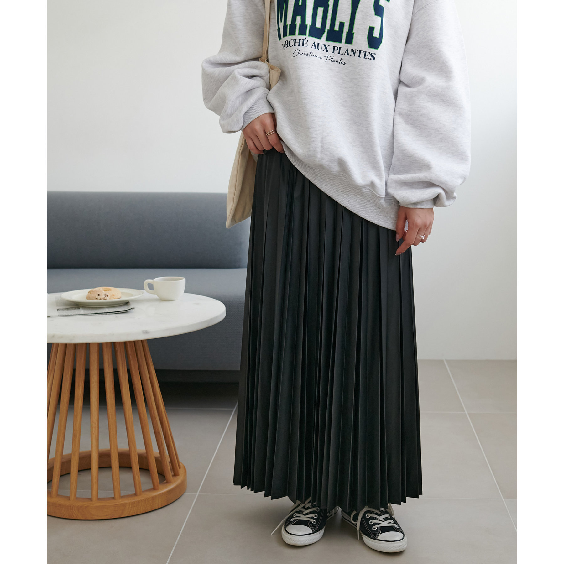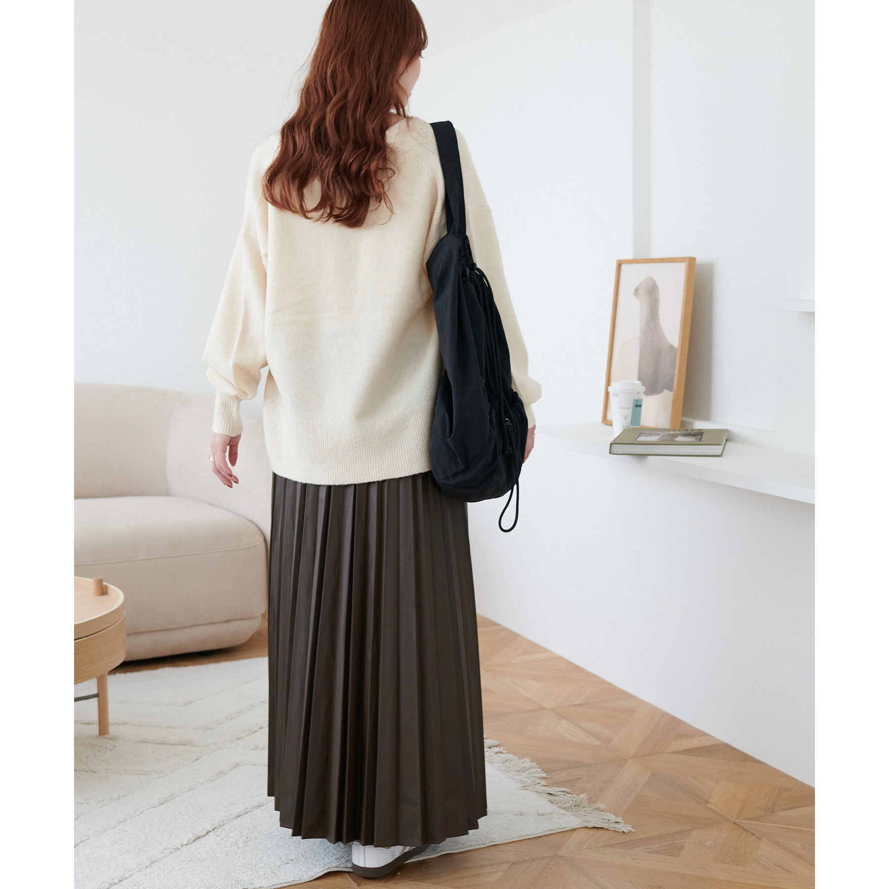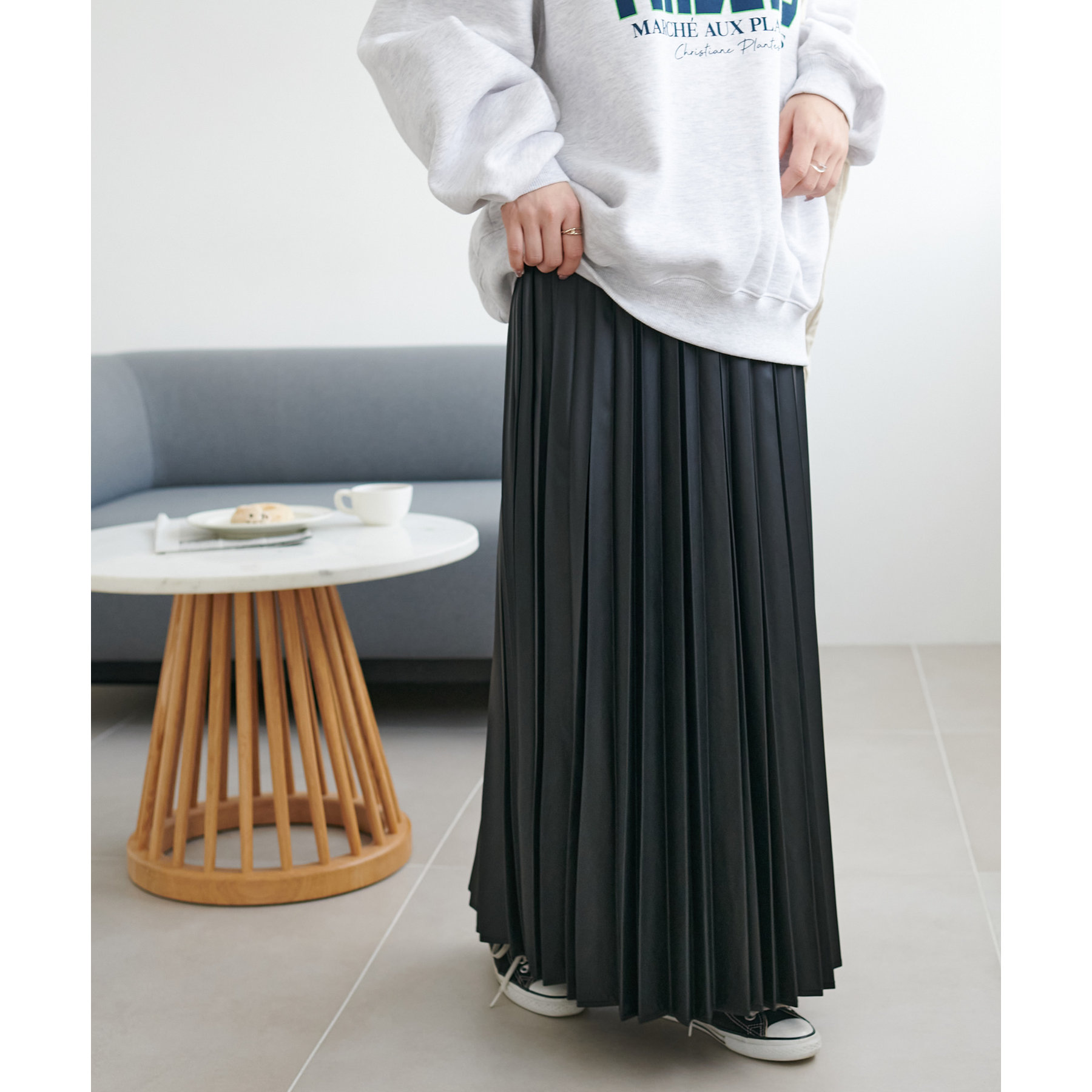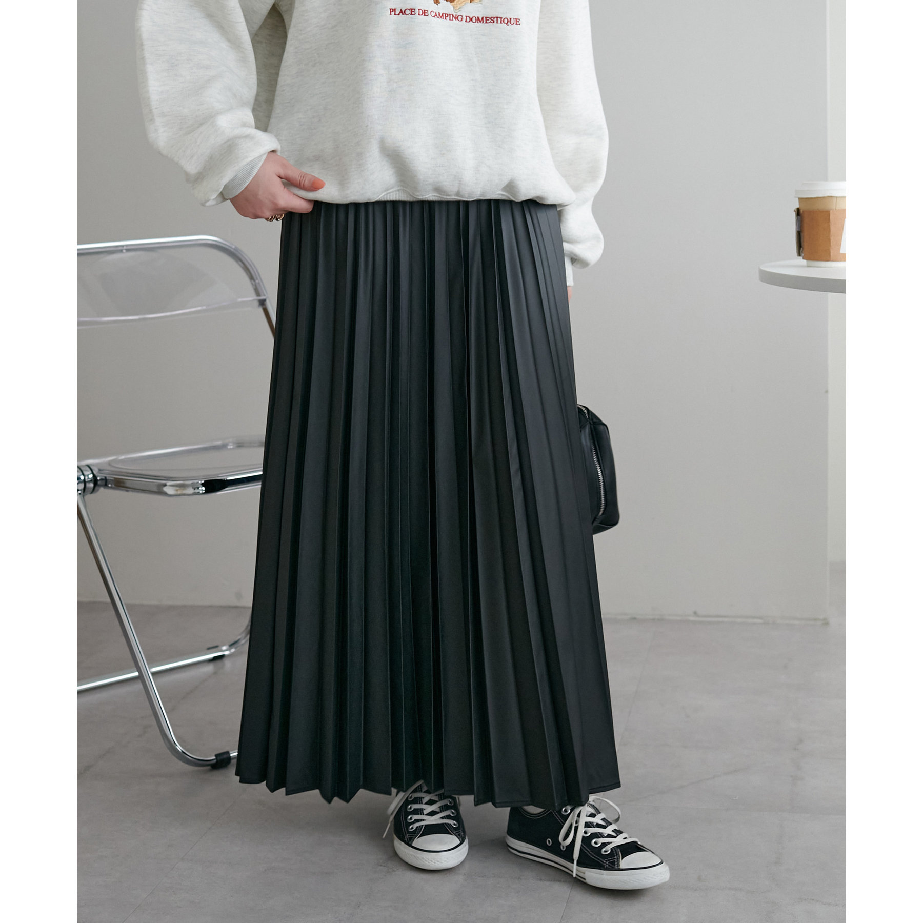 広がりすぎないシルエットとプリーツの縦ライン効果ですっきり見えし体型カバーも叶えます。