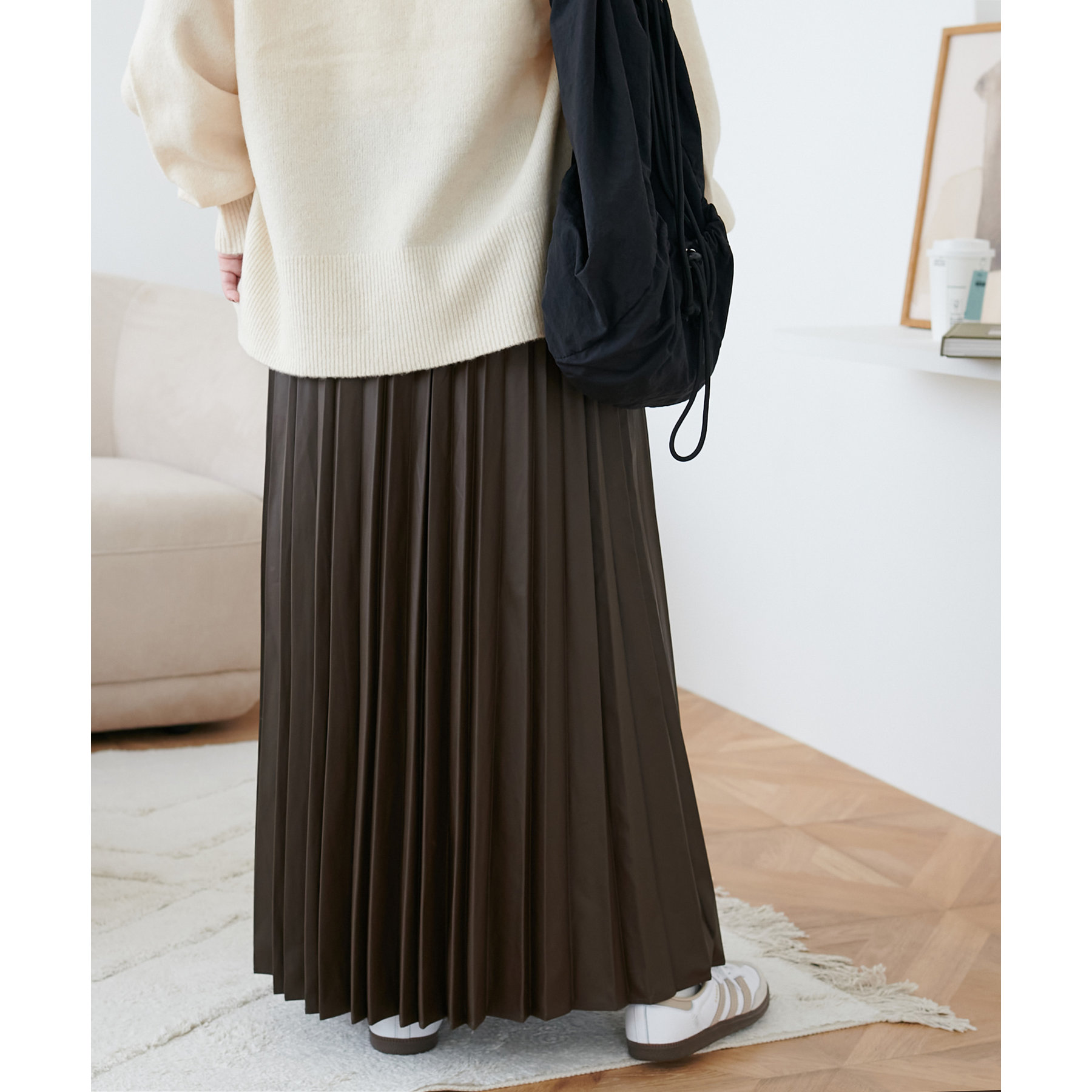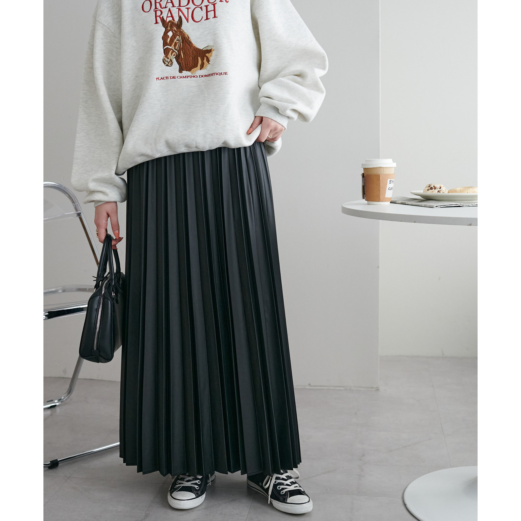 154cmスタッフ:フェイクレザーなので、プリーツスカートですが甘くならず大人でも着ていただきやすいスカートです。