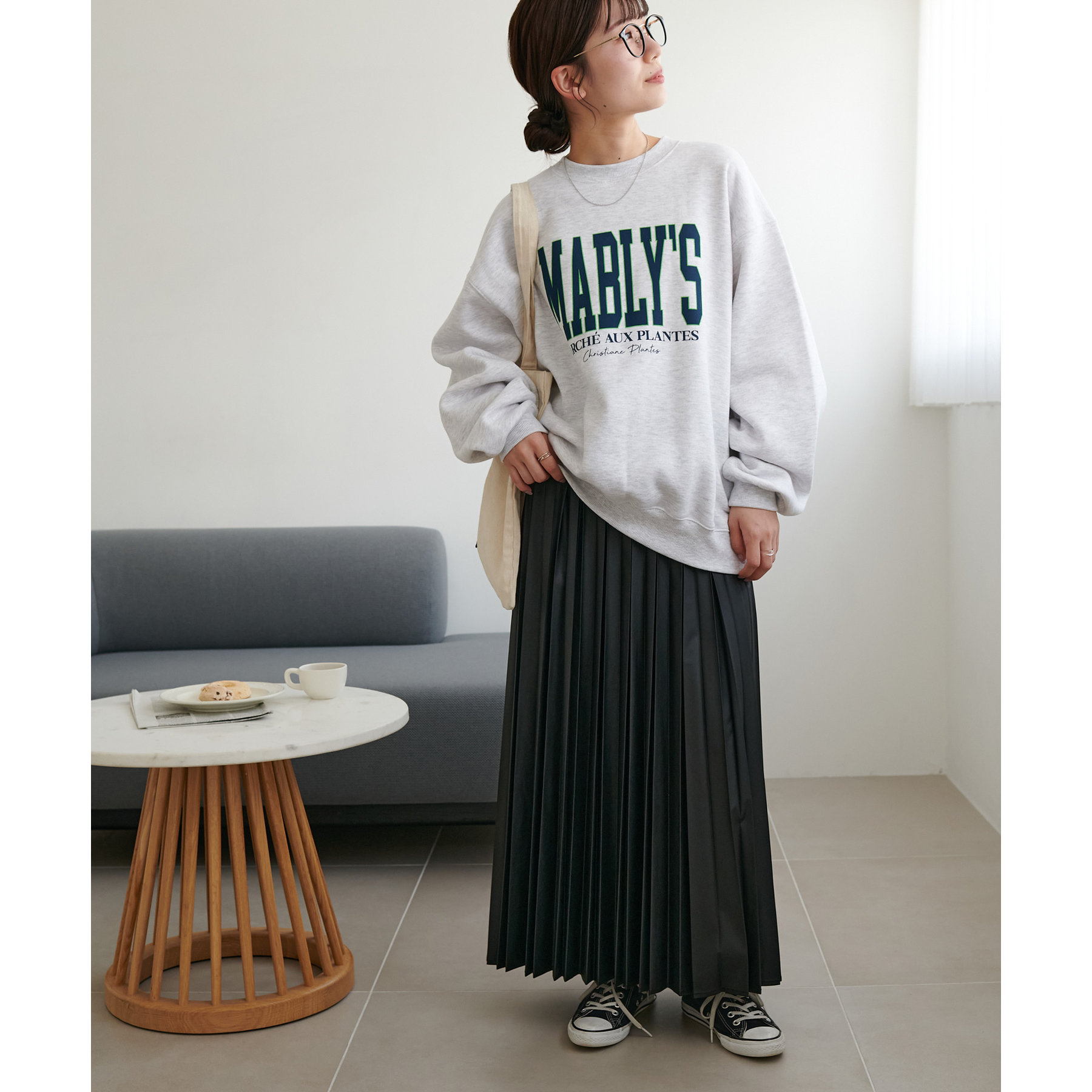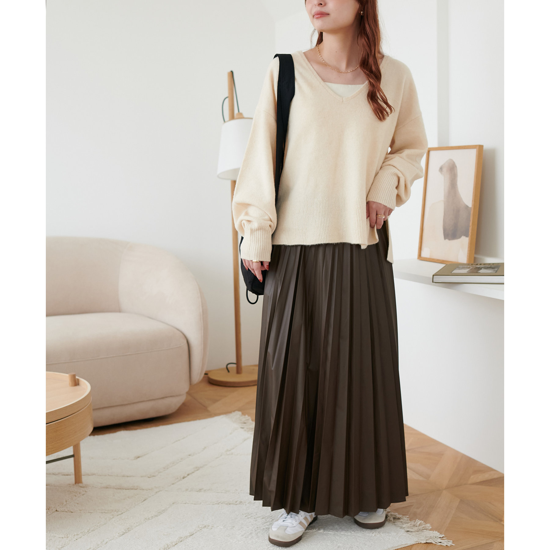 動くたびに揺れ感の出るプリーツスカートで軽やかな印象に◎
