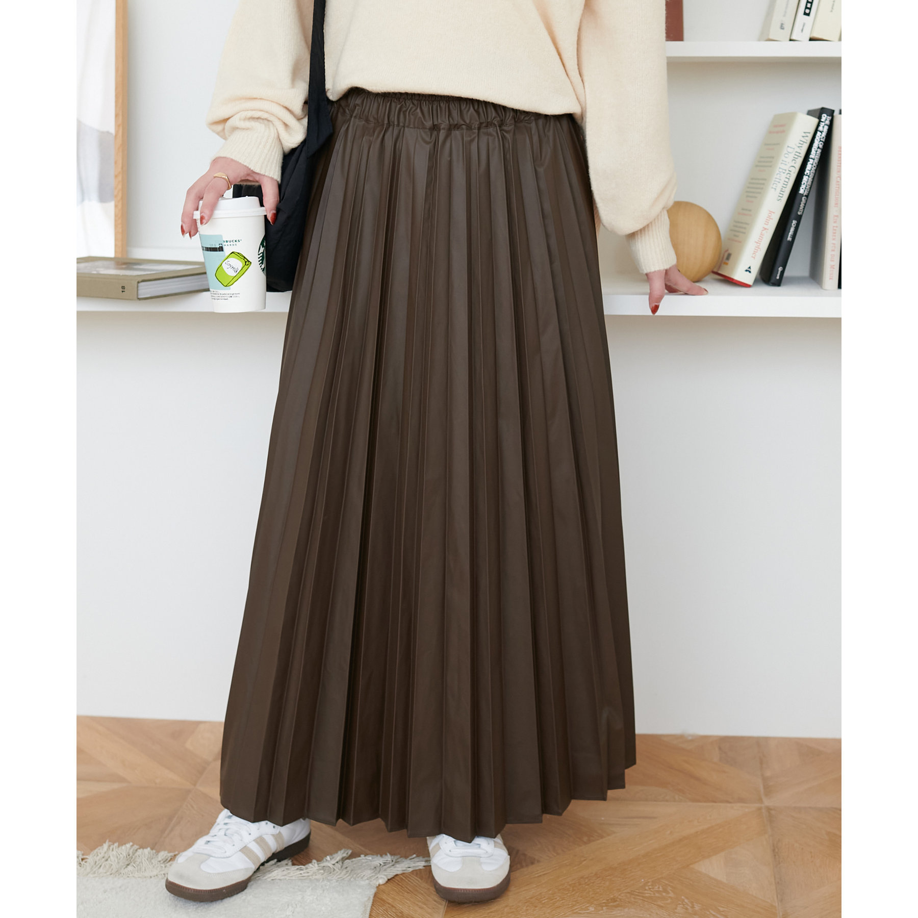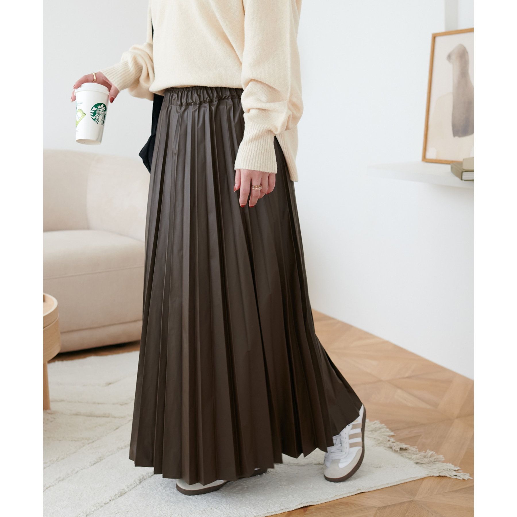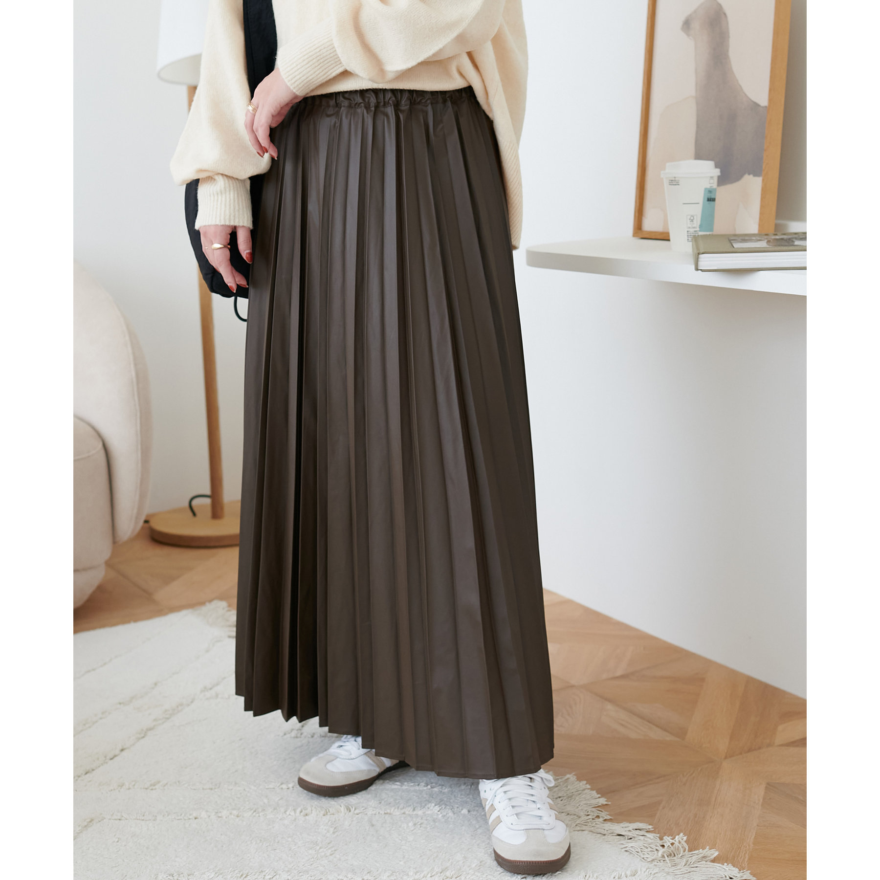 コーデの高級感をアップさせる、上品なツヤのある質感が特徴のプリーツスカート。
