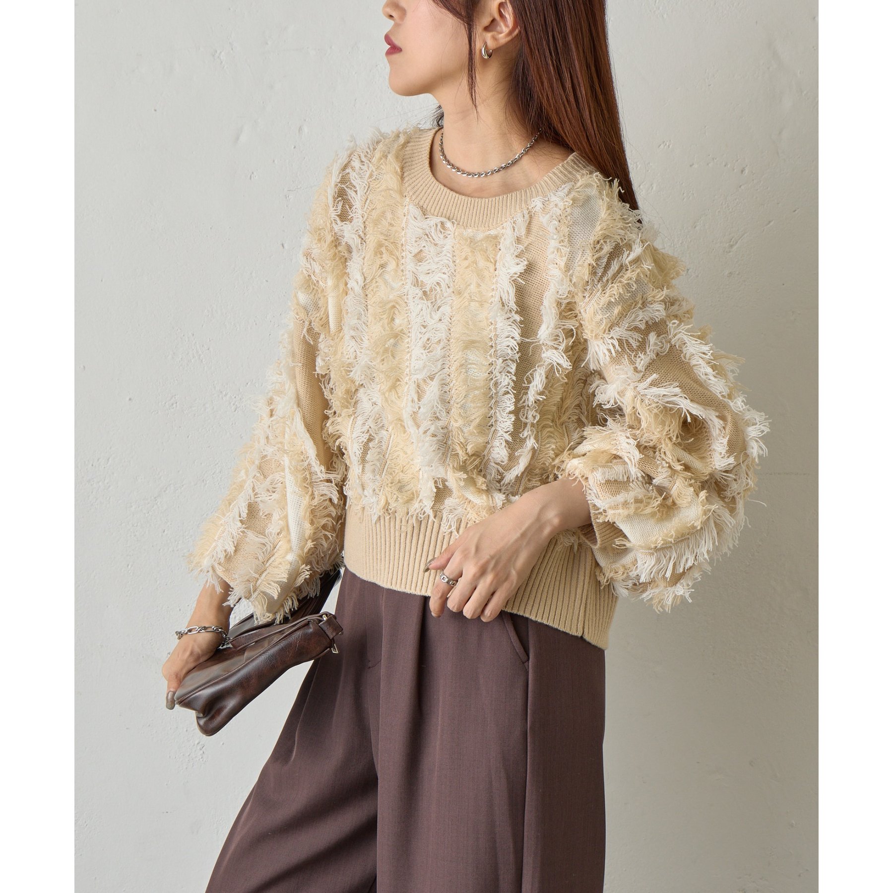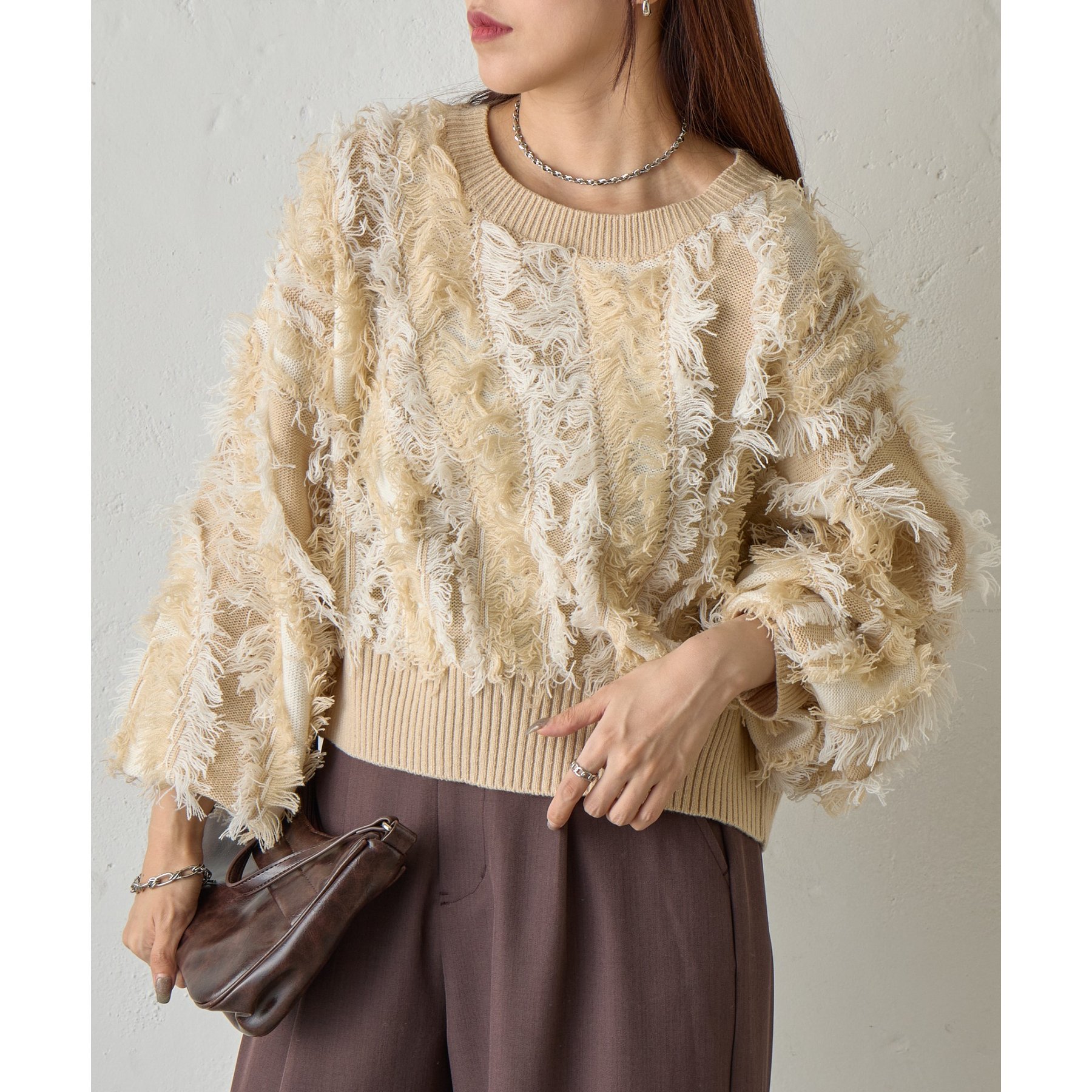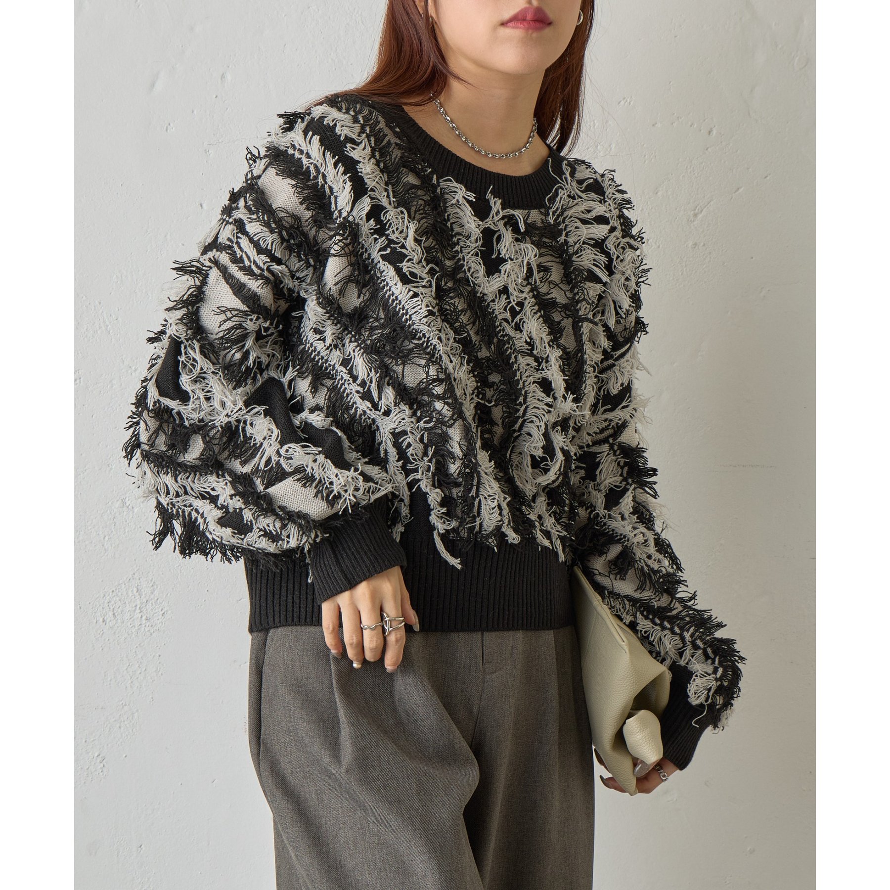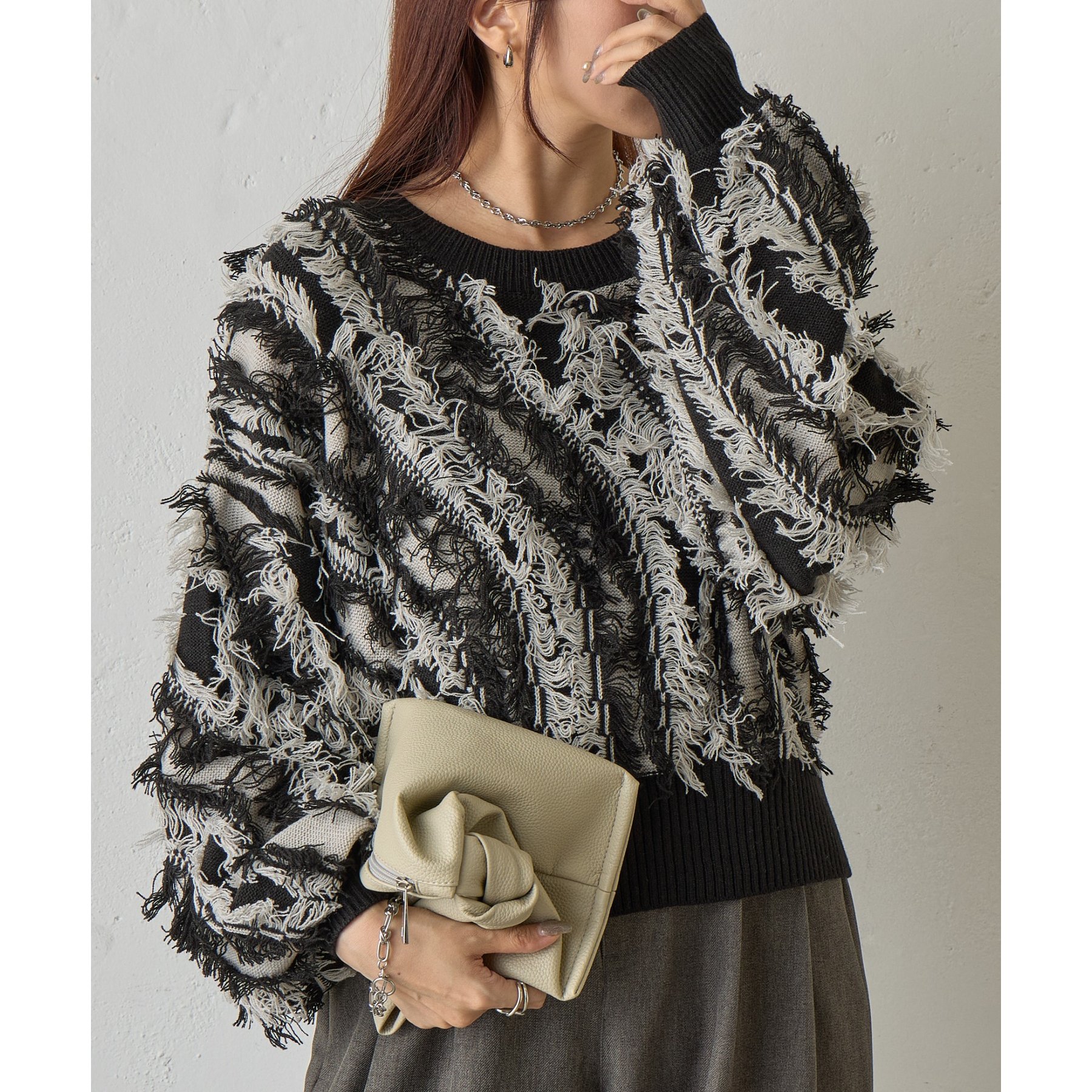 バイカラーのフリンジとウェーブデザインがポイントのニットプルオーバーです。