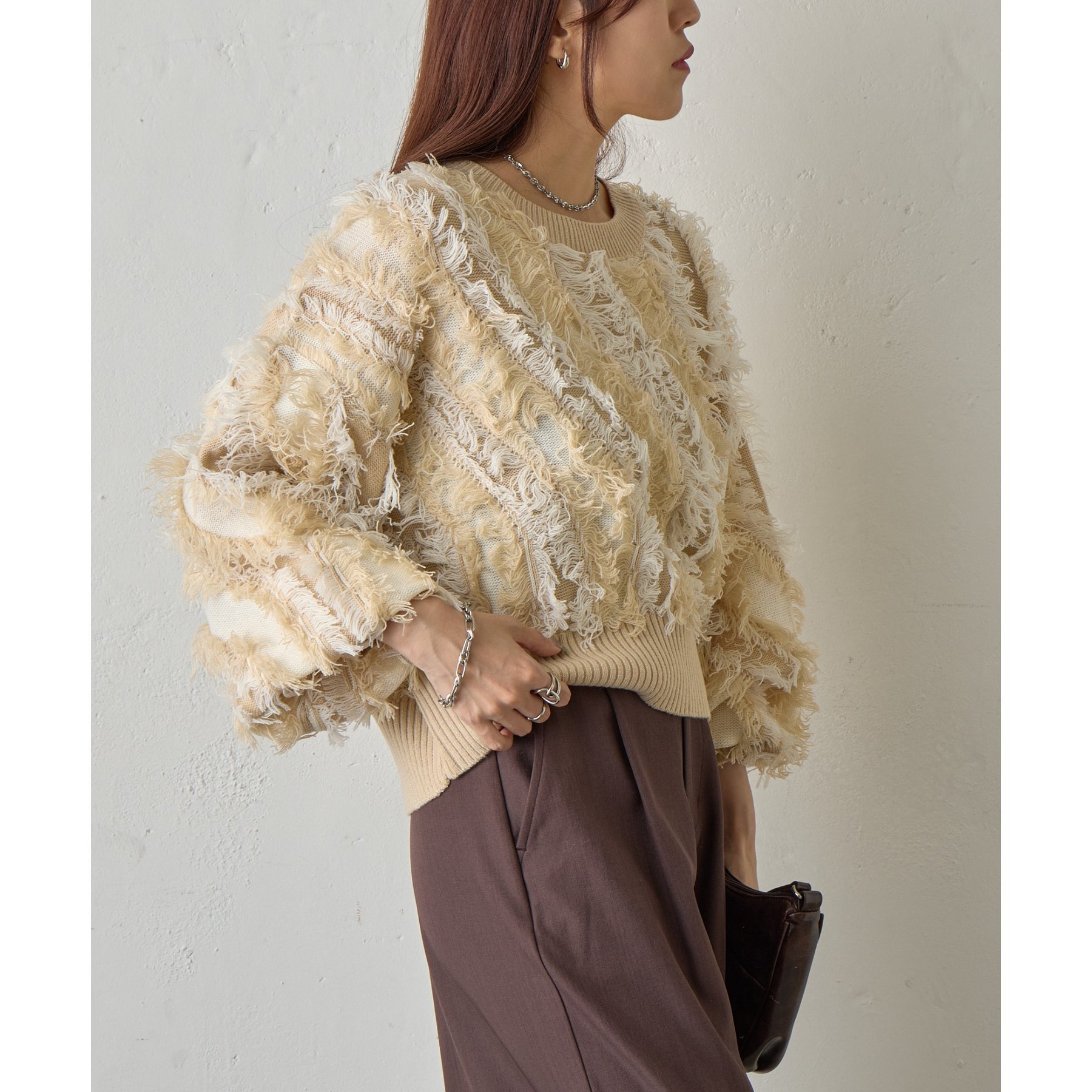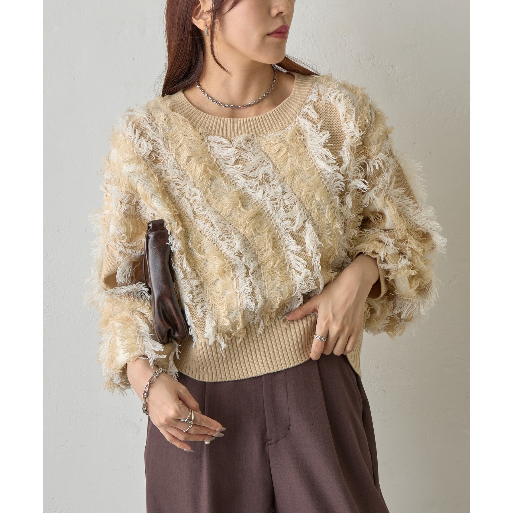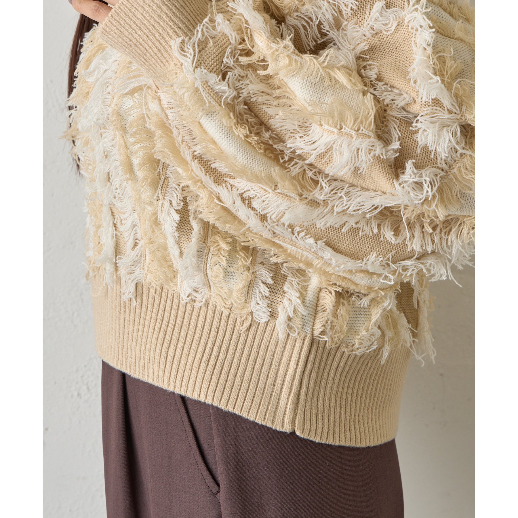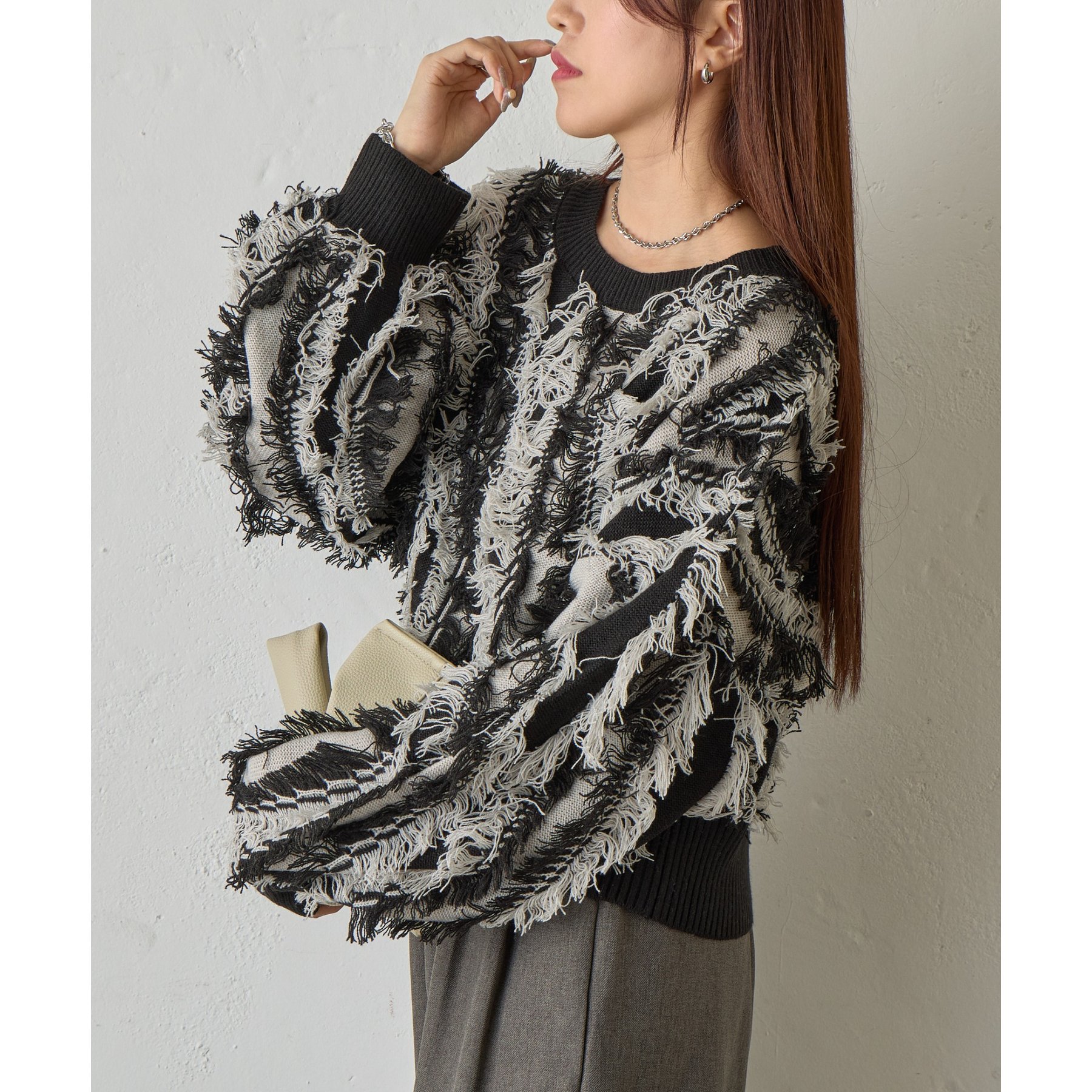 バイカラーのフリンジとウェーブデザインがポイントのニットプルオーバーです。