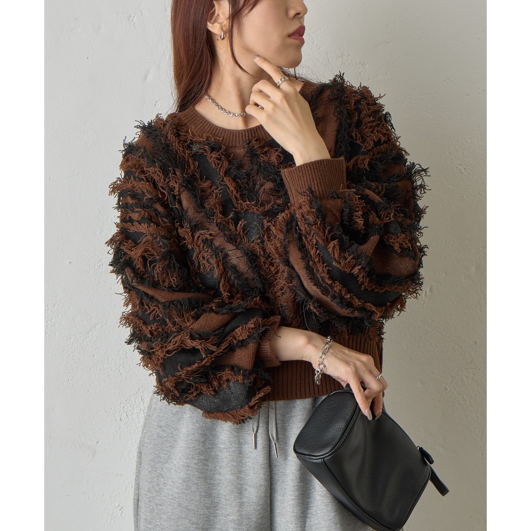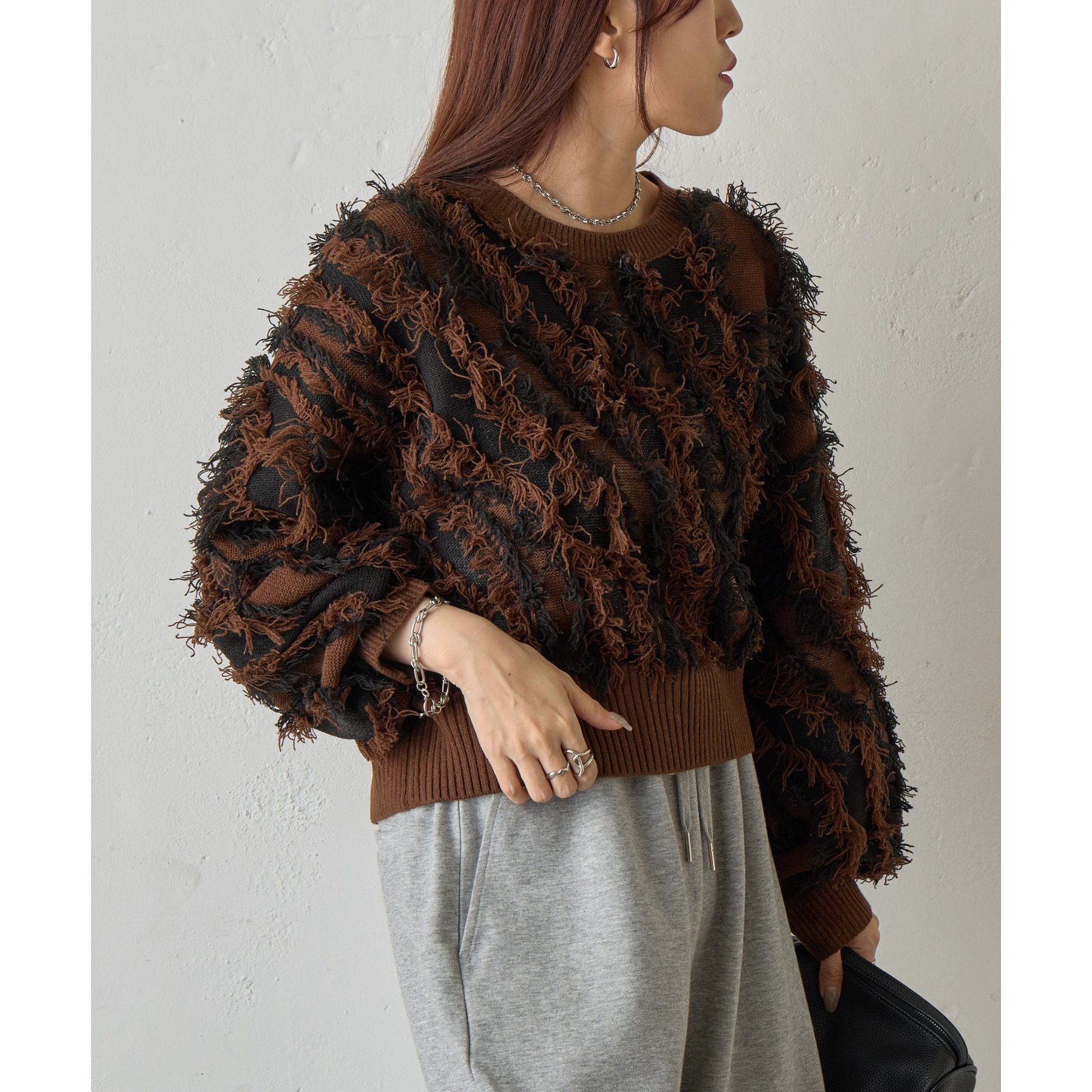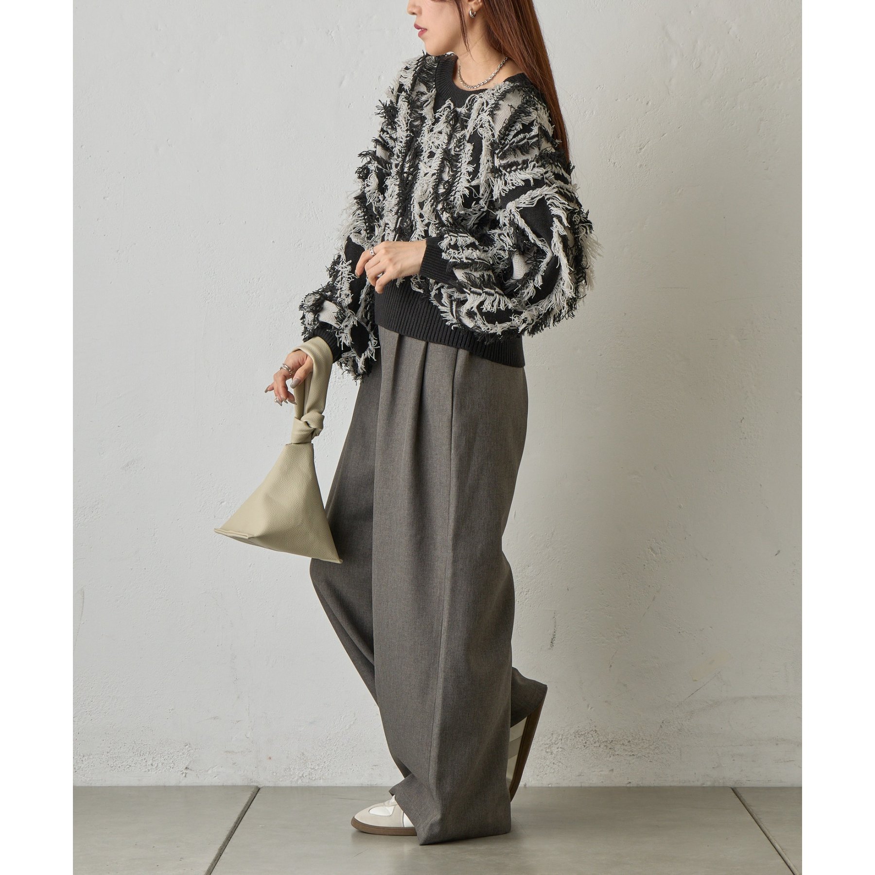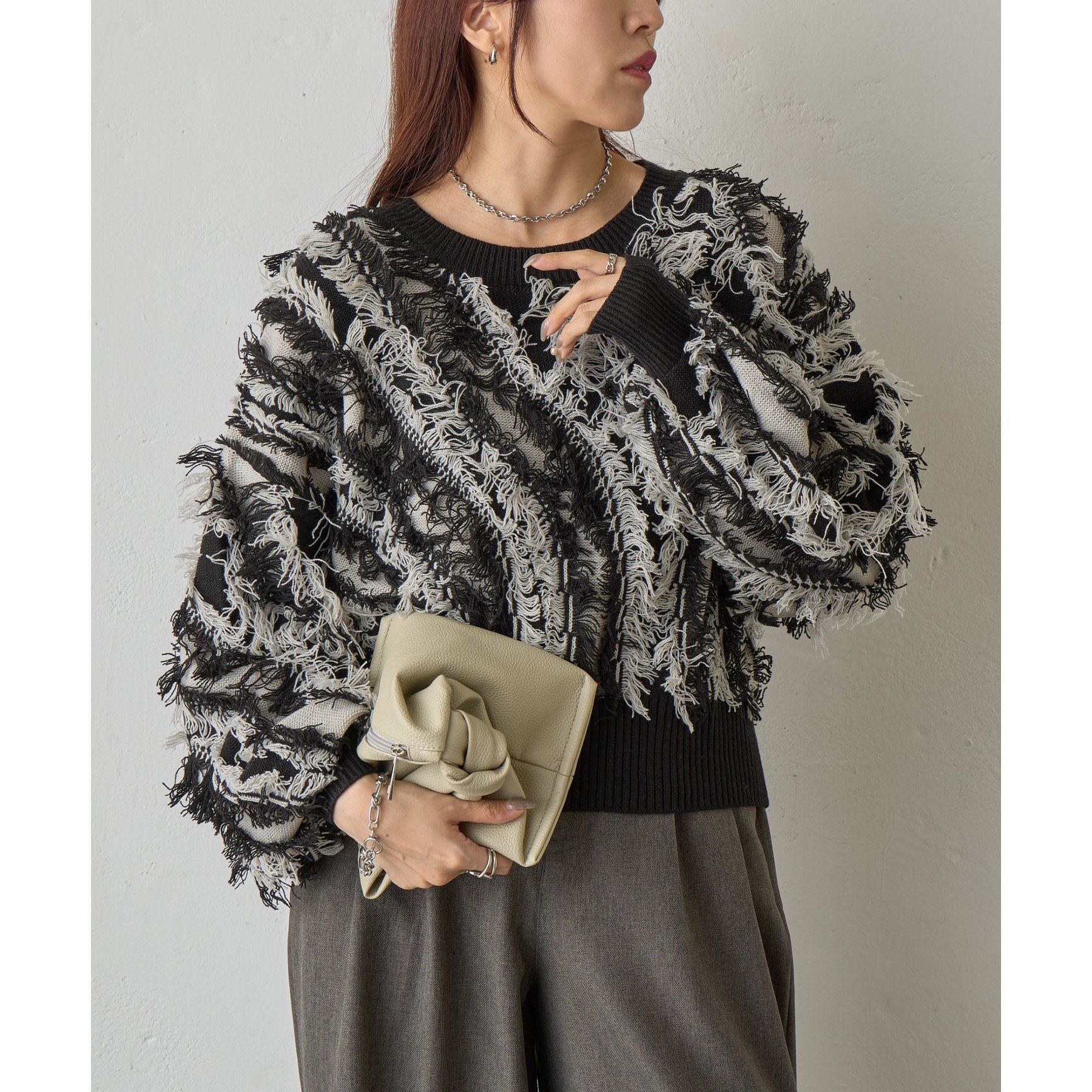 バイカラーのフリンジとウェーブデザインがポイントのニットプルオーバーです。