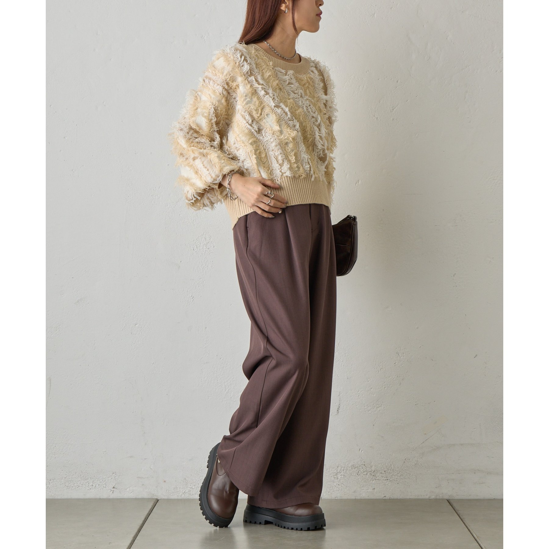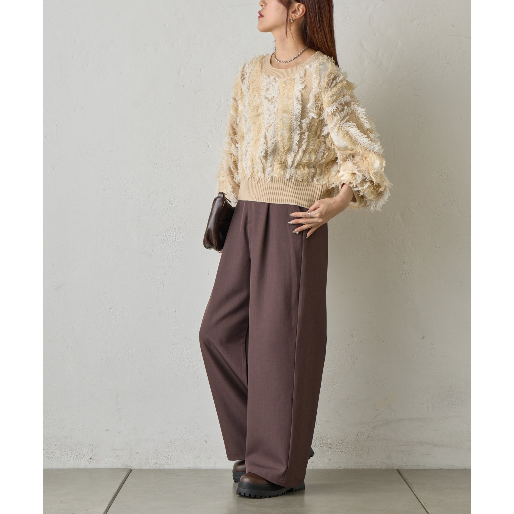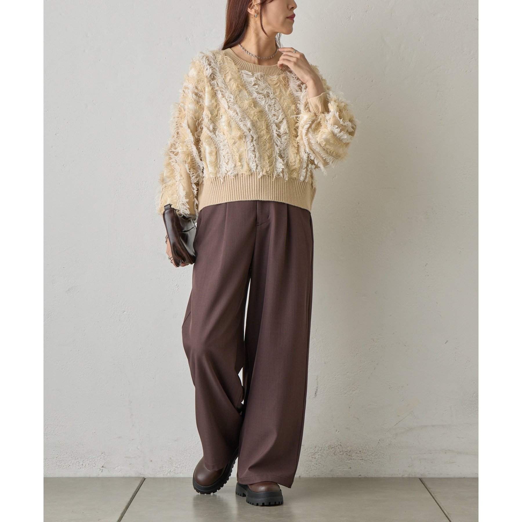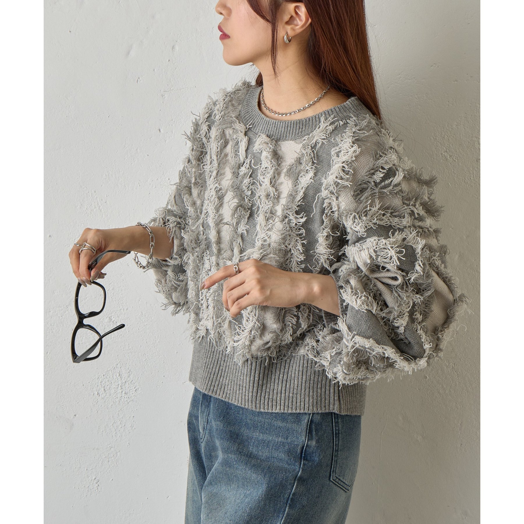 フリンジデザインで顔周りが華やかになり1枚でコーデが決まるアイテムです。