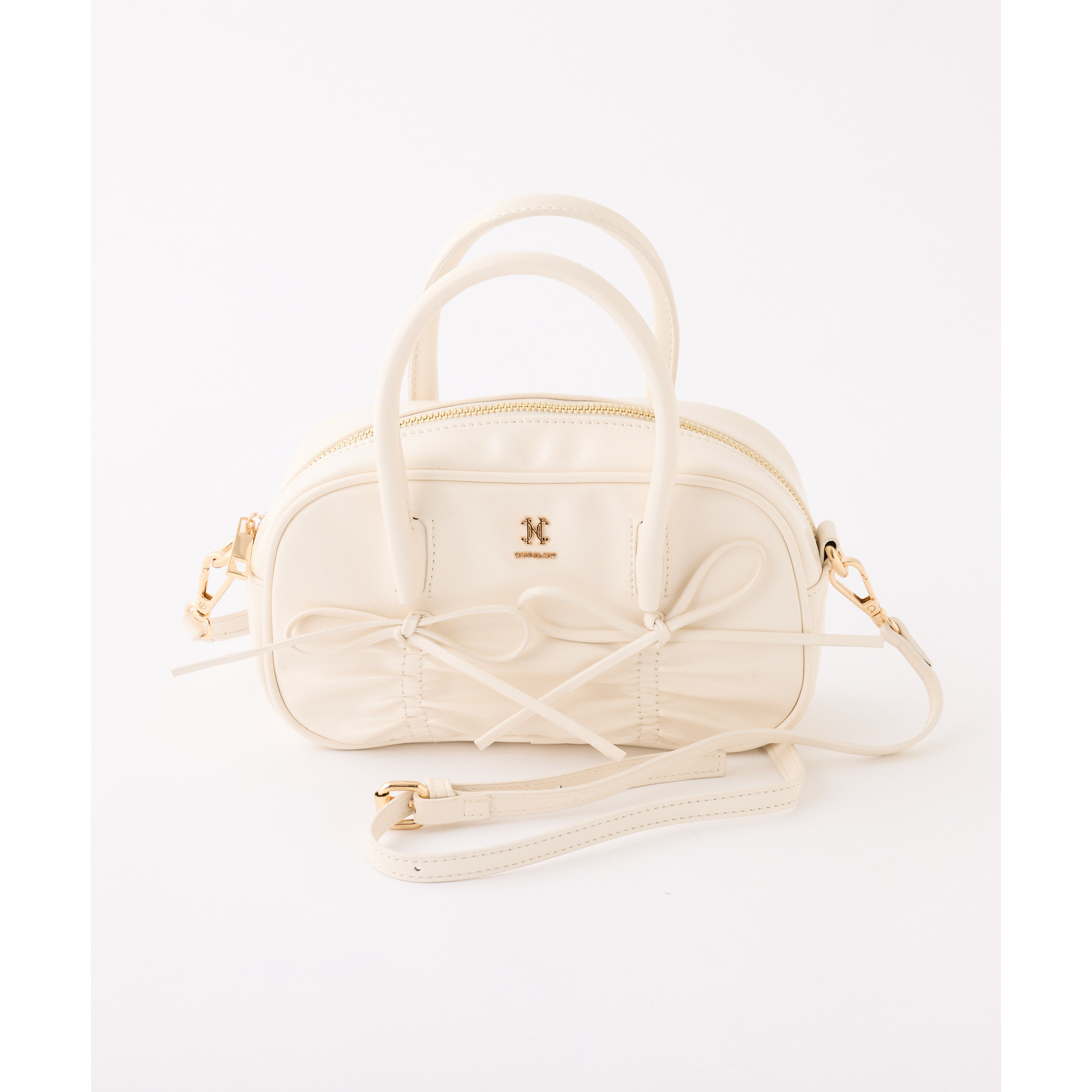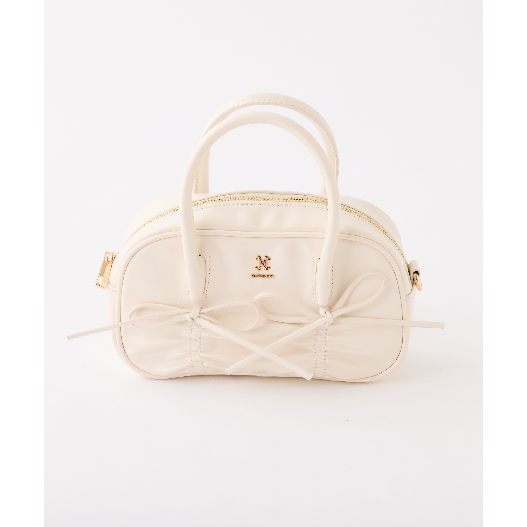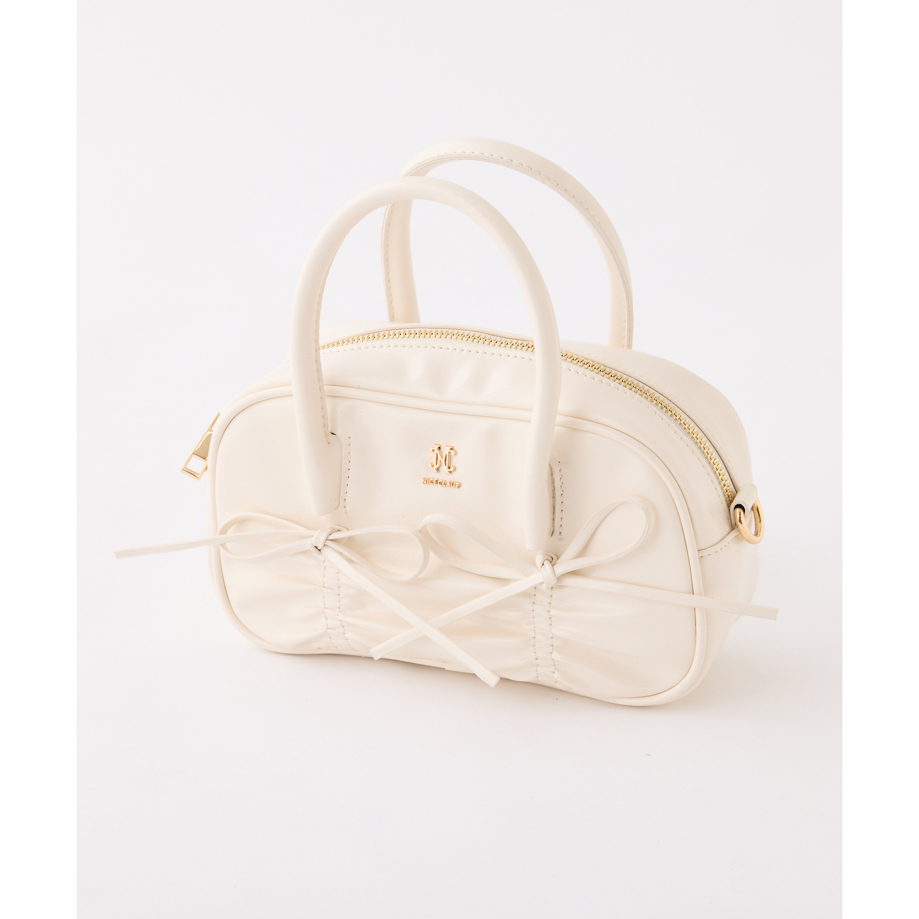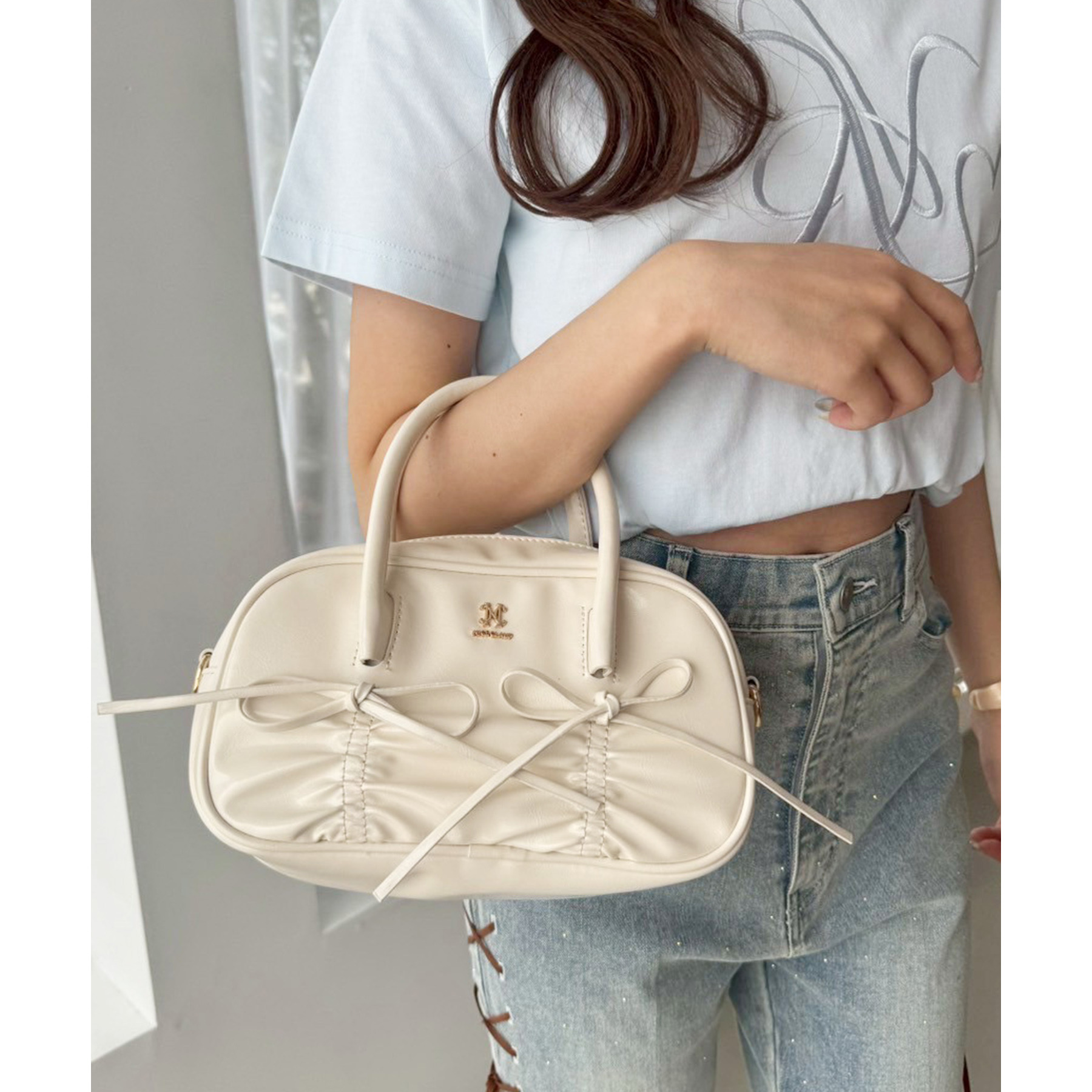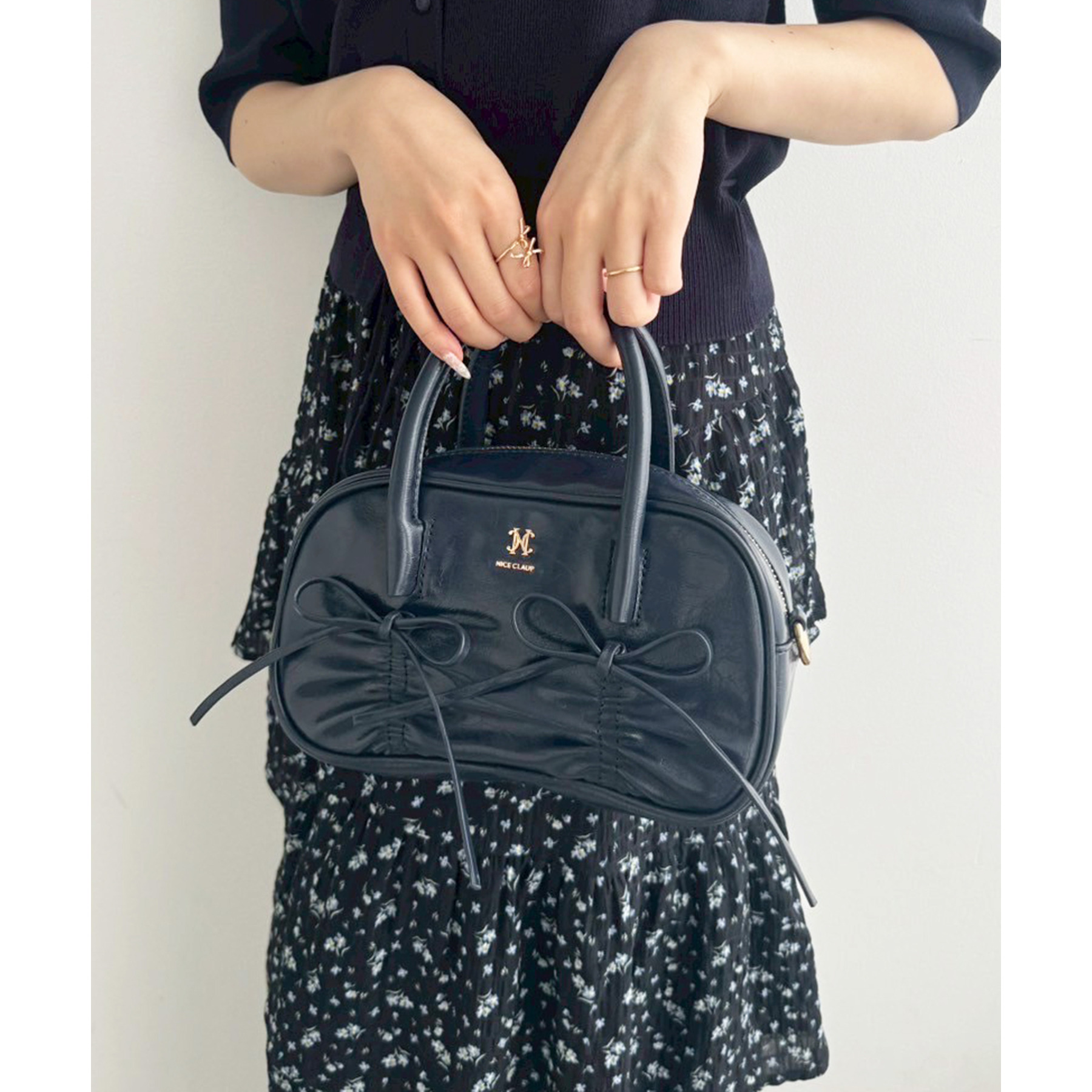フロントにあしらわれたドロストデザインの2つのリボンが可愛さを引き立てるミニバッグ。