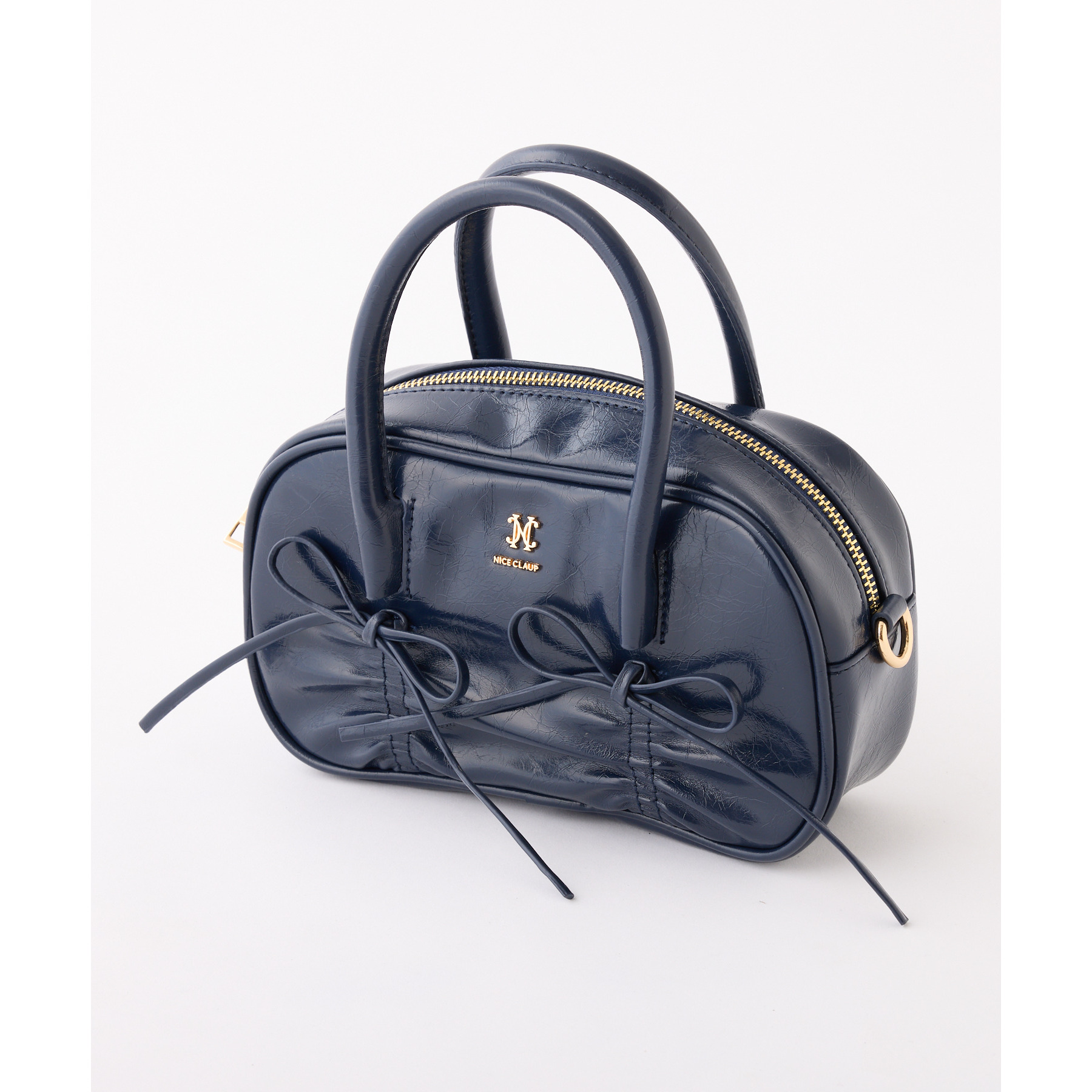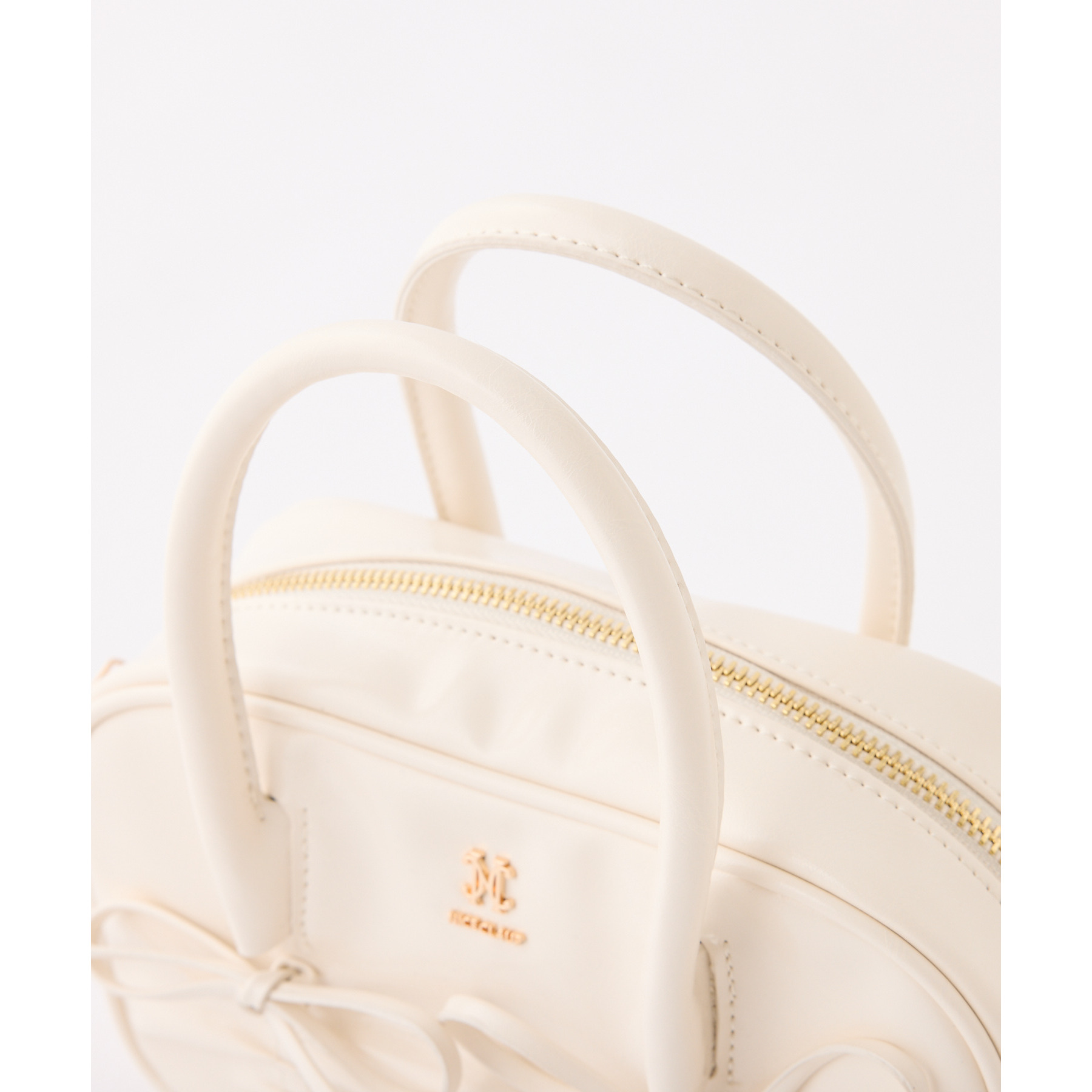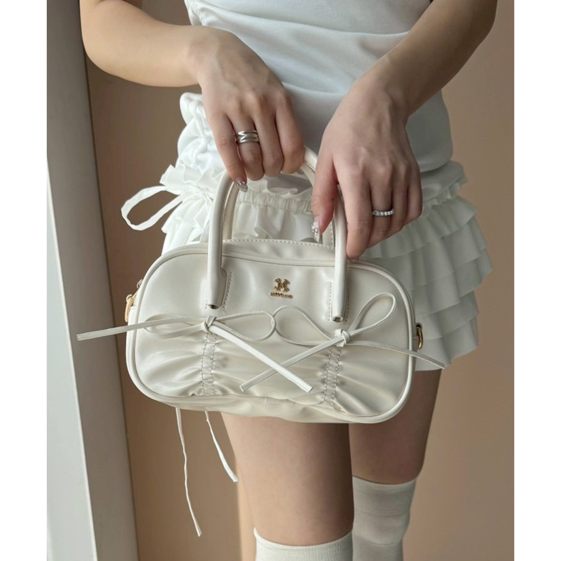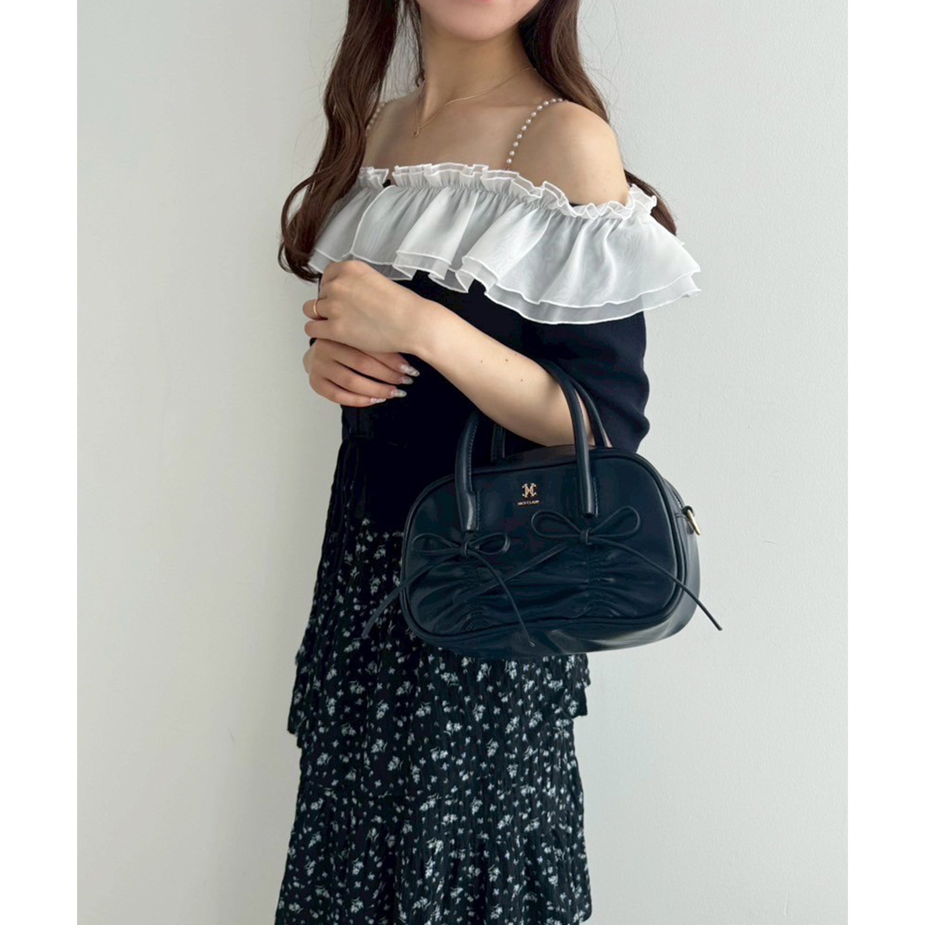 フロントにあしらわれたドロストデザインの2つのリボンが可愛さを引き立てるミニバッグ。