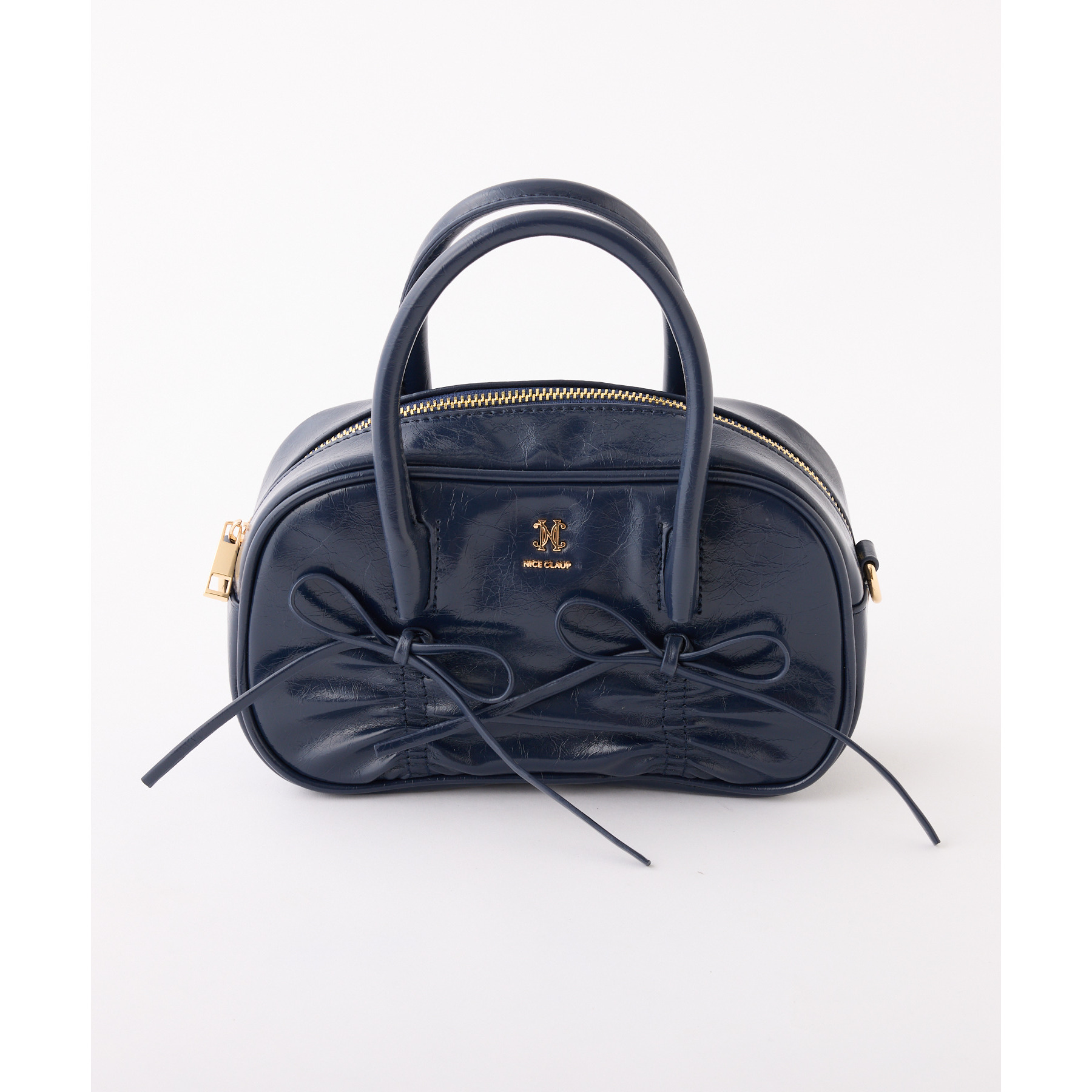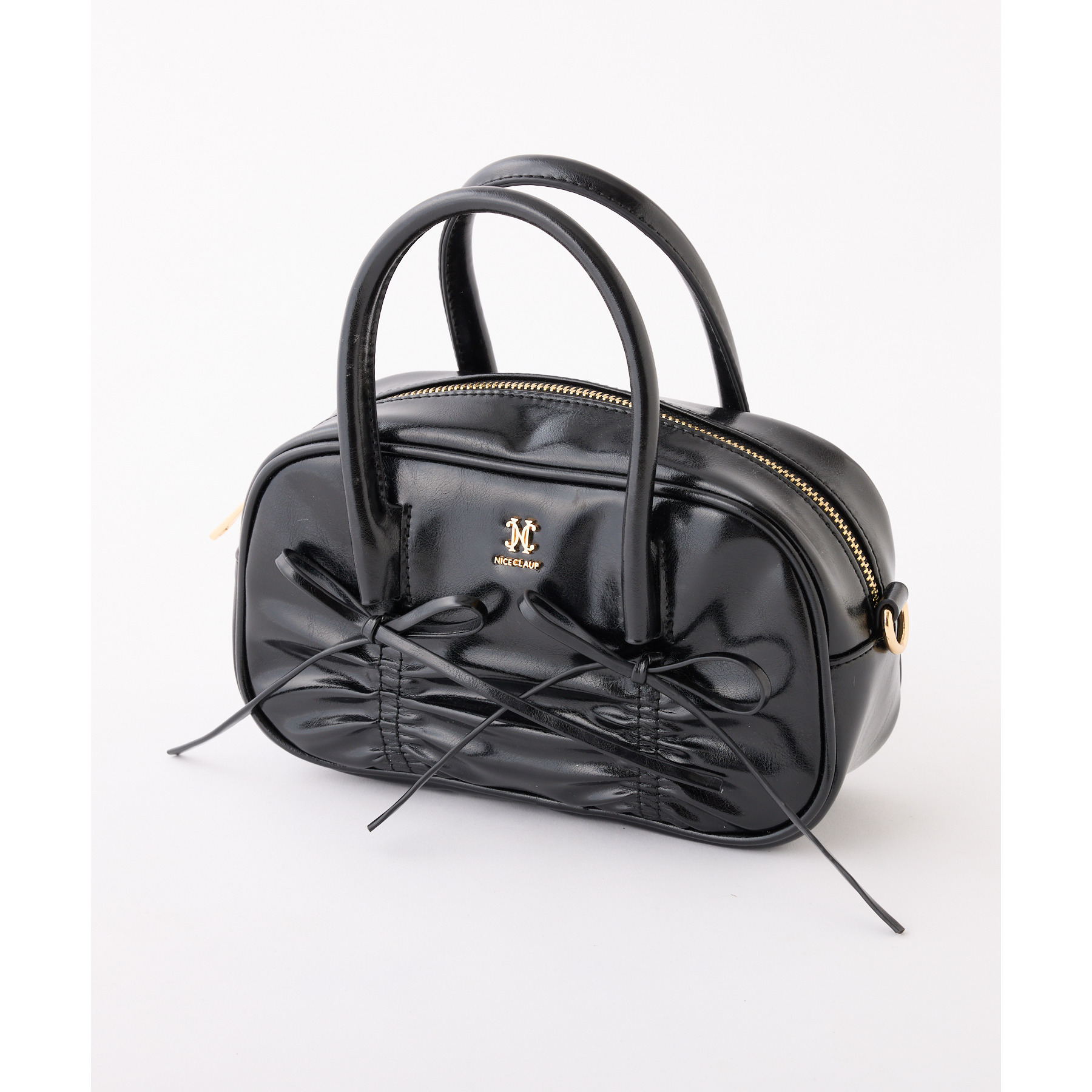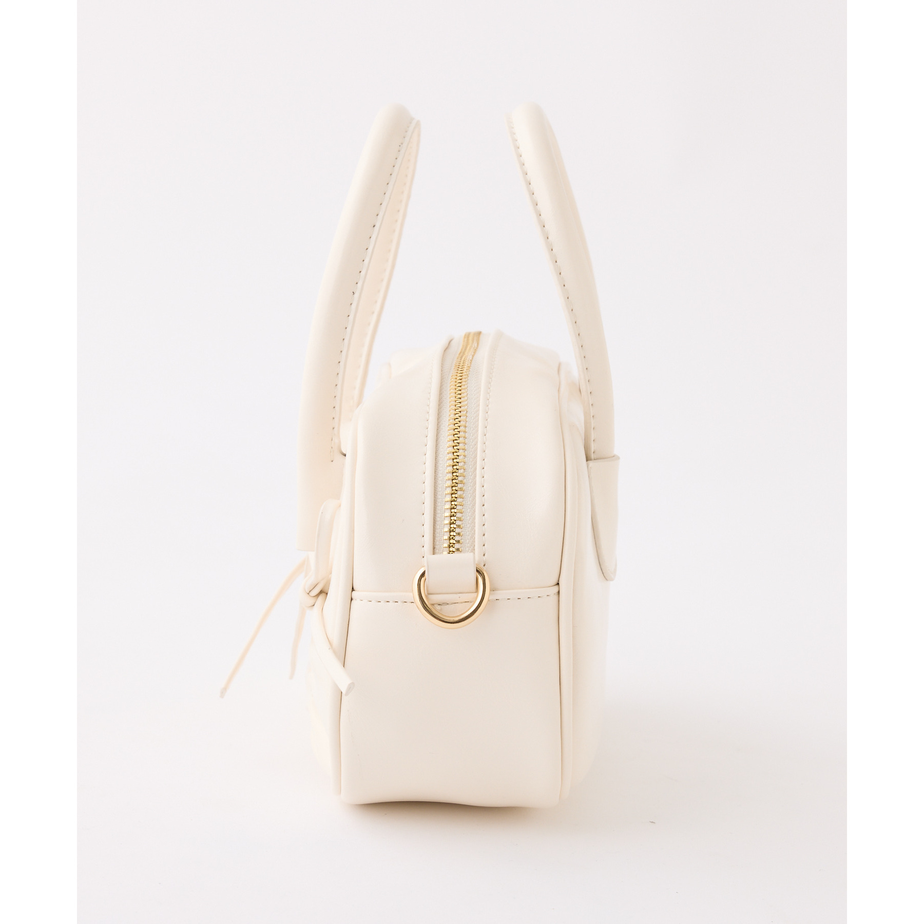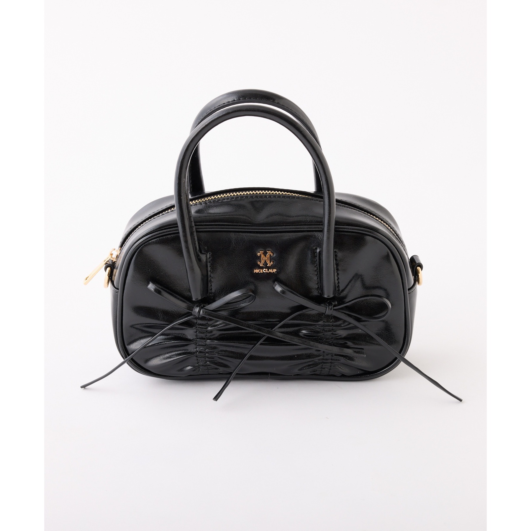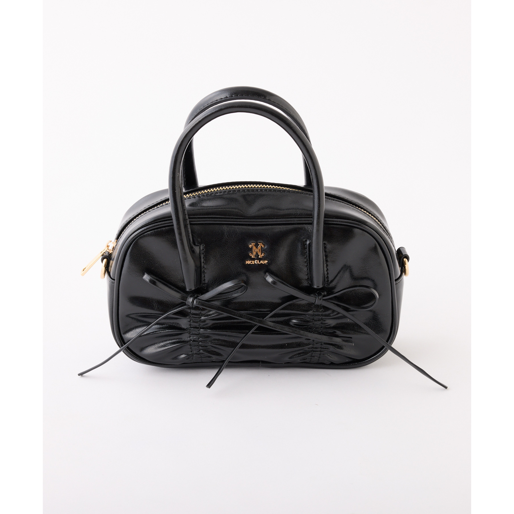 フロントにあしらわれたドロストデザインの2つのリボンが可愛さを引き立てるミニバッグ。