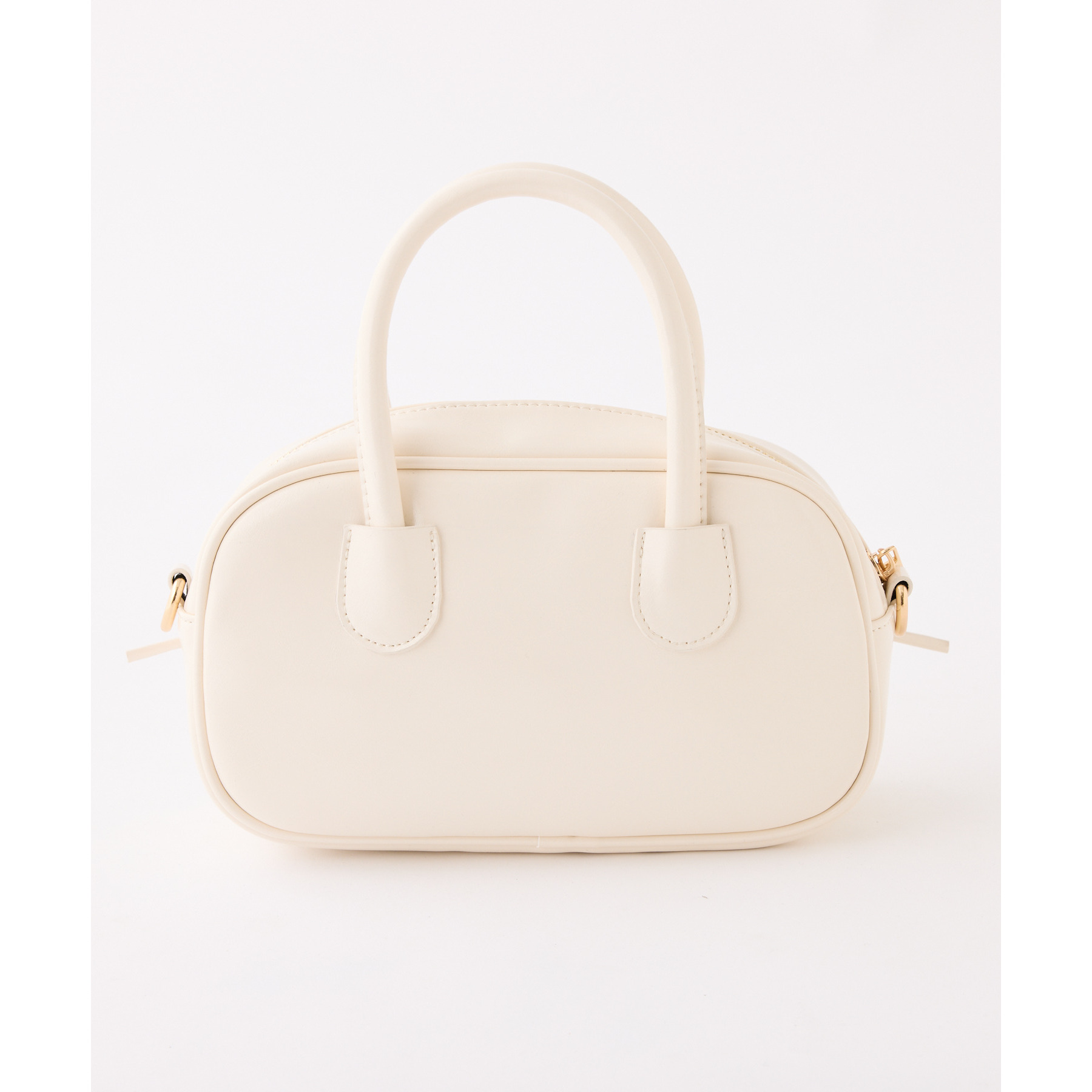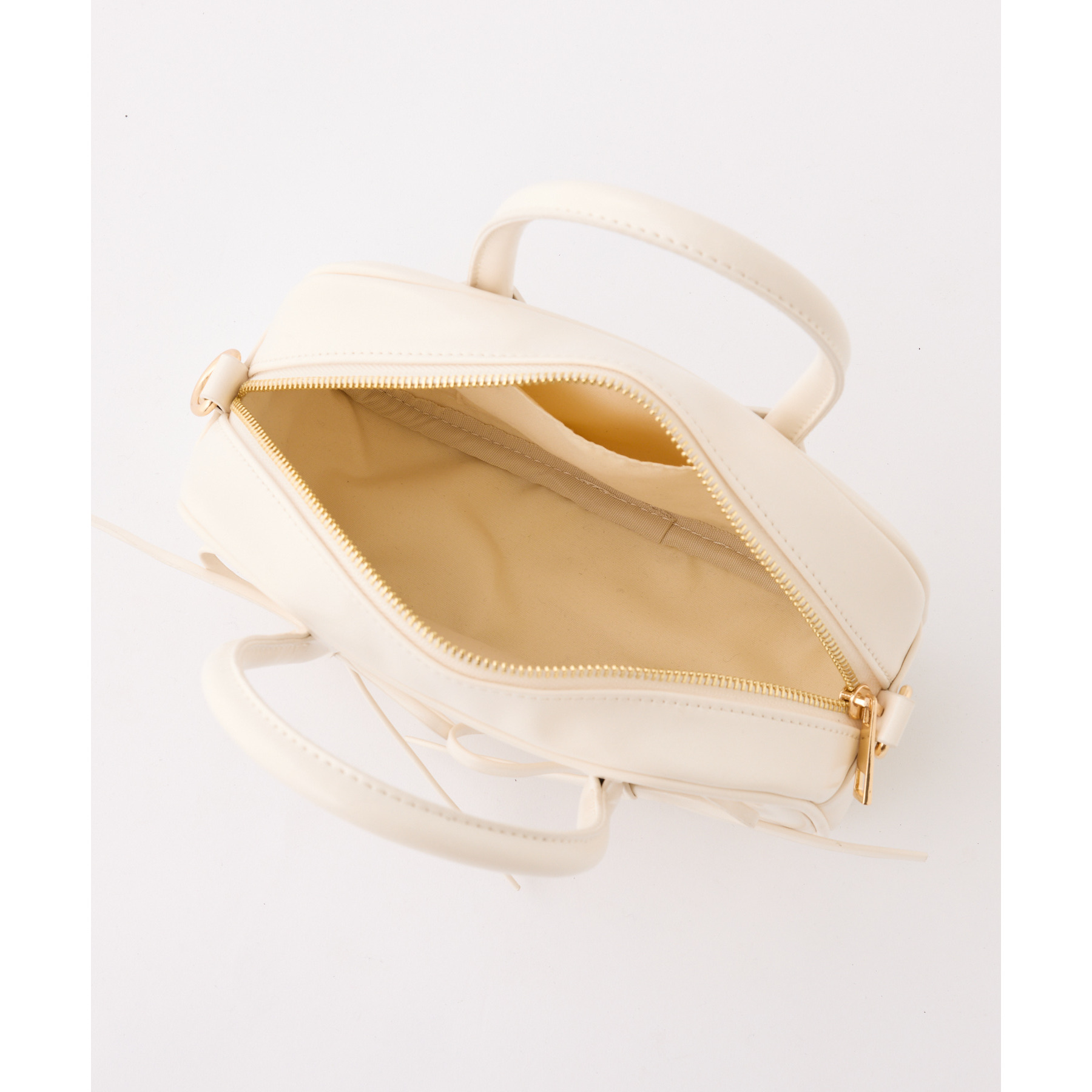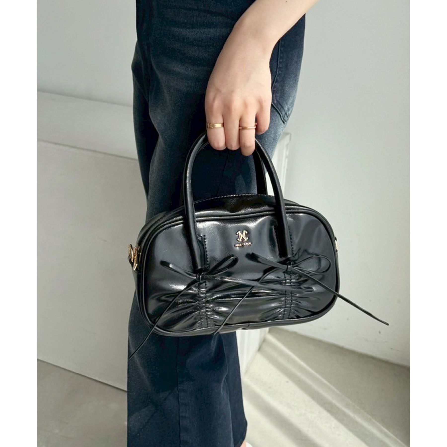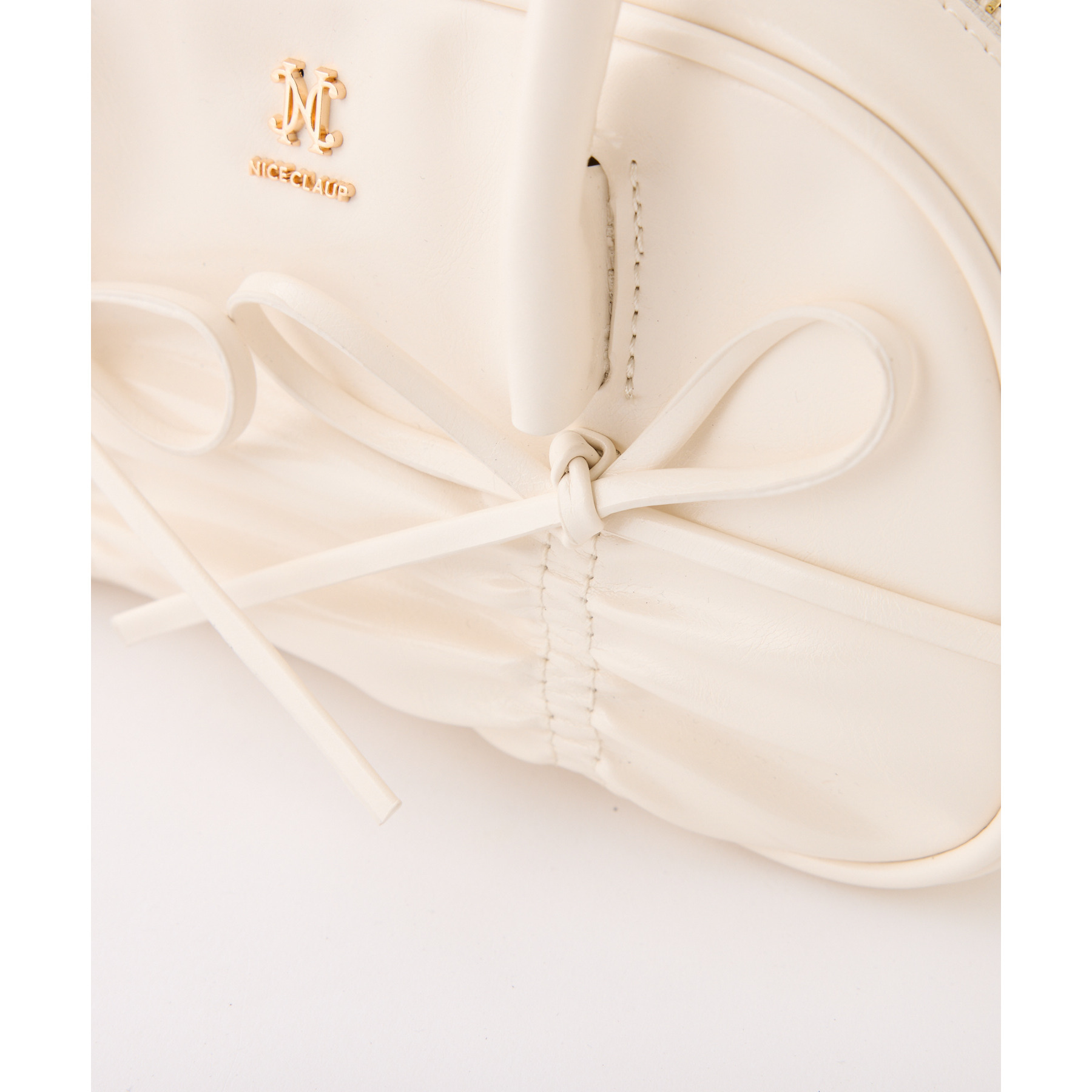 フロントにあしらわれたドロストデザインの2つのリボンが可愛さを引き立てるミニバッグ。